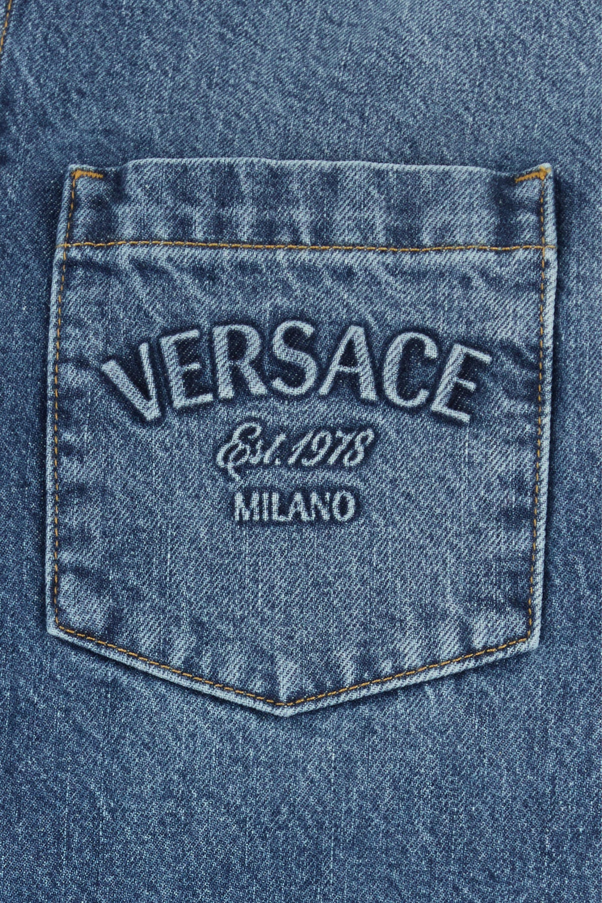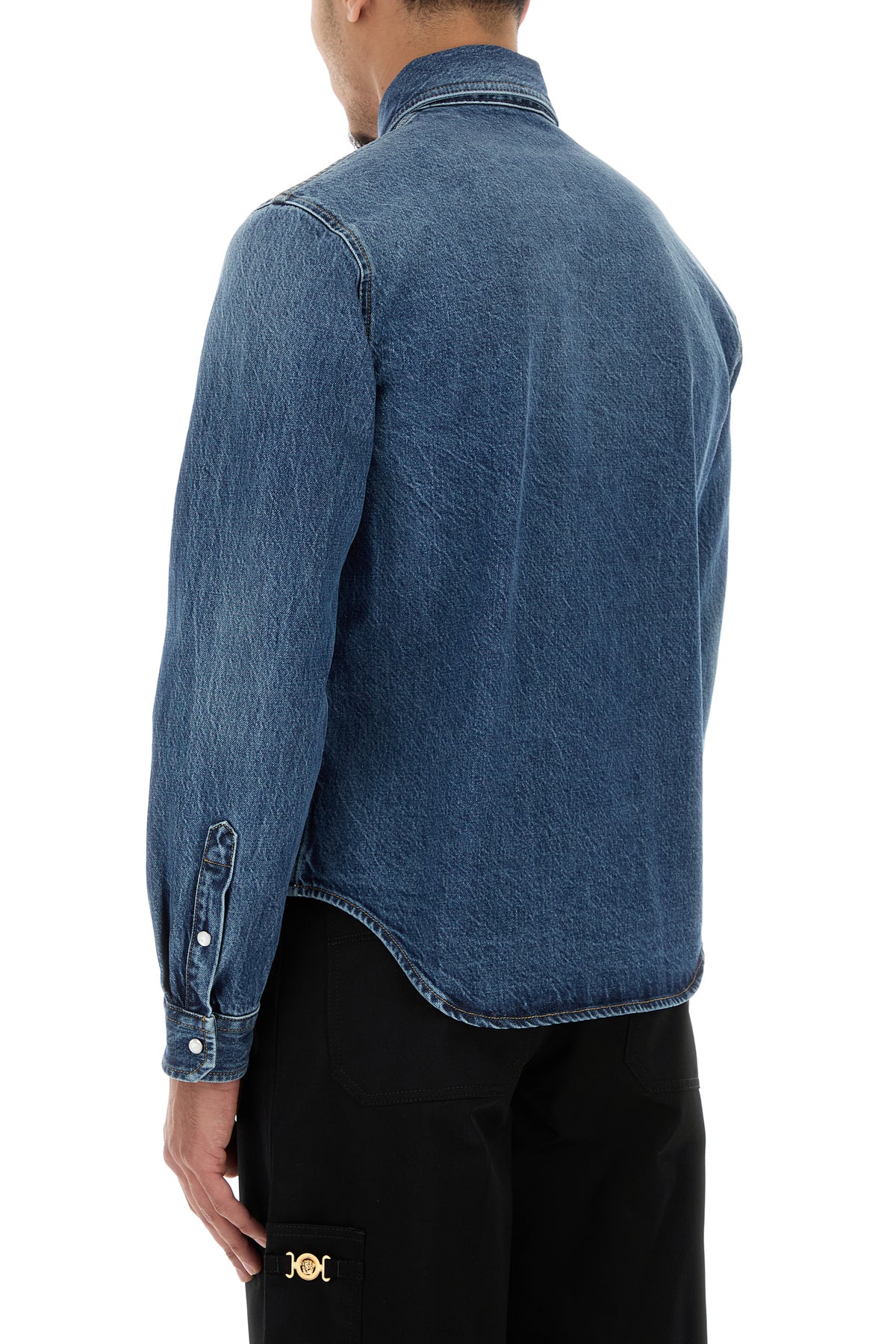 Shirt realized in stonewashed pure cotton denim characterized by Versace Milano Stamp motif in relief on the chest.