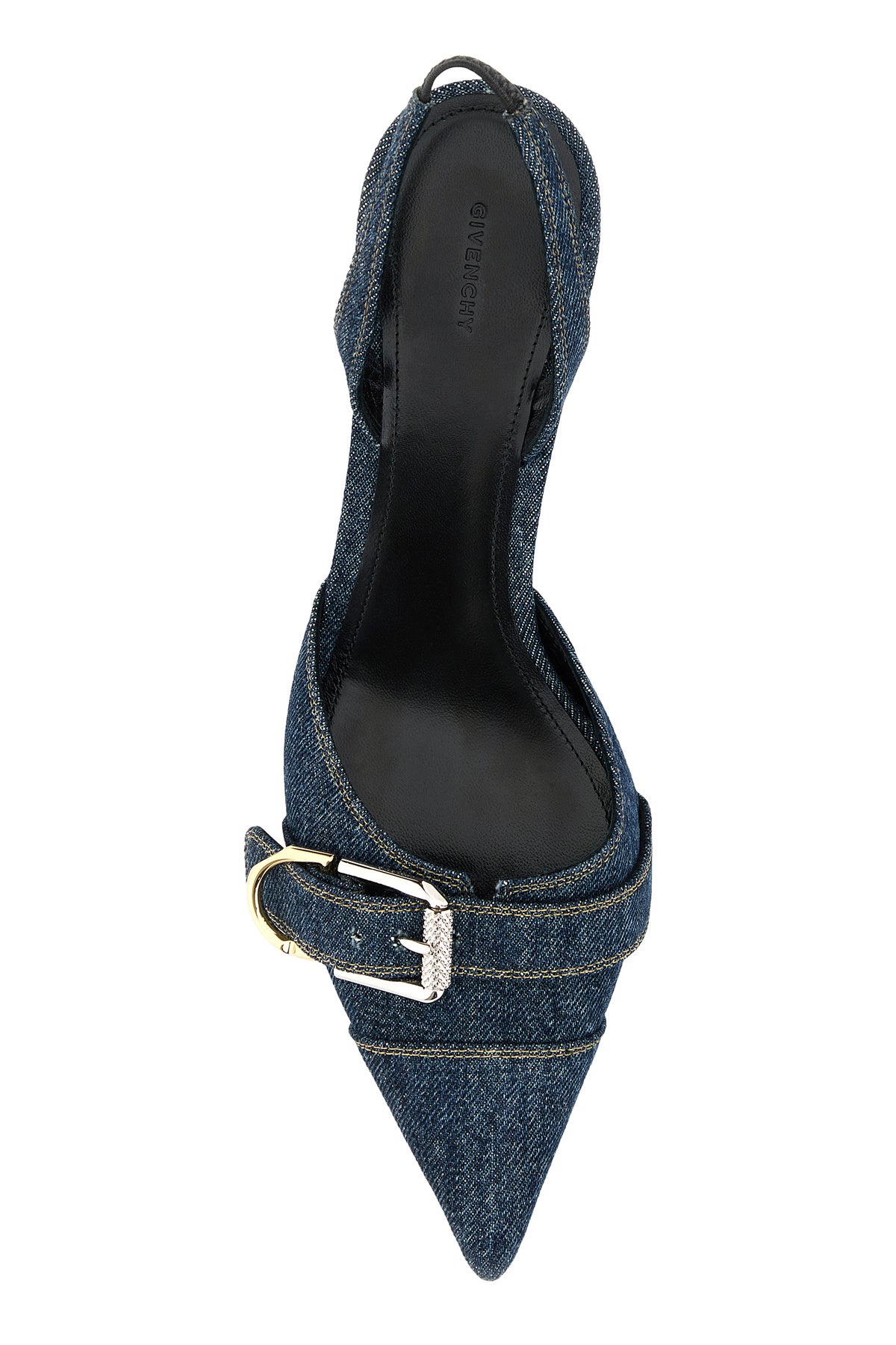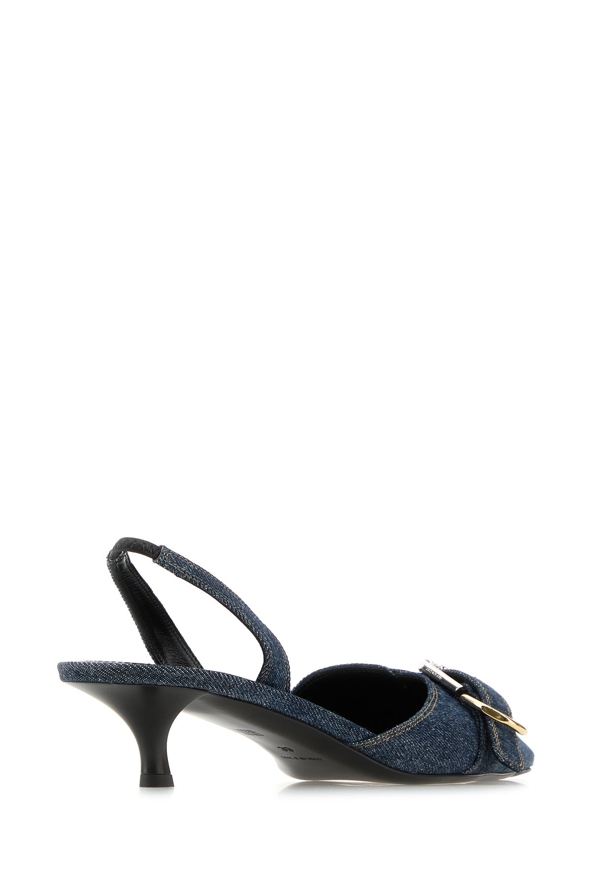 Slingback realized in denim enriched by decorative strap with metal buckles at the front.