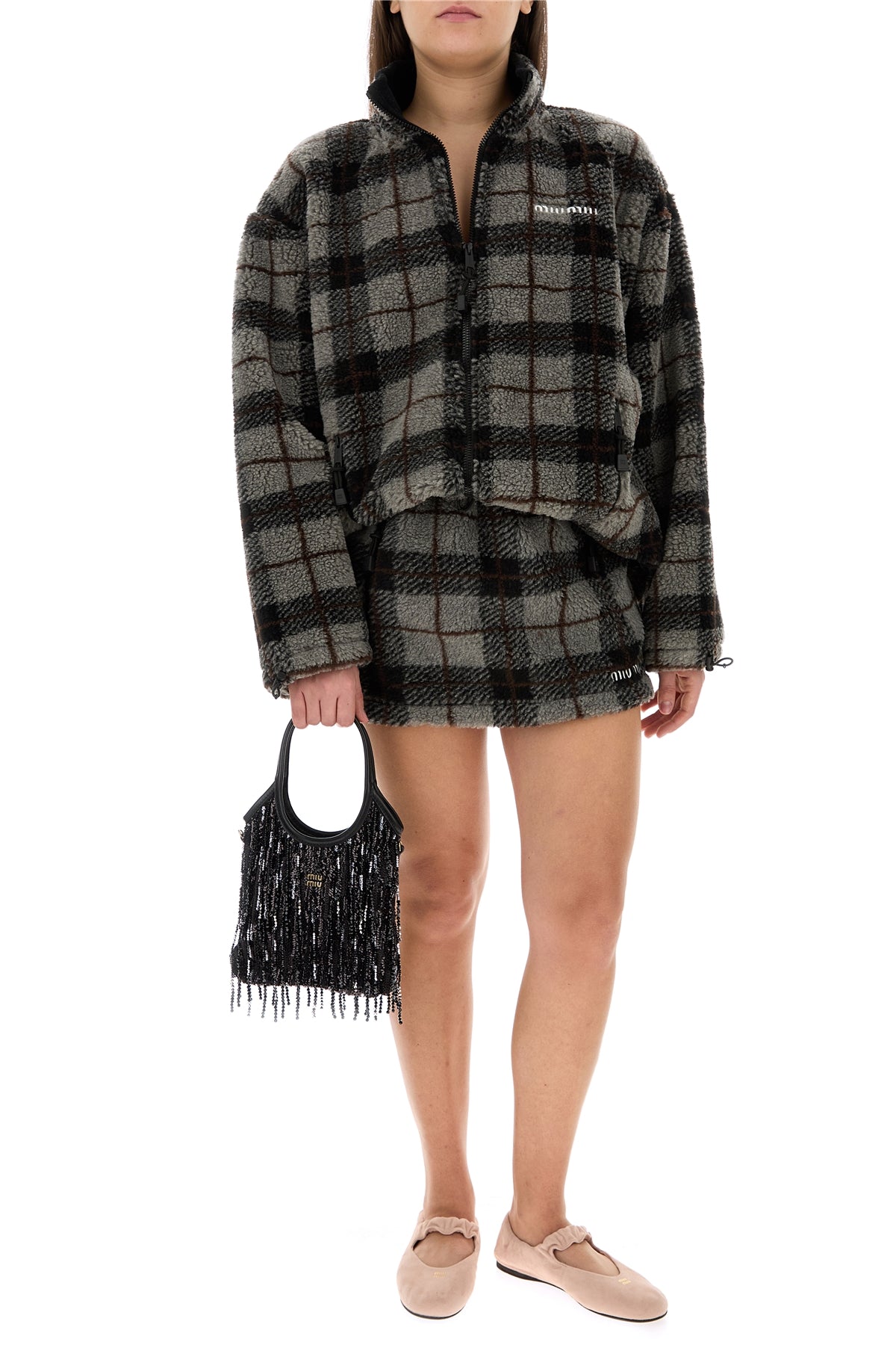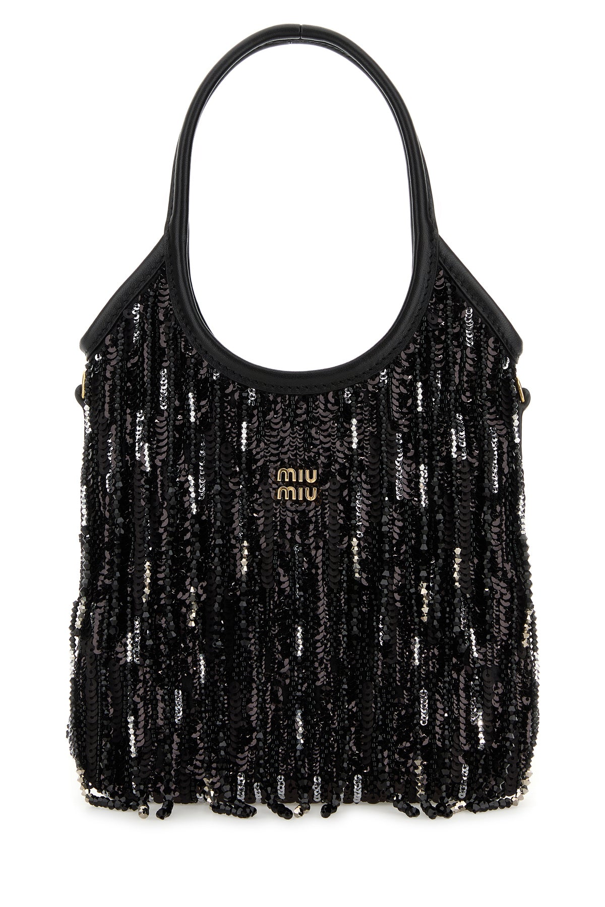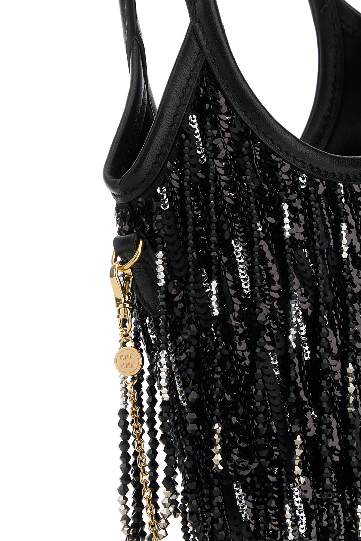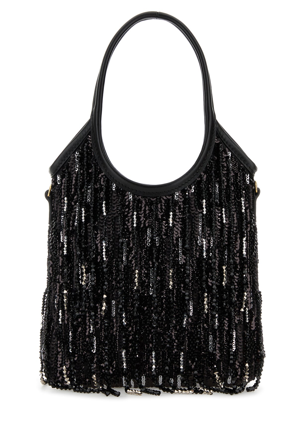 Handbag realized in fabric entirely covered by sequins and beads enriched by metal lettering logo at the front.