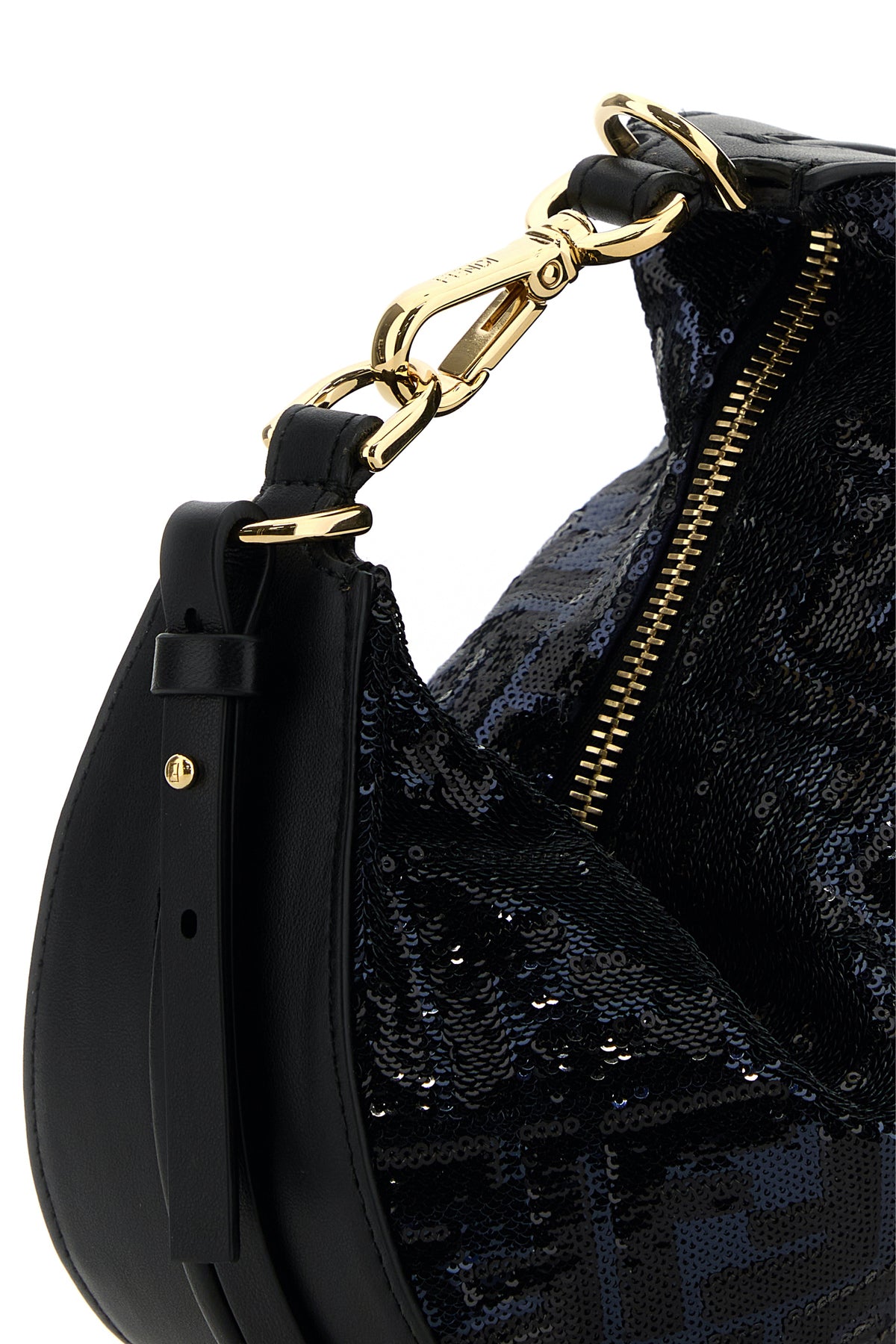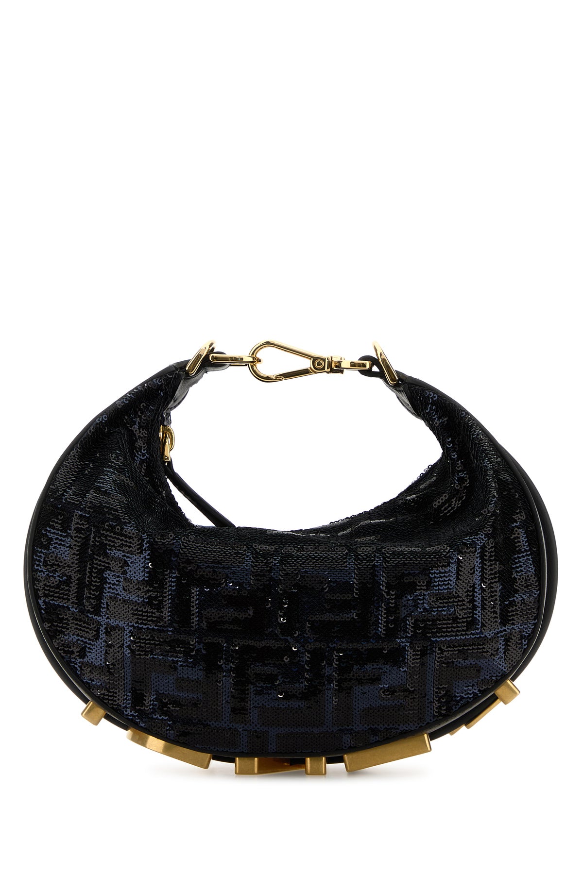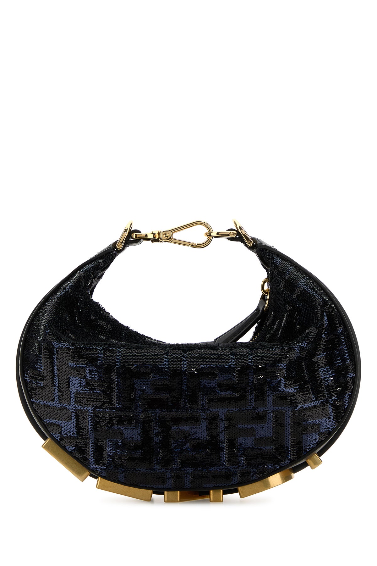 Handbag realized in fabric entirely covered by sequins characterized by printed FF motif on the entire surface enriched by metal lettering logo on the hemline.