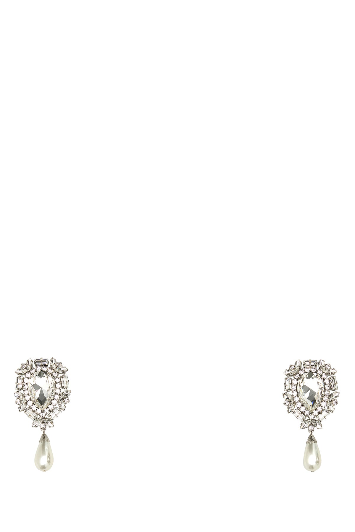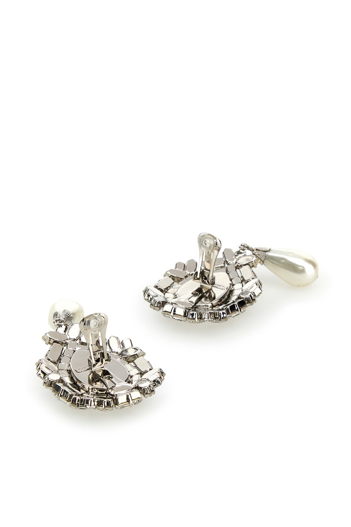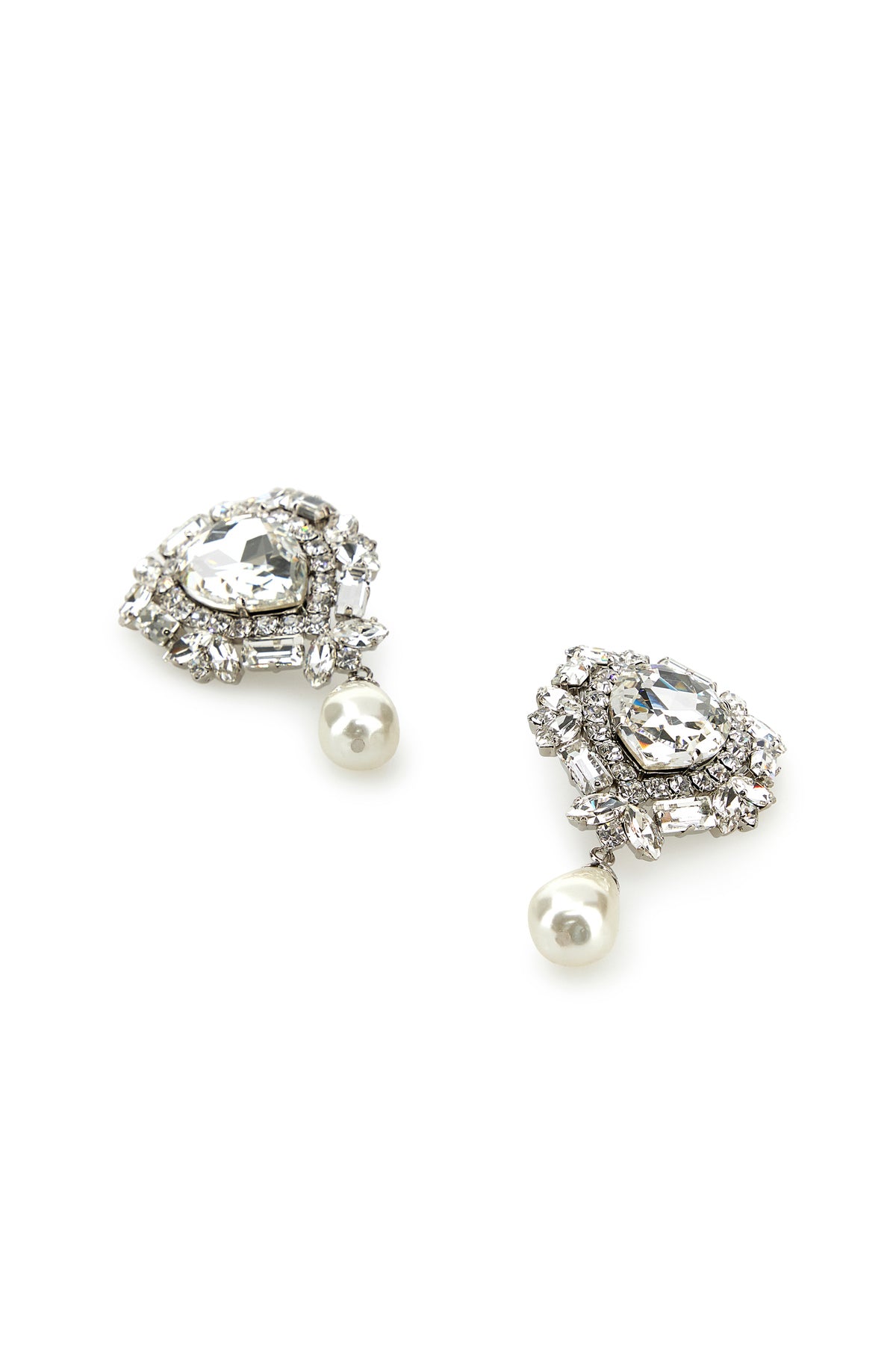 Pendant earrings realized in metal enriched by rhinestones on the entire surface and pearl charm.