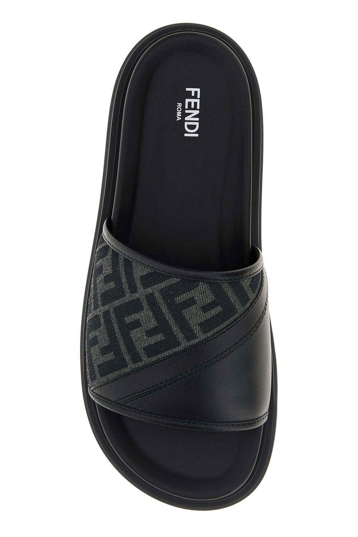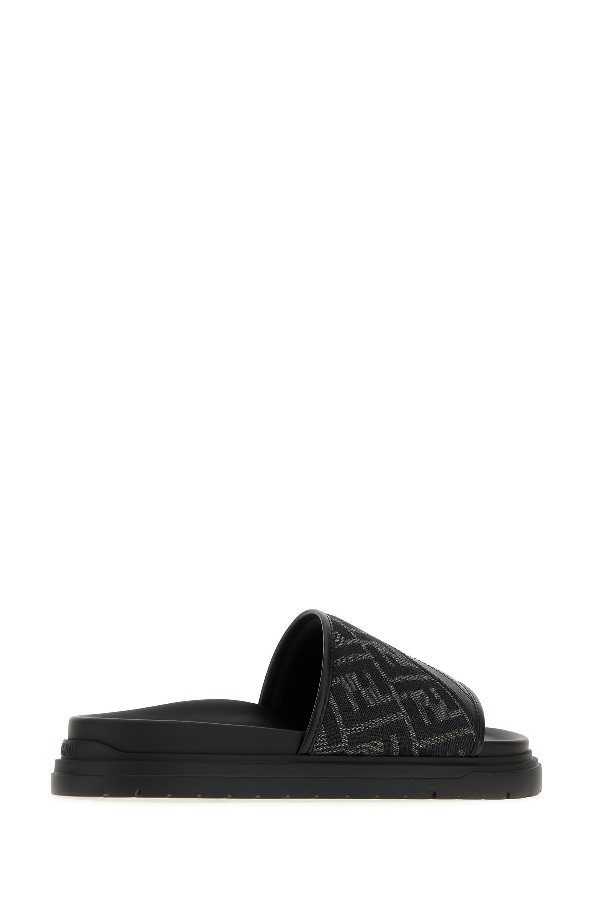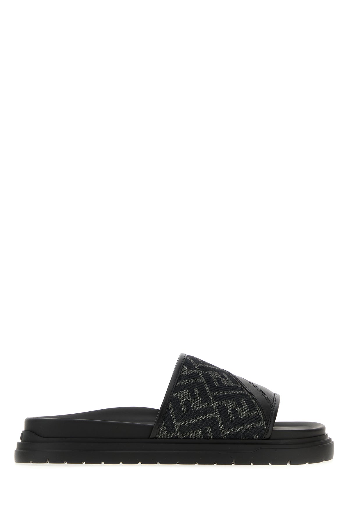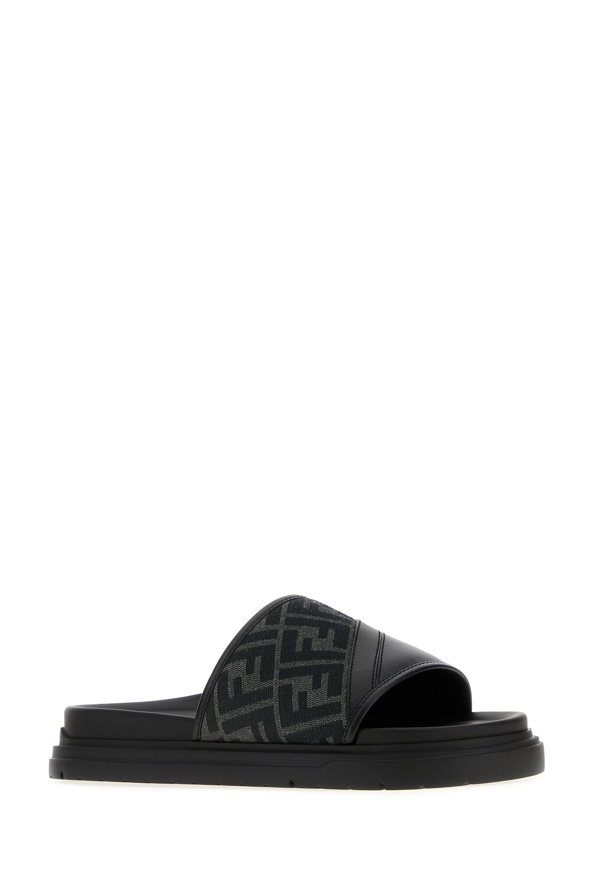 Slippers realized in canvas and smooth calf leather characterized by FF motif embroidery on the entire surface.