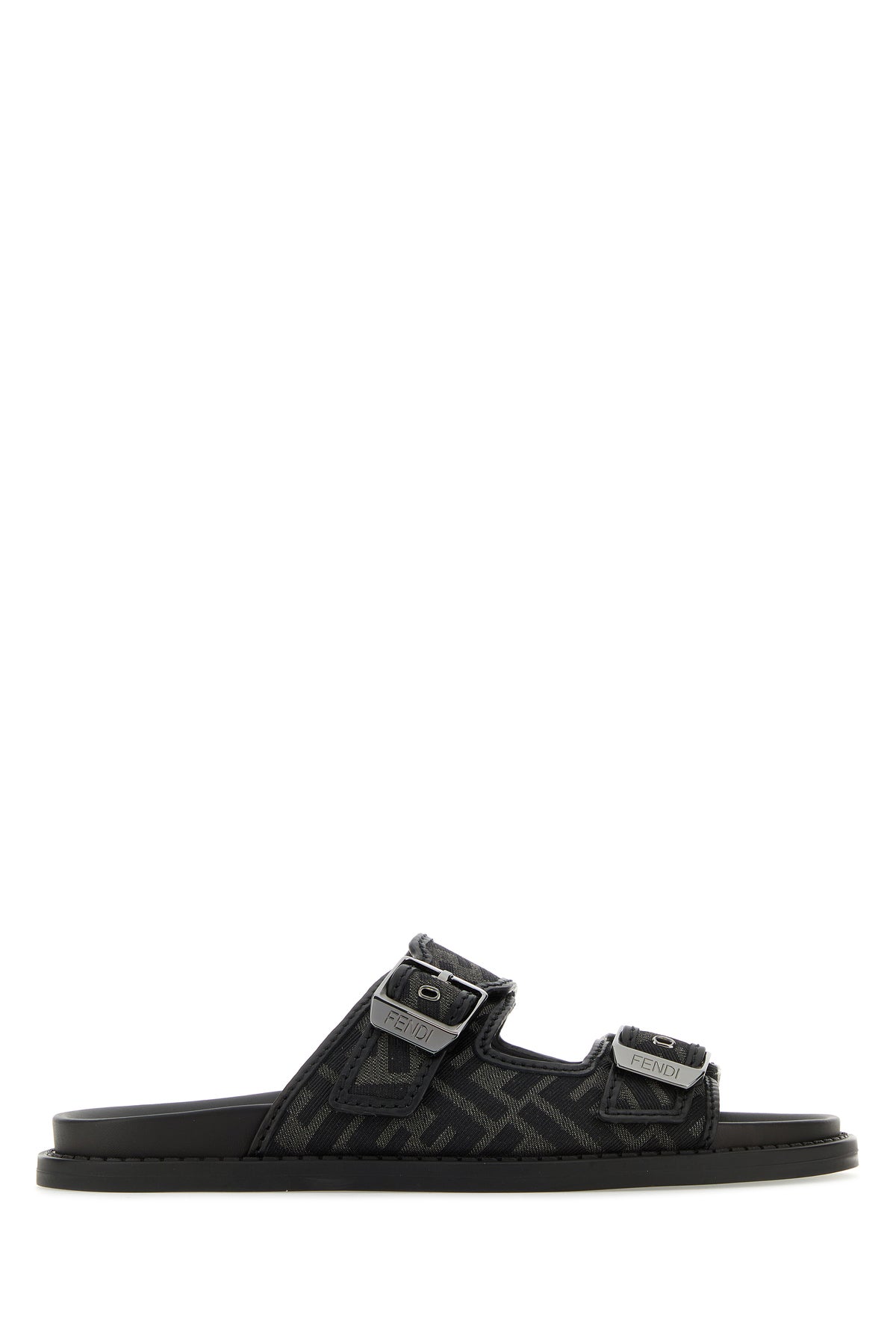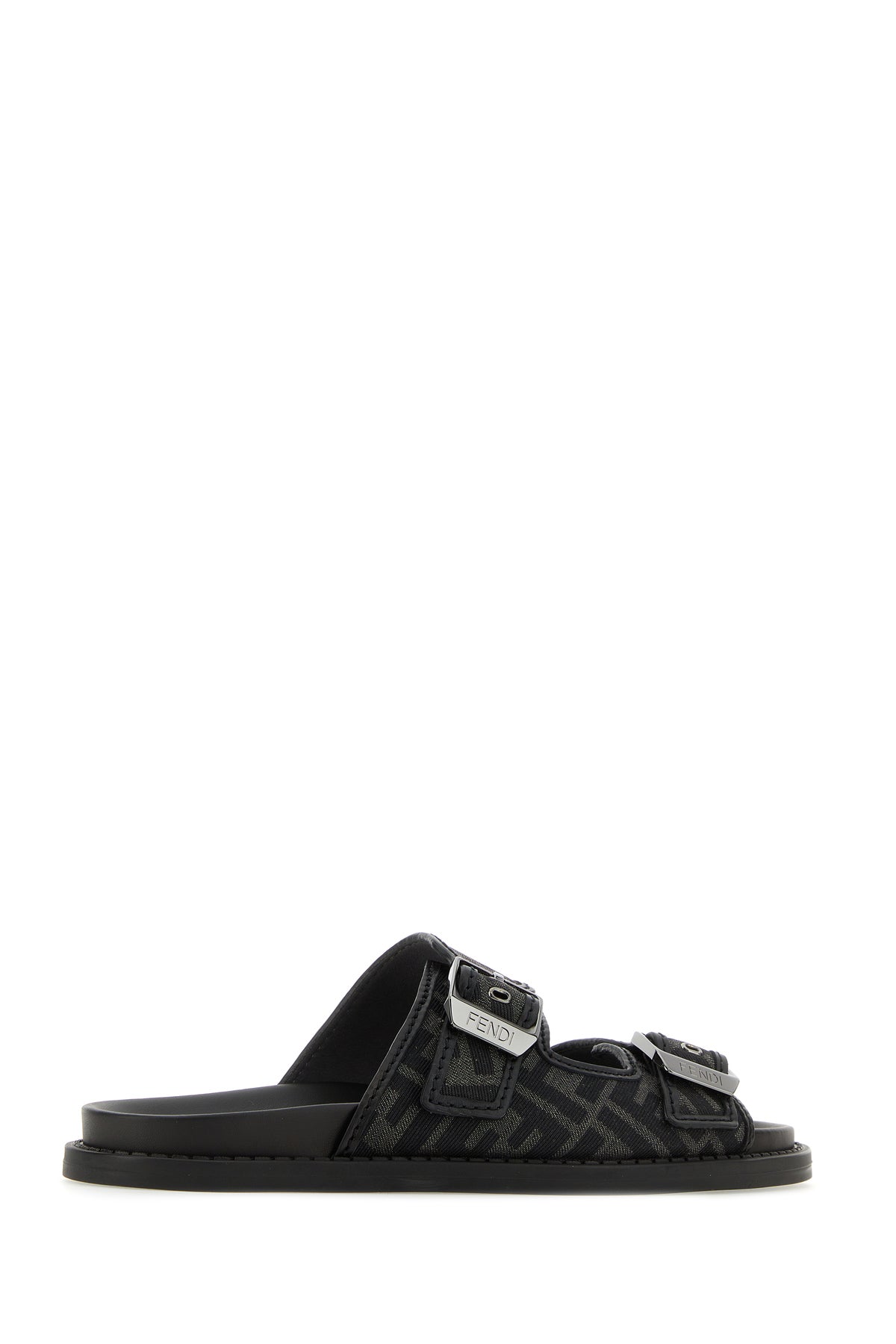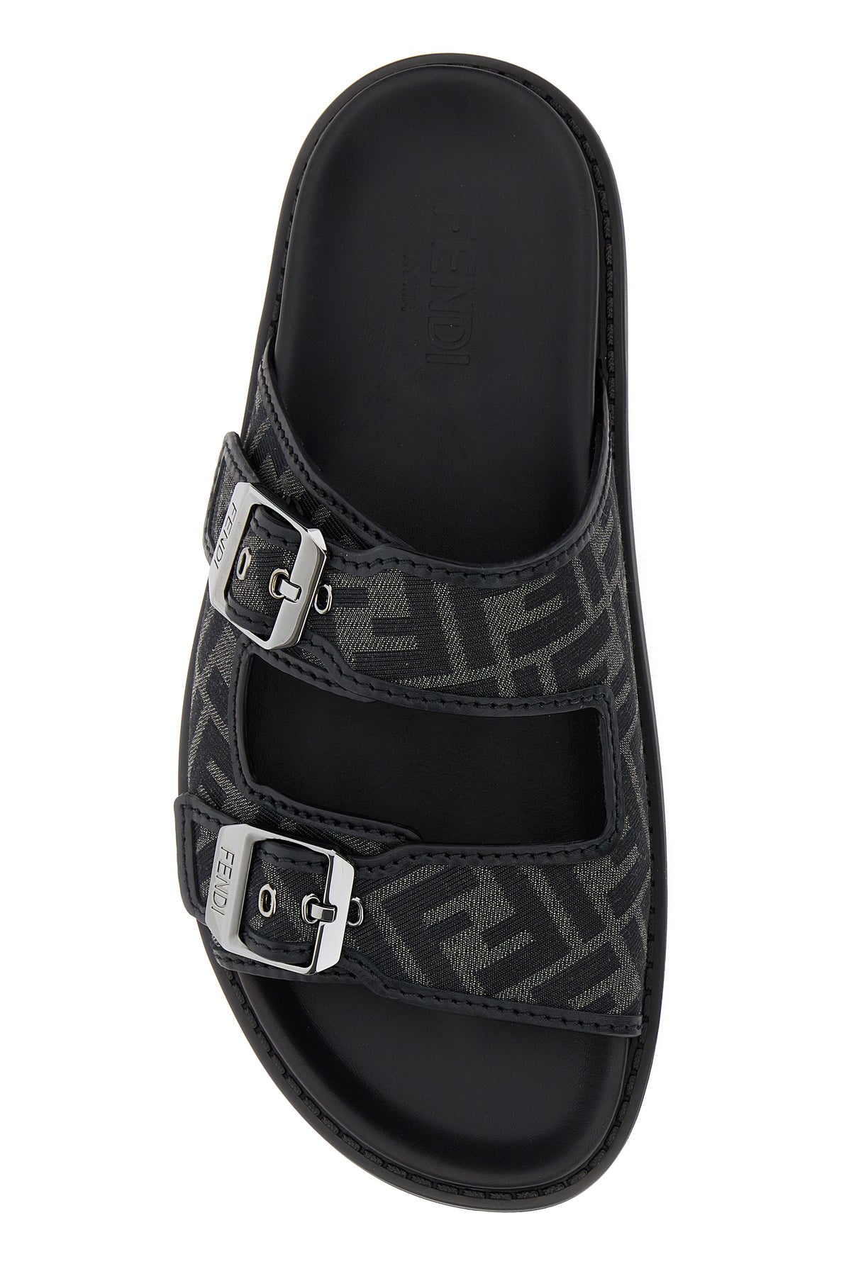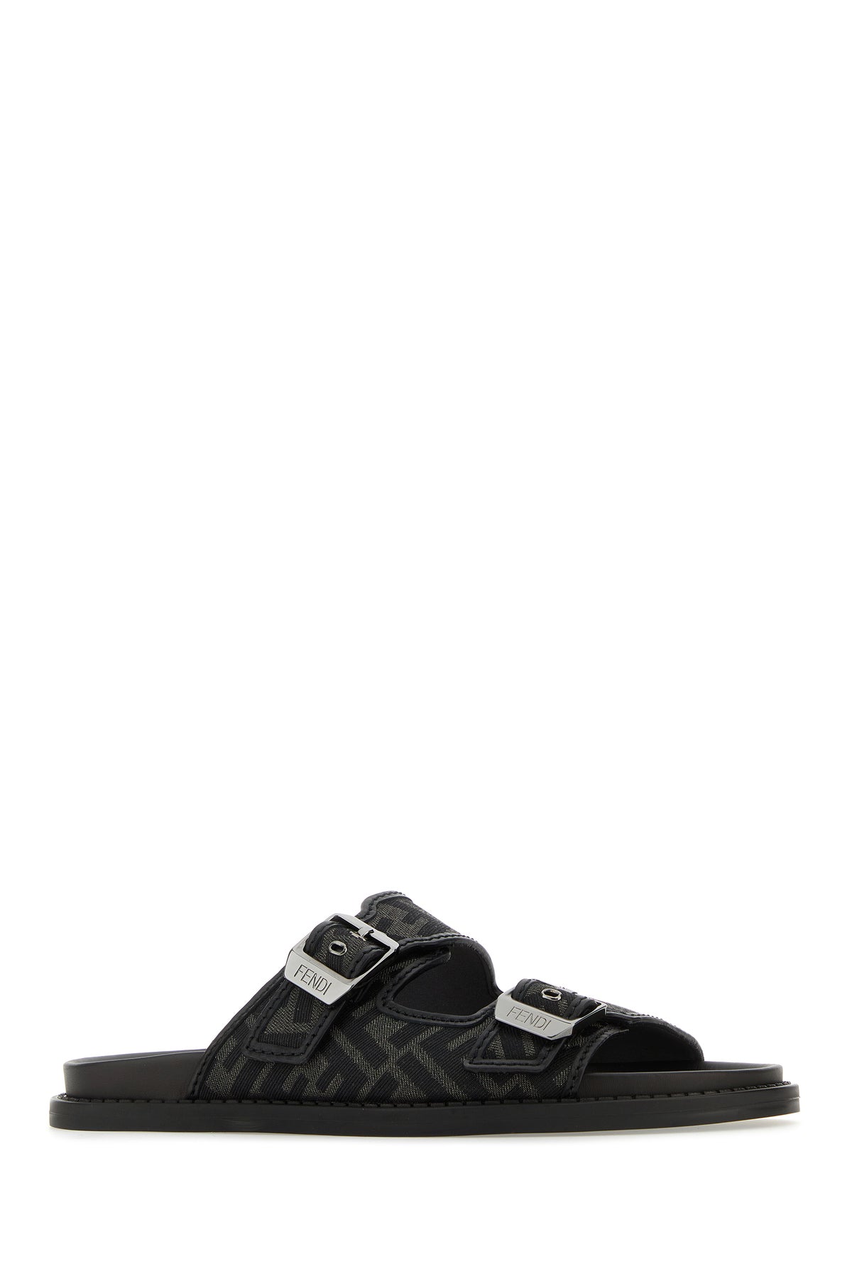 Slippers realized in canvas characterized by FF motif embroidery on the entire surface enriched by logoed metal buckles on the bands.