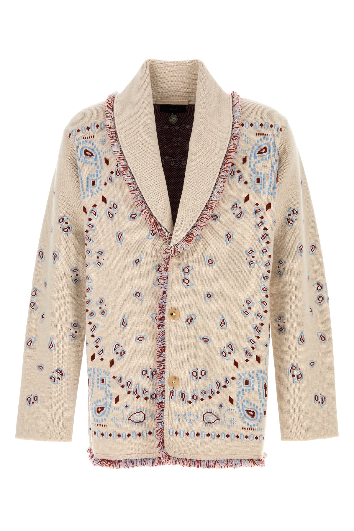 Cardigan realized in pure cashmere with fringed trimmings characterized by peculiar embroidery on the entire surface.