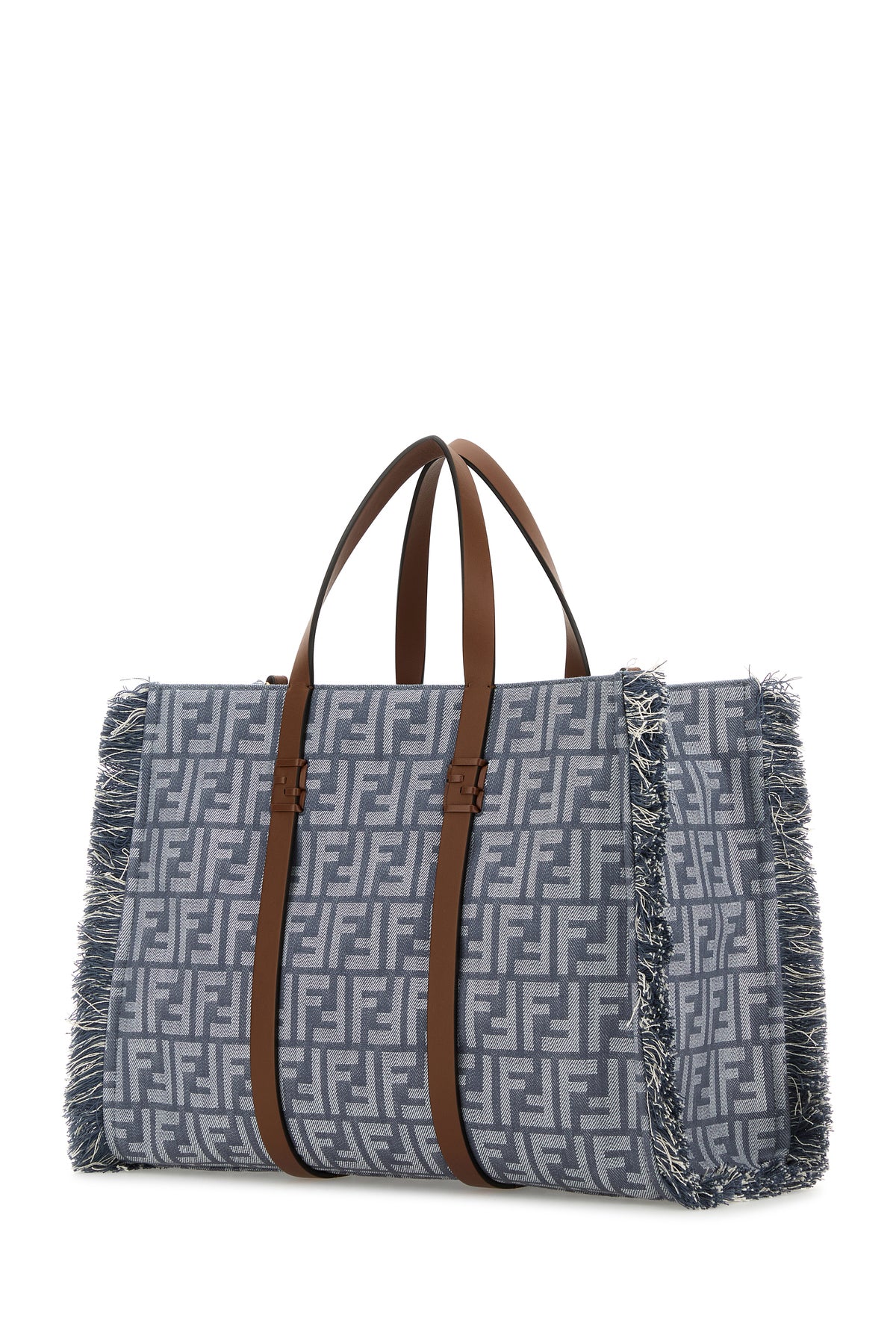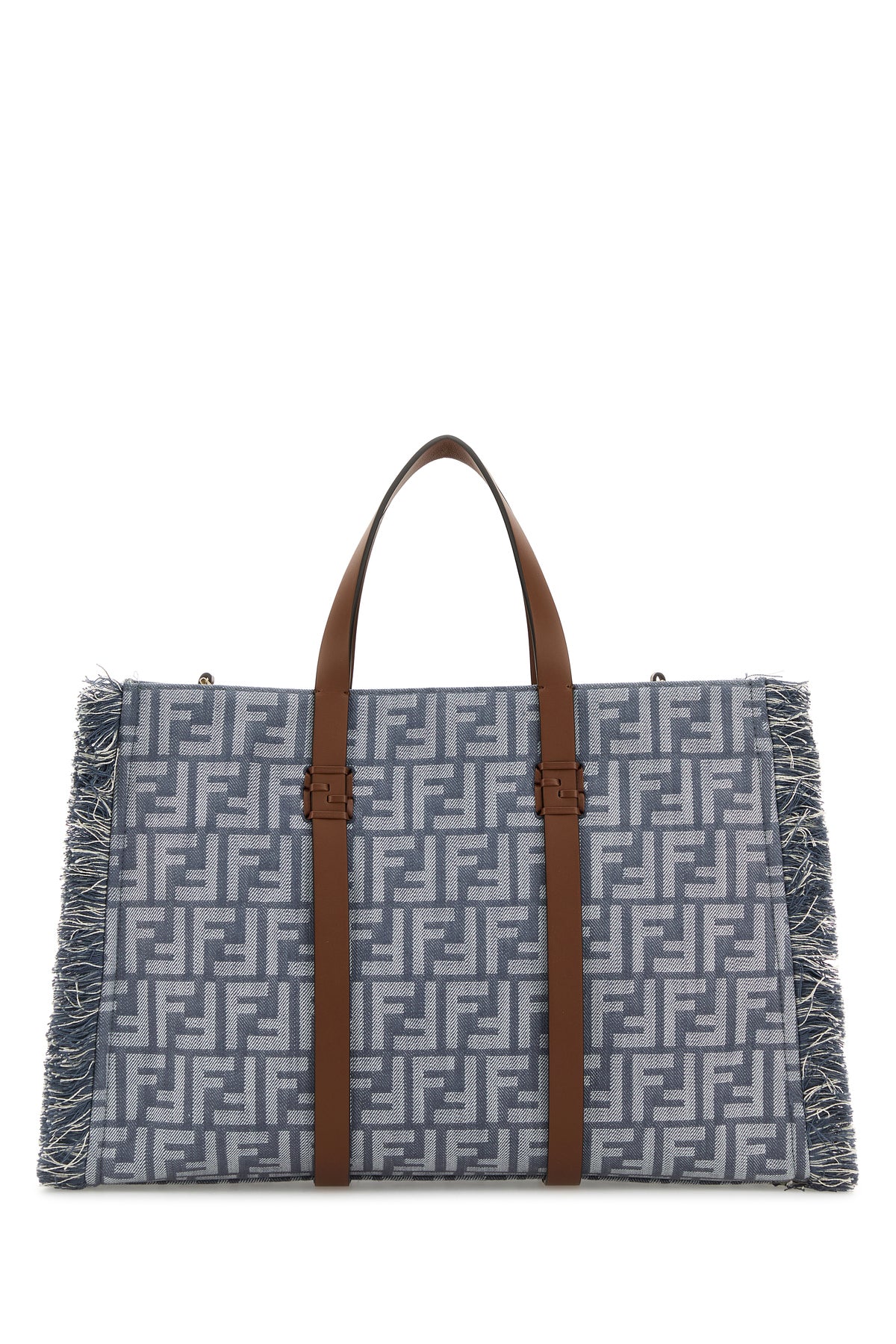 Shopping bag realized in denim characterized by FF embroidery on the entire surface enriched by fringes on the sides.