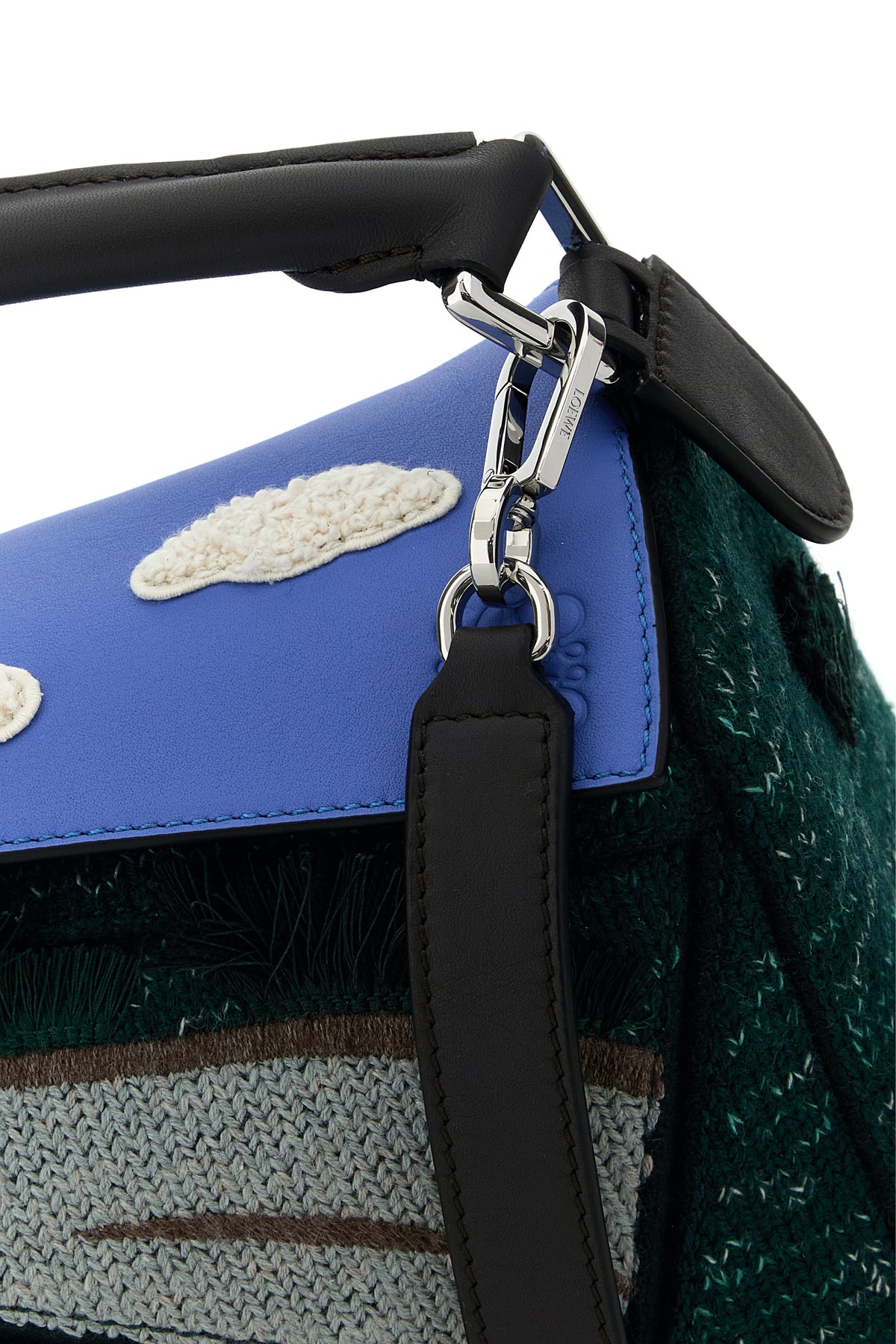 Handbag realized in fabric characterized by Futurist Cat embroidery on the entire surface, iconic geometric motif on the entire surface and embossed Anagram motif on the flap.