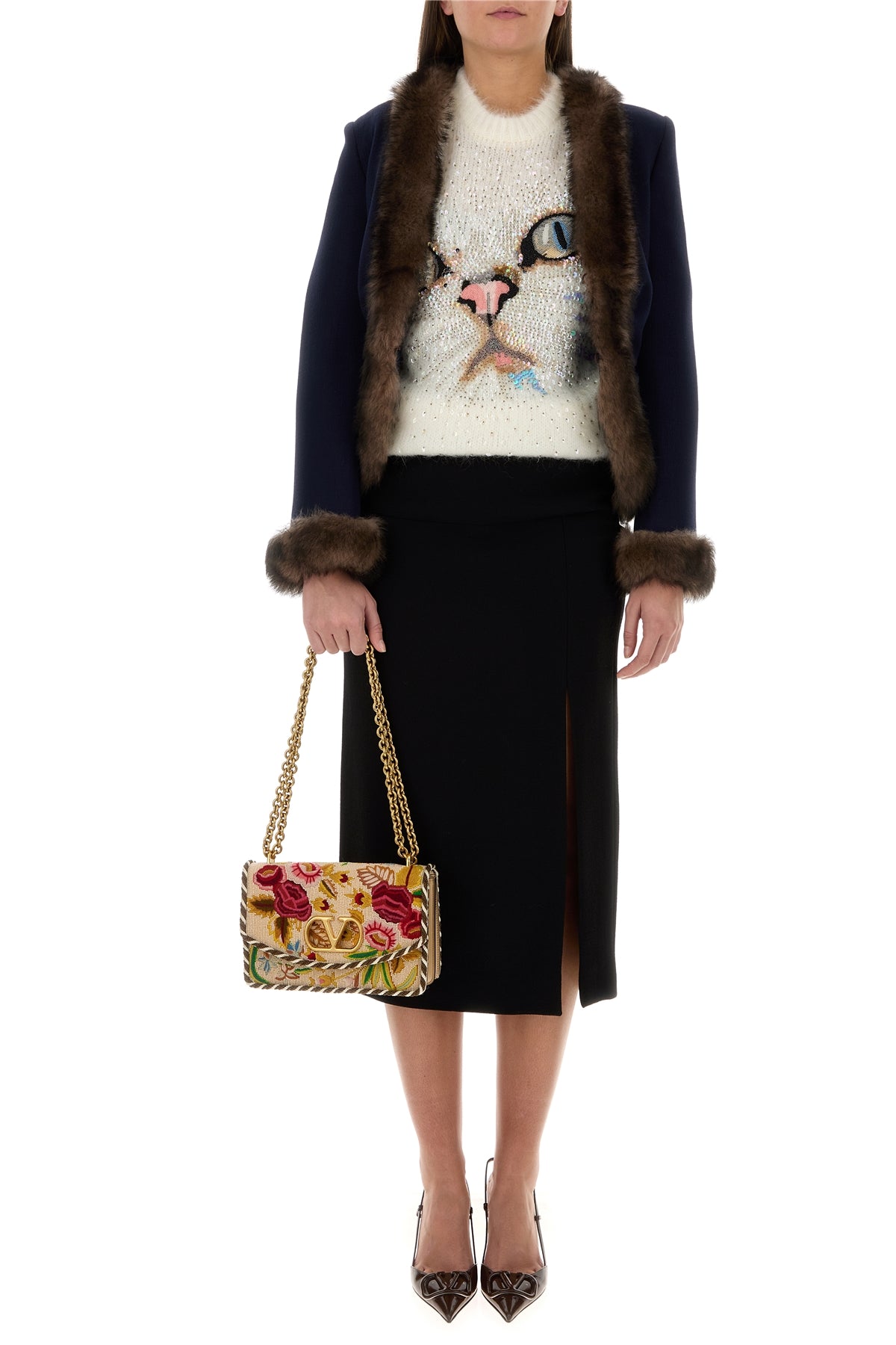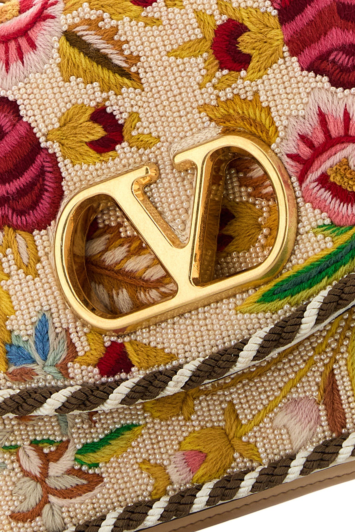 Shoulder bag realized in fabric characterized by floral embroidery enriched by beads on the entire surface.