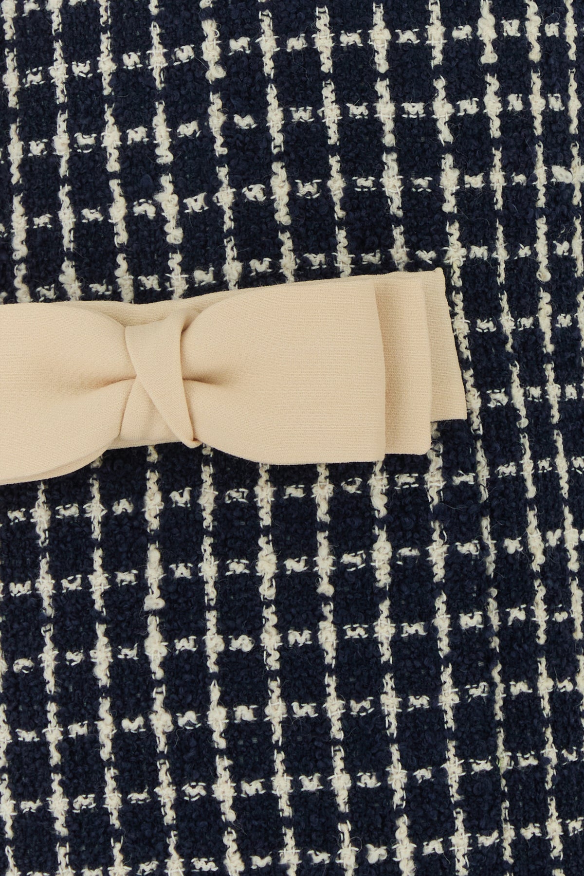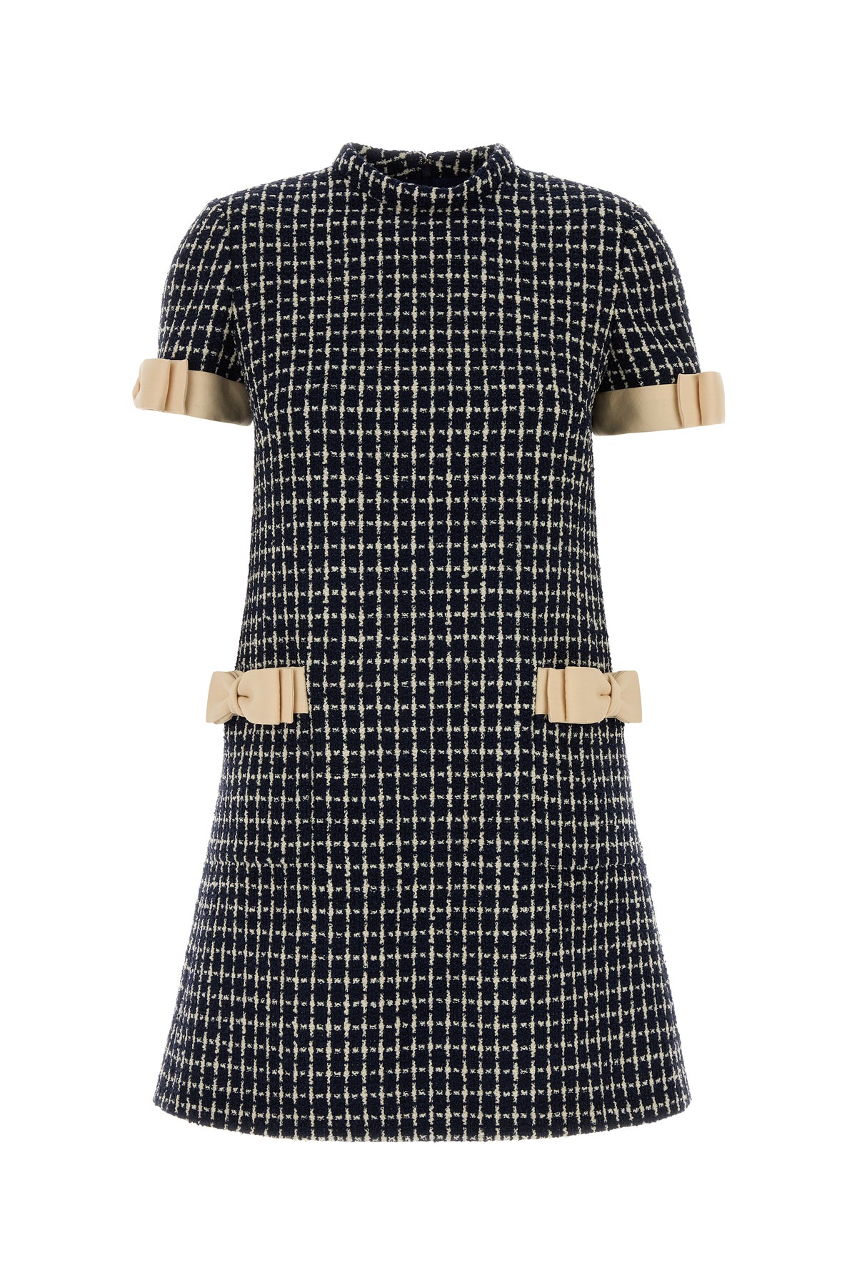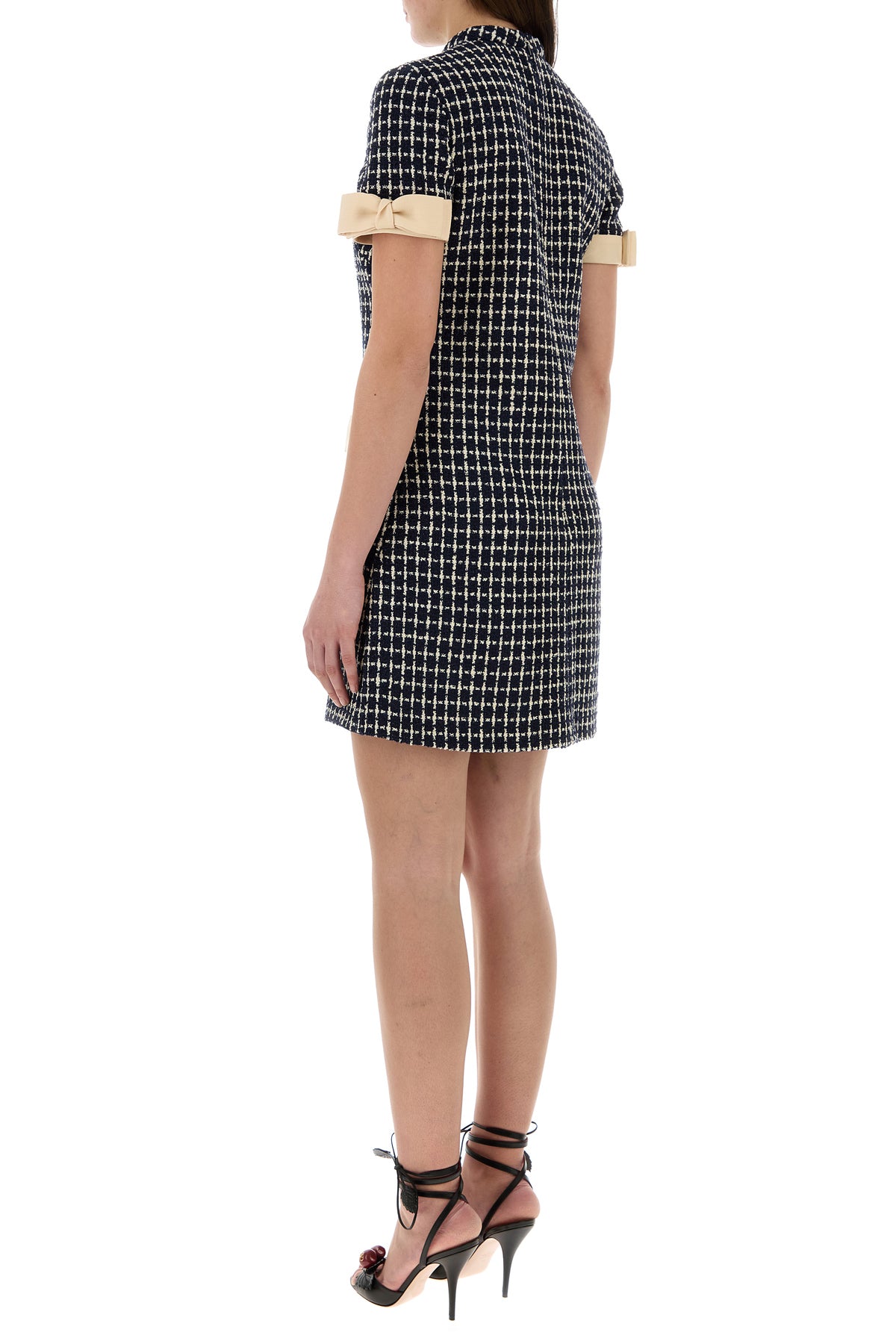 Mini dress realized in virgin wool blend tweed characterized by checked embroidery on the entire surface enriched by contrasting decorative bows at the front and on the sleeves.