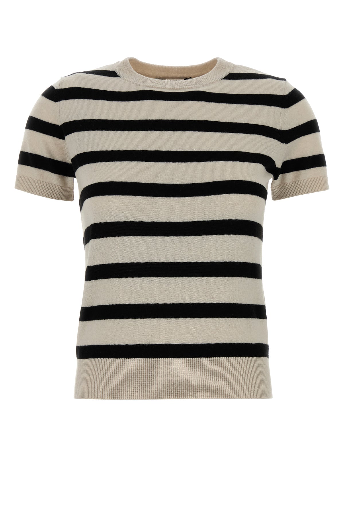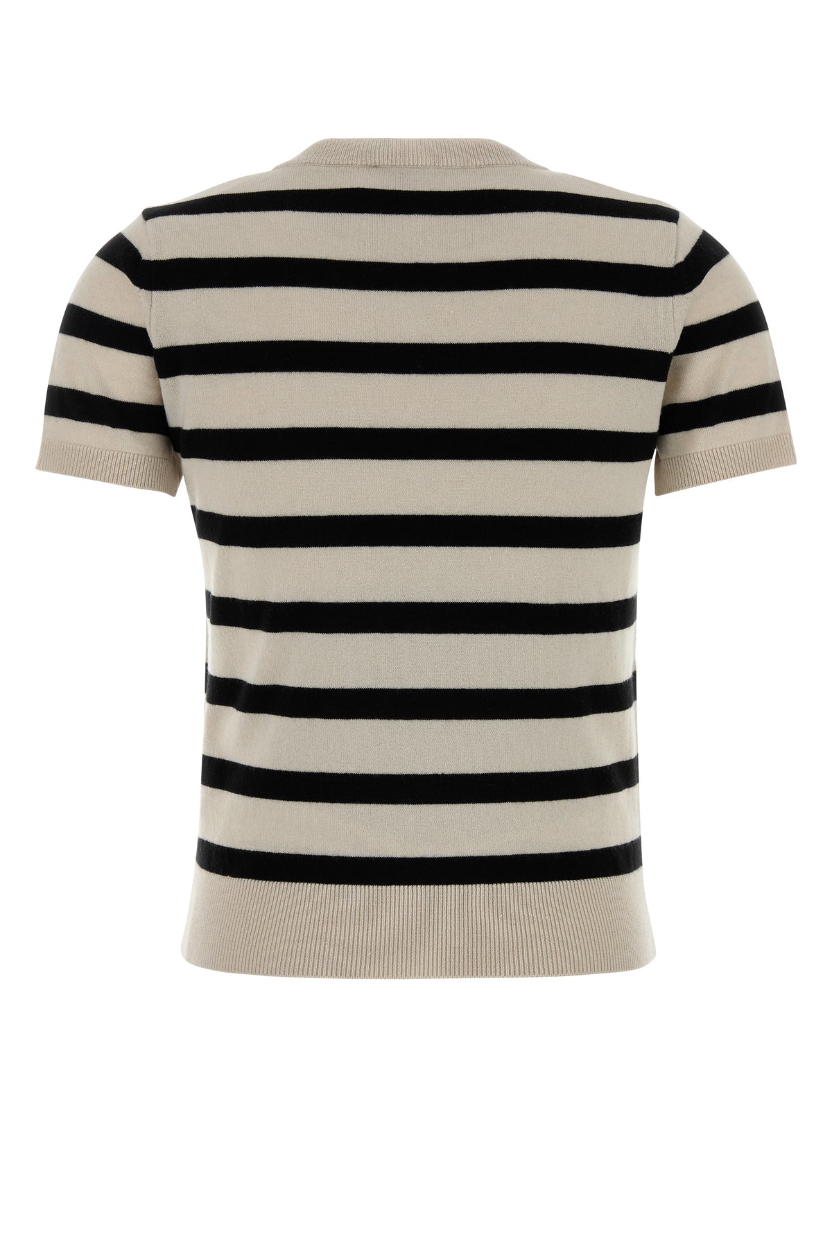 Short-sleeves sweater realized in pure wool characterized by striped embroidery on the entire surface.
