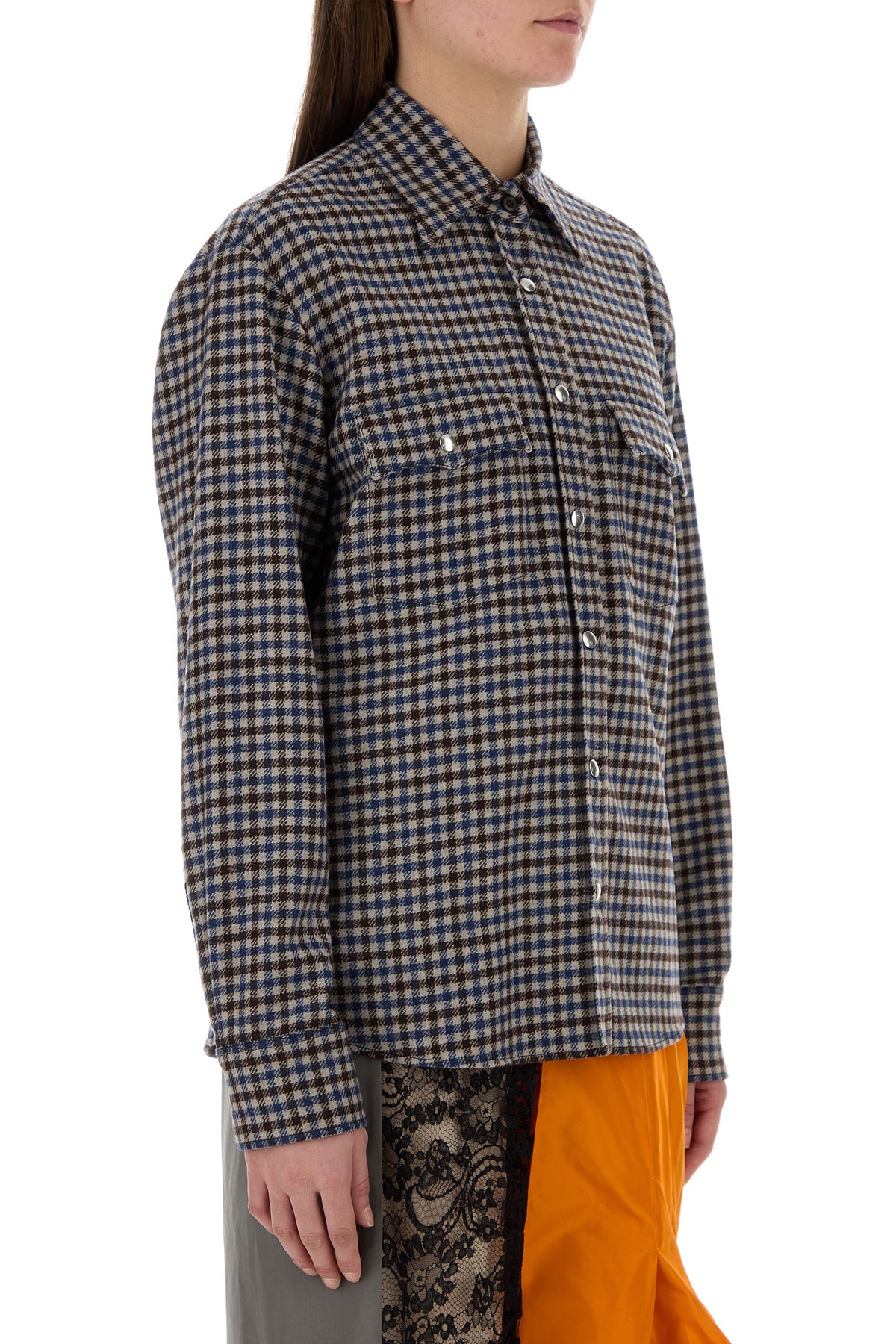 Shirt realized in pure virgin wool characterized by checked embroidery on the entire surface enriched by fabric iconic triangle at the back.