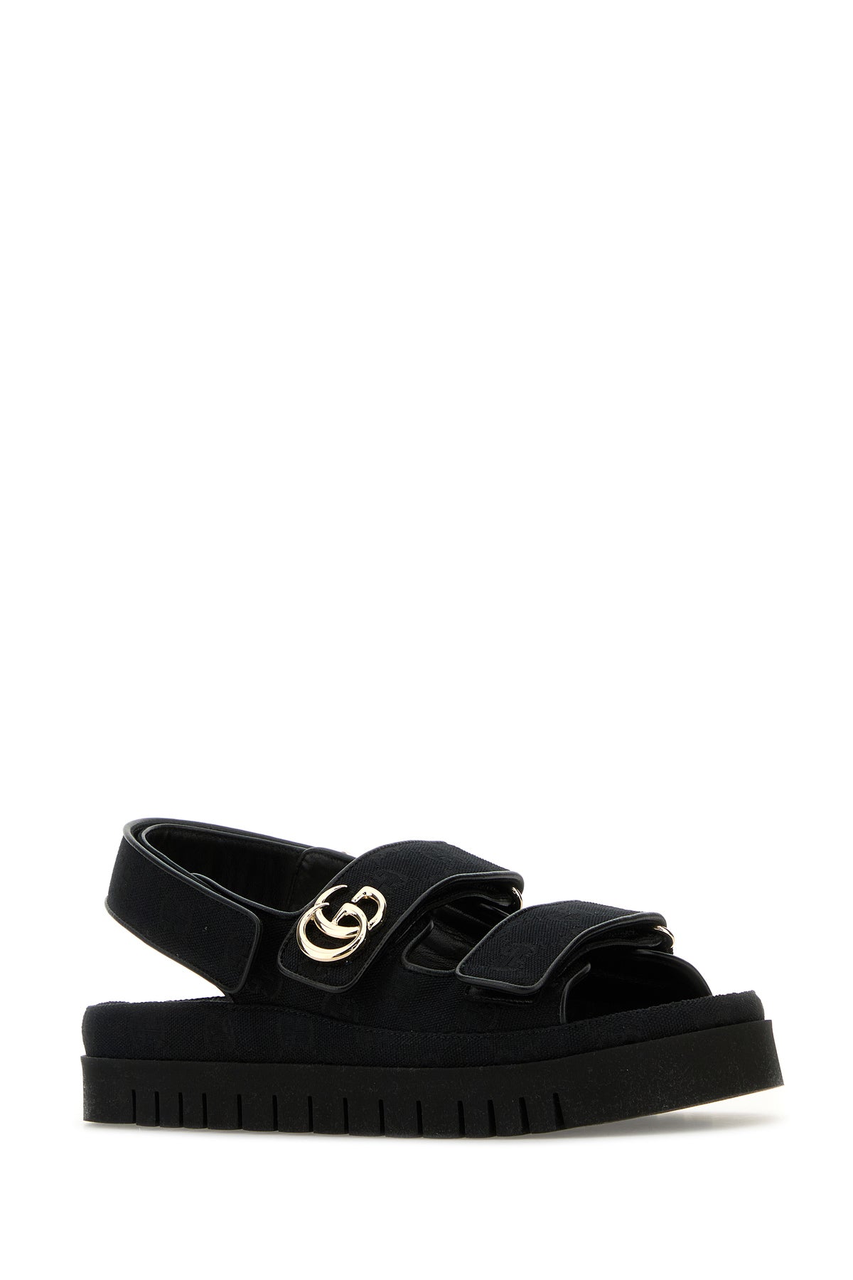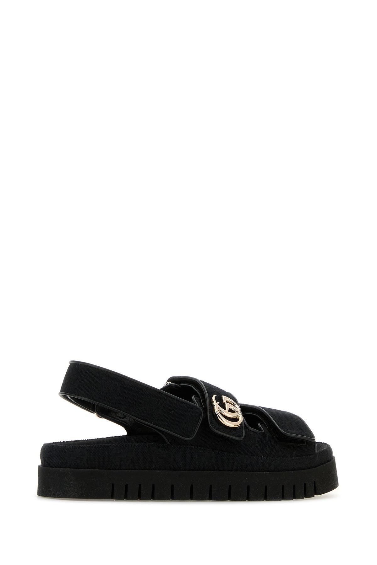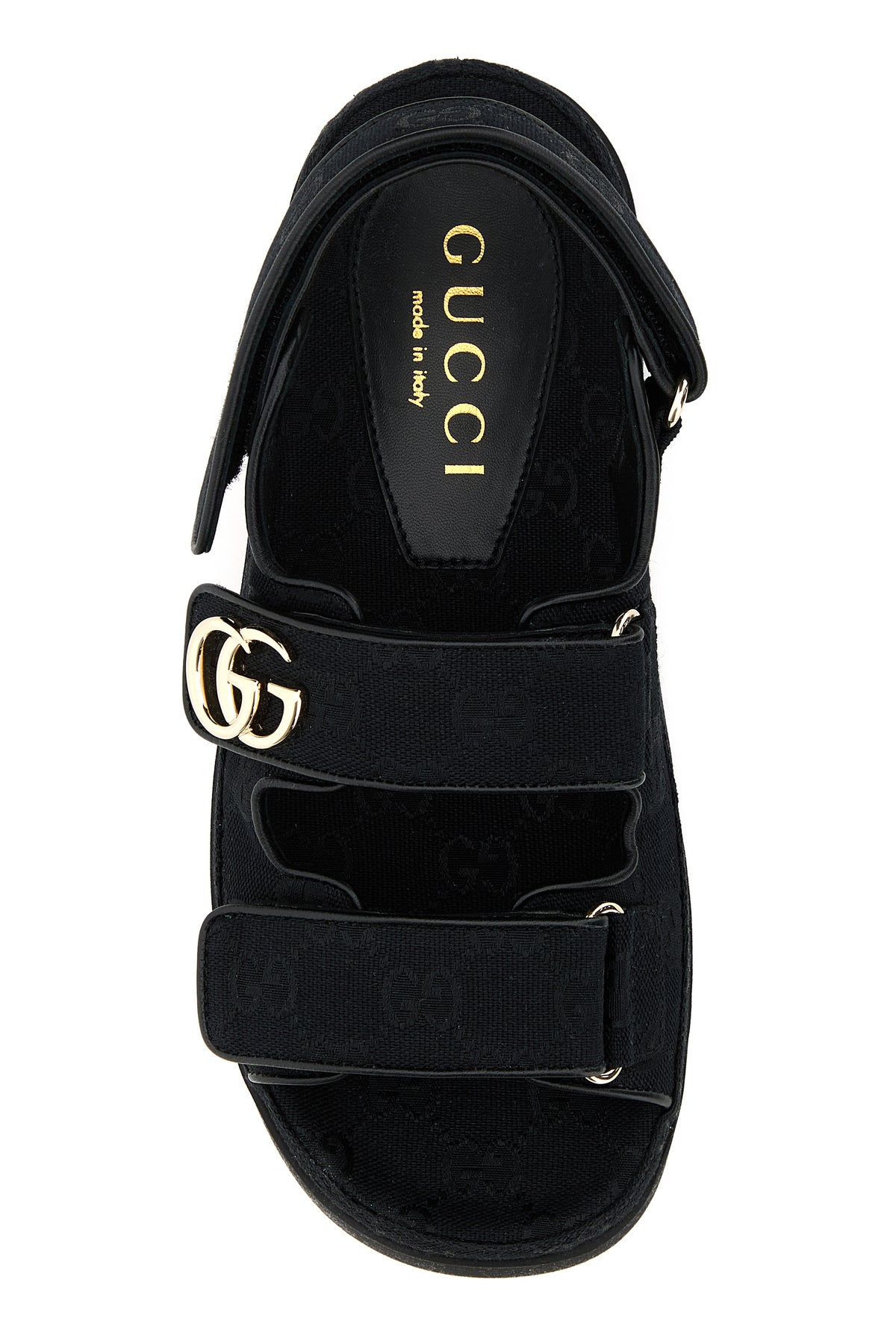 Sandals realized in GG fabric with leather trimmings enriched by metal GG detail on the instep.
