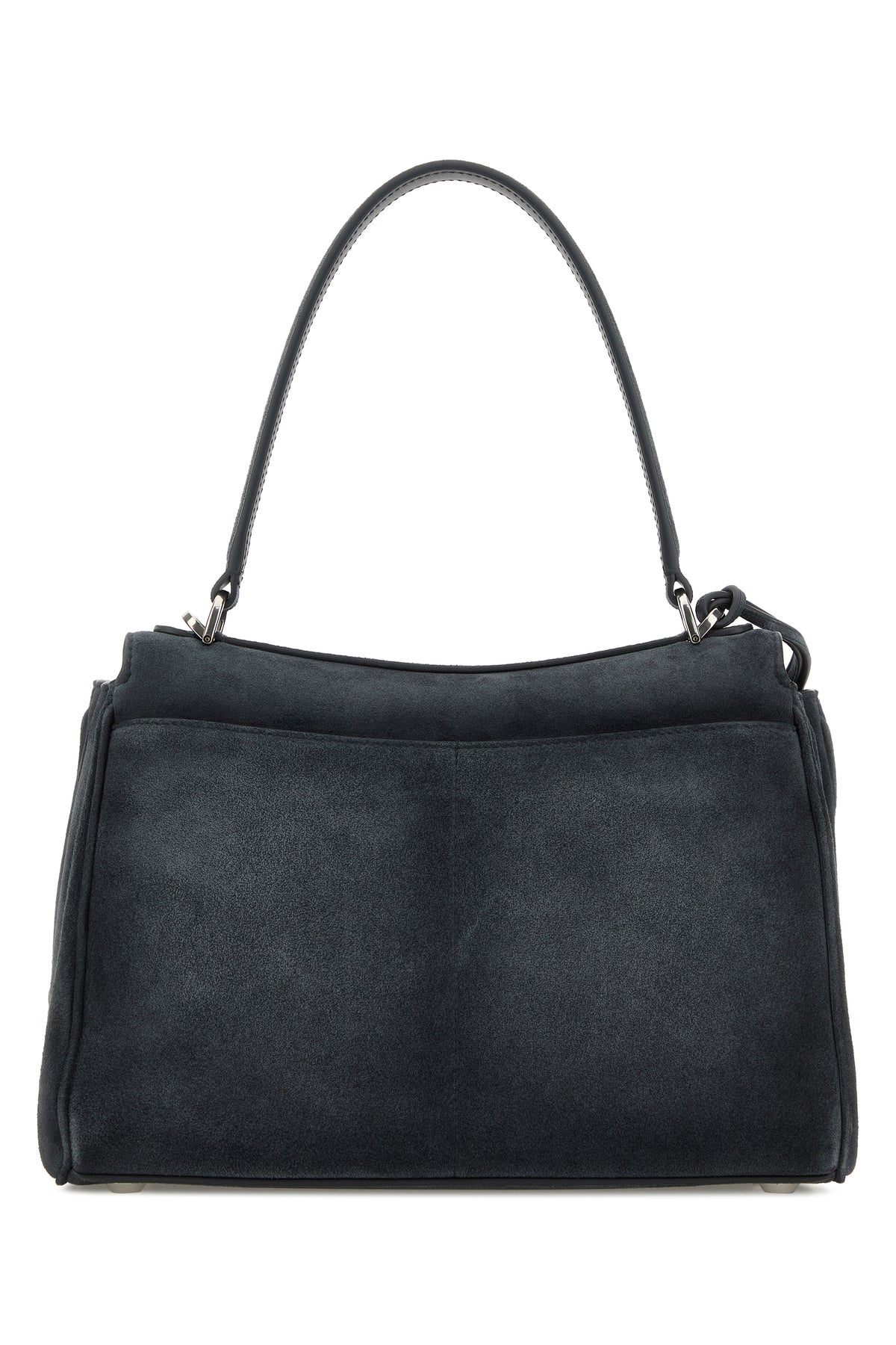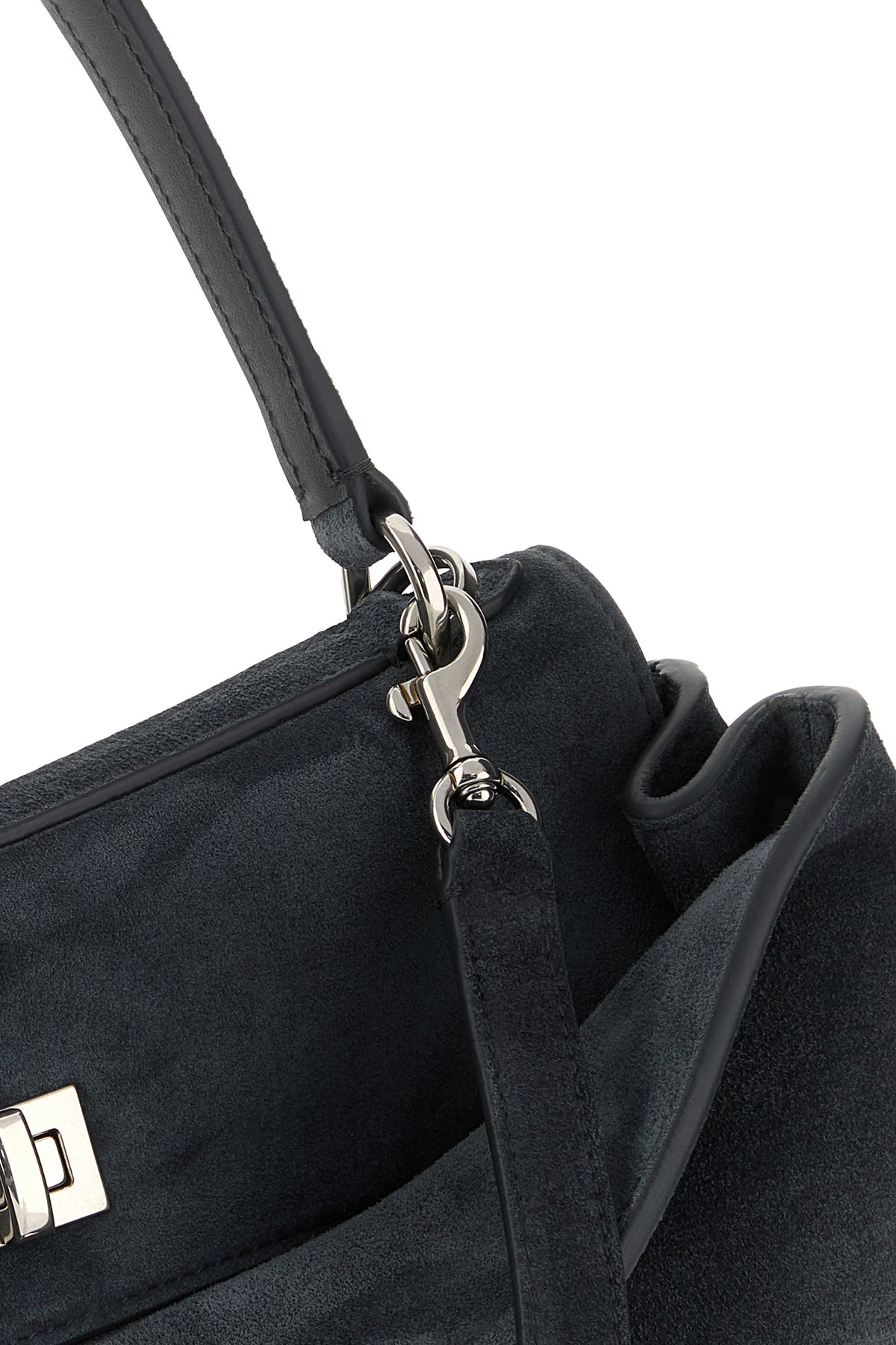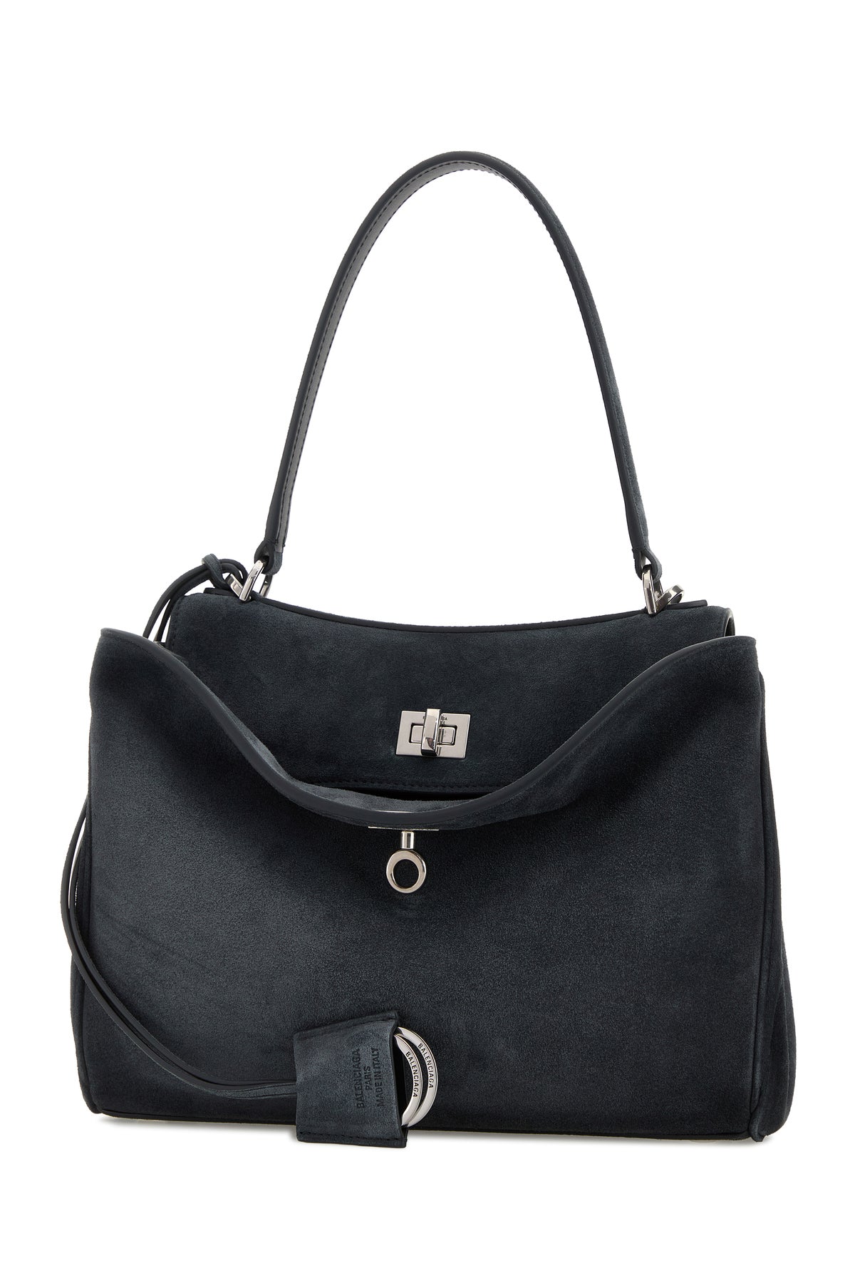 Handbag realized in calf suede enriched by detachable tonal leather accessory with metal rings.