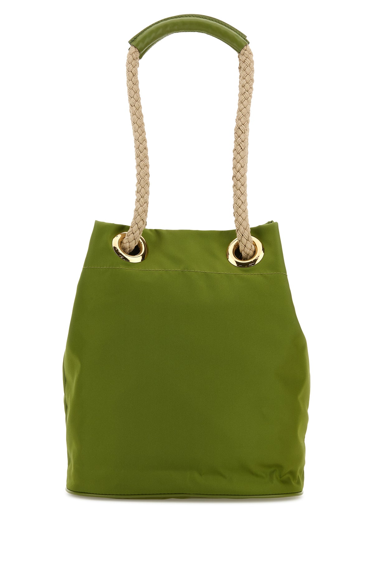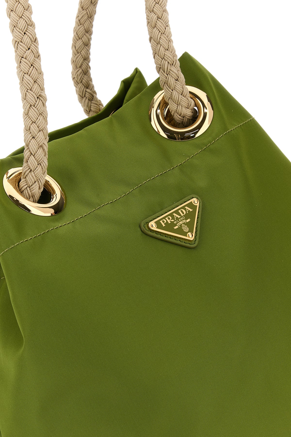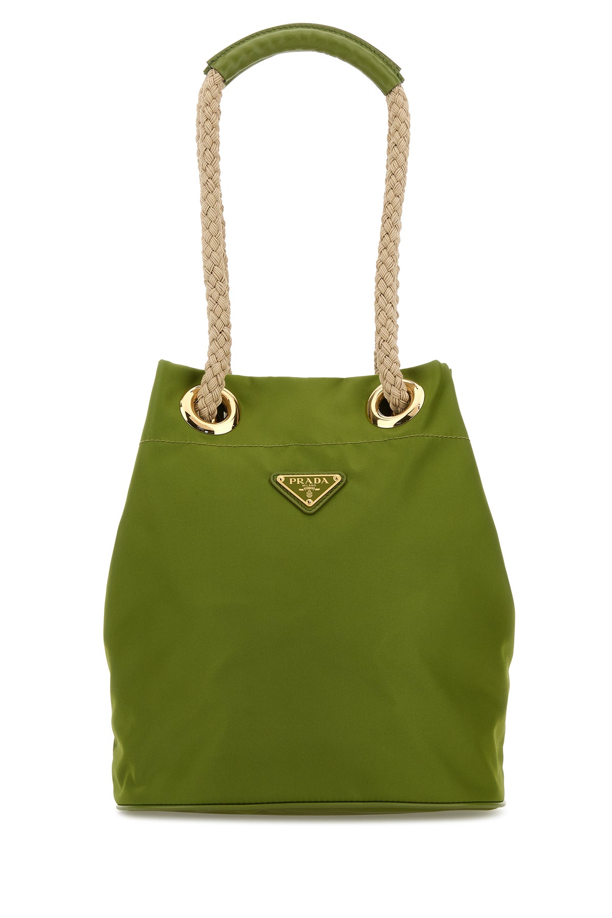 Bucket bag realized in Re-Nylon enriched by iconic logoed metal triangle at the front.