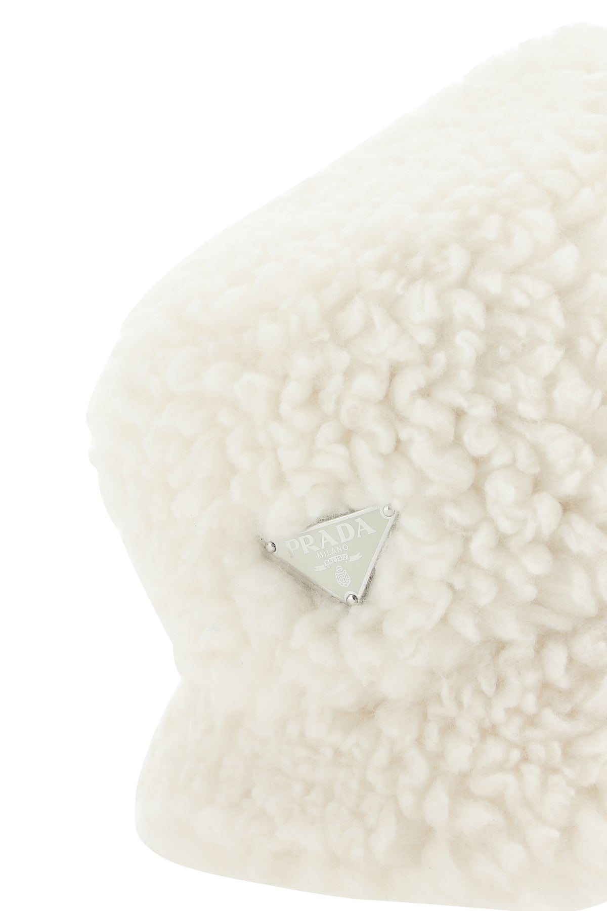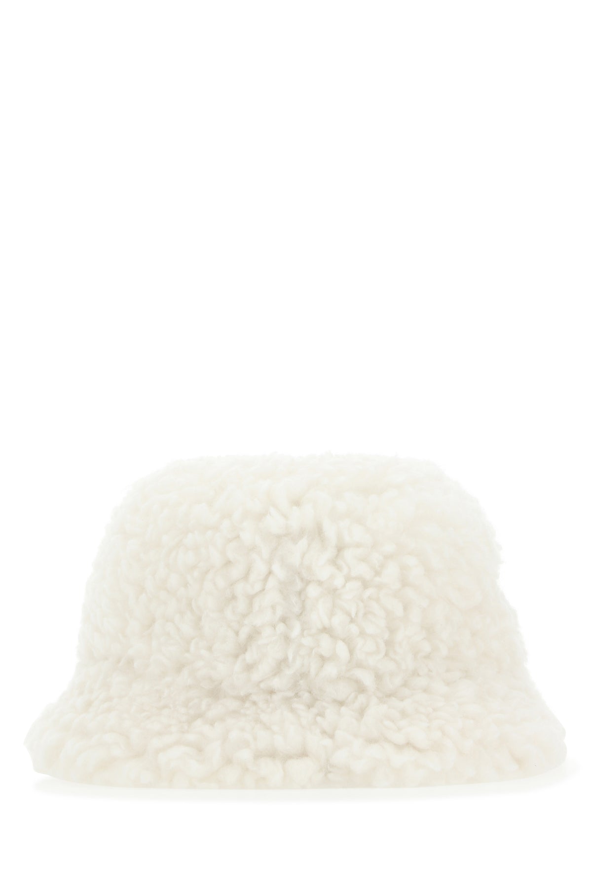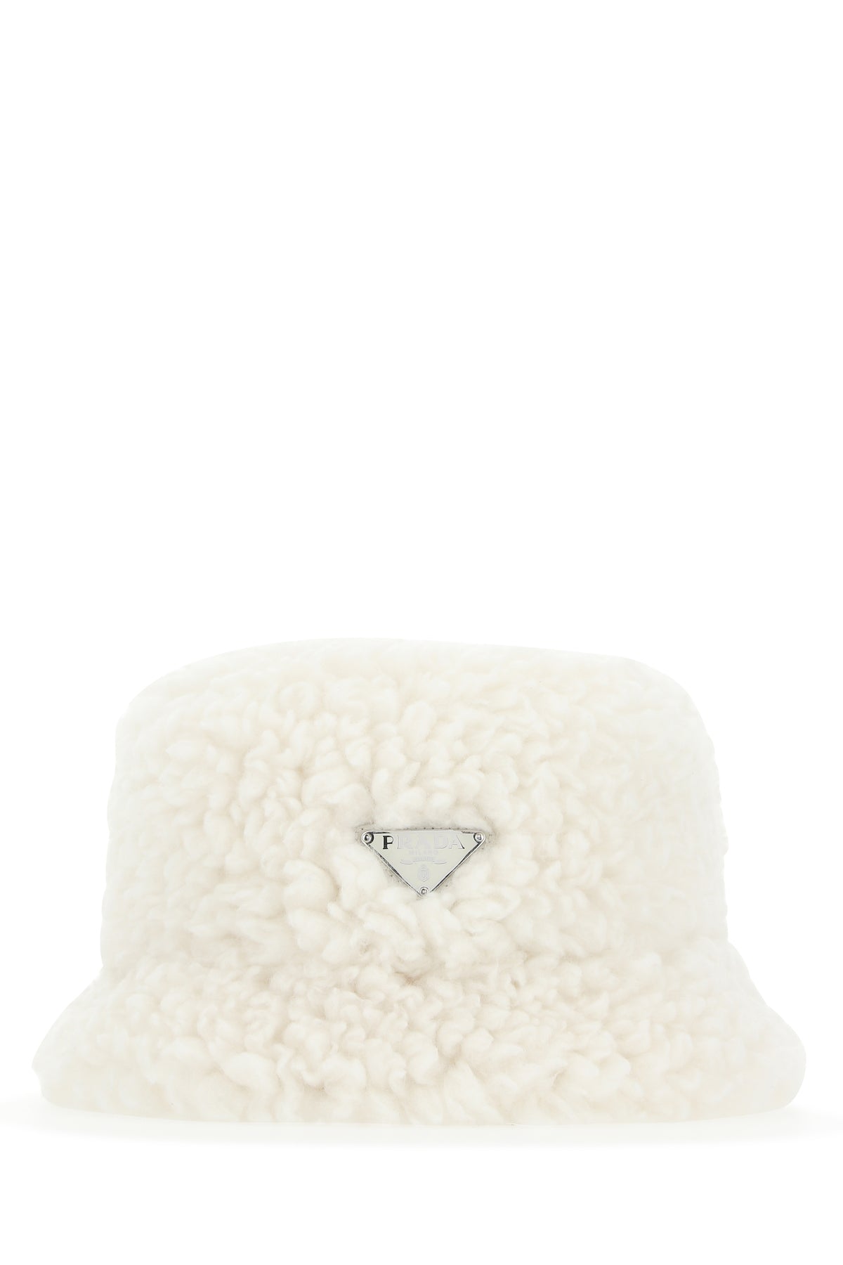 Bucket hat realized in eco shearling enriched by iconic logoed triangle at the front.