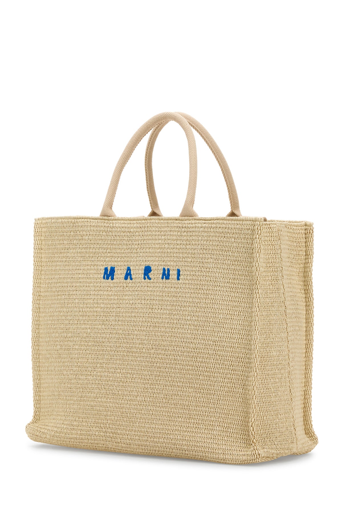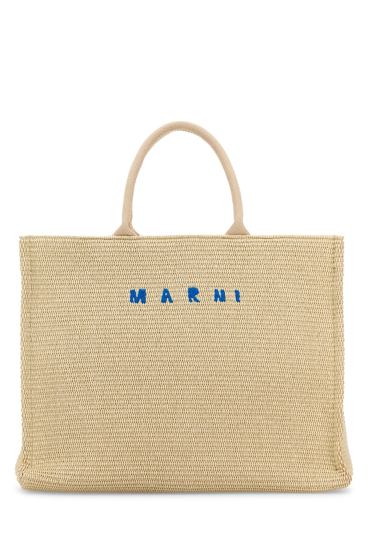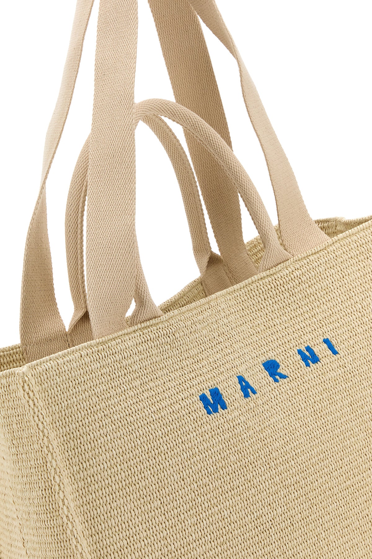 Shopping bag realized in raffia characterized by contrasting embroidered logo at the front.