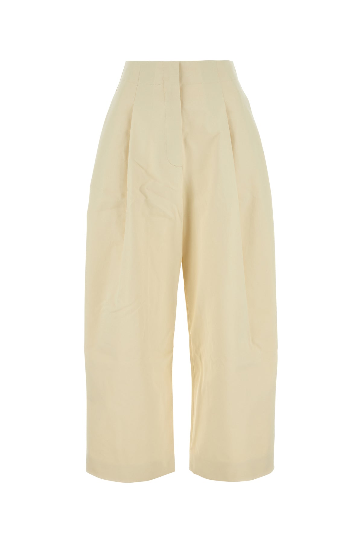 Wide-leg pant realized in pure cotton twill characterized by central seam pleats.