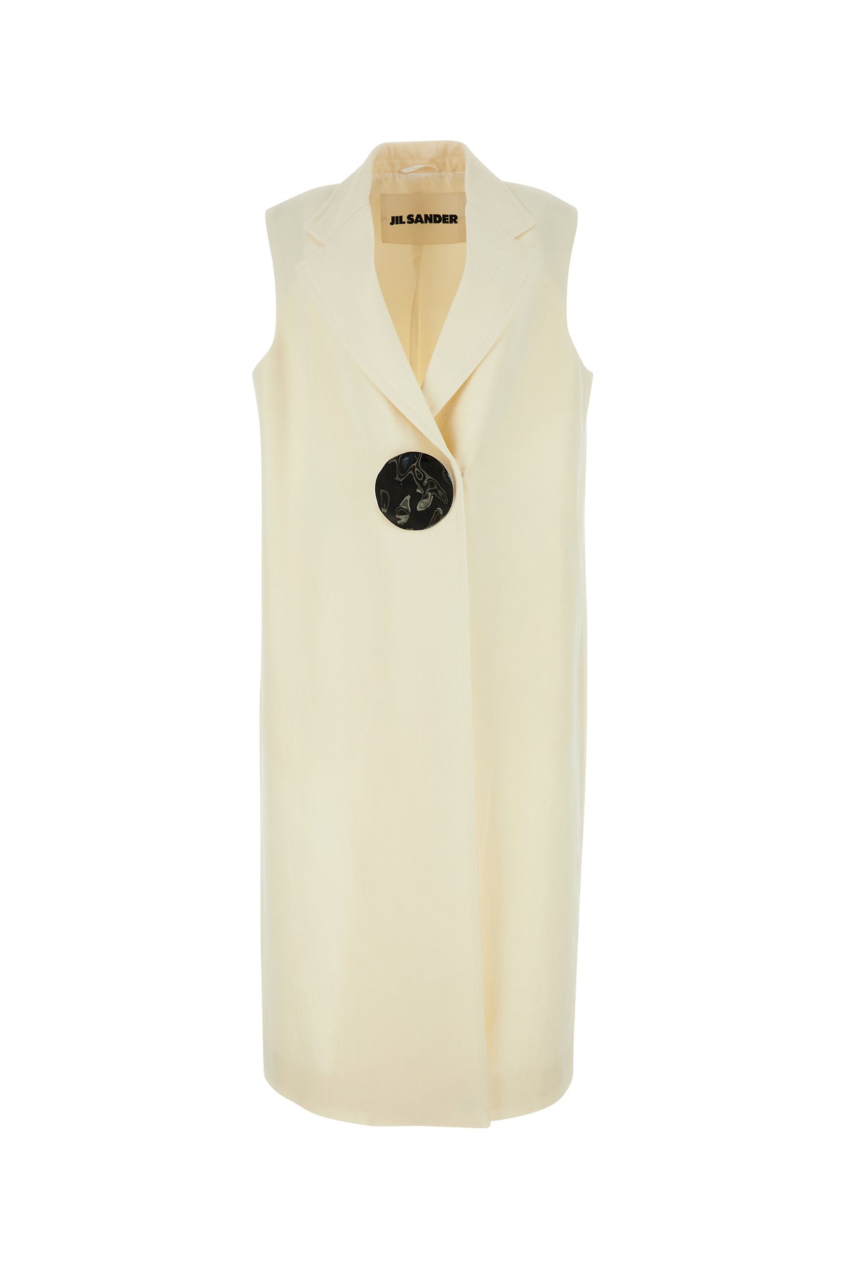 Long-cut vest realized in viscose and silk enriched by peculiar metal detail at the front.