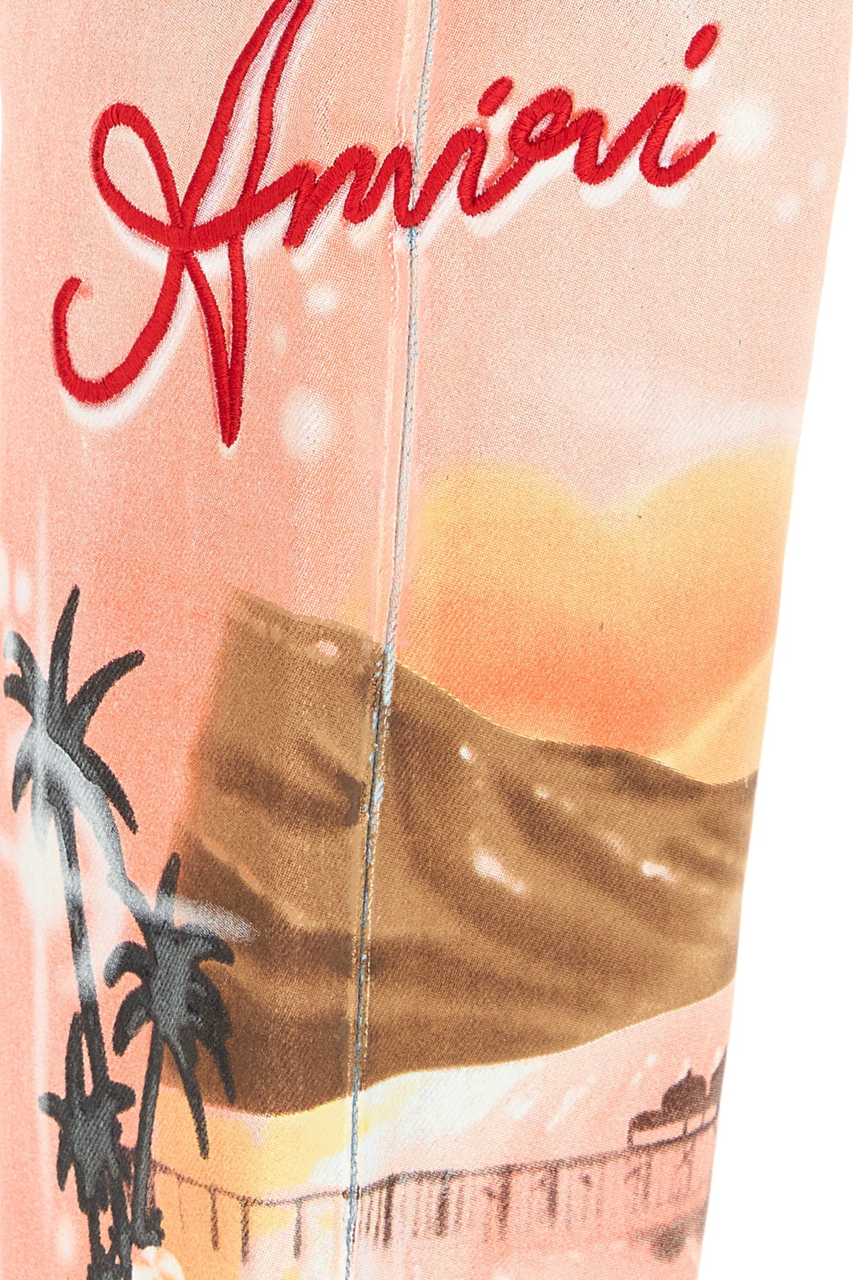 Regular jeans realized in stonewashed and distressed pure cotton denim characterized by Amiri Paradise print on the hemline.