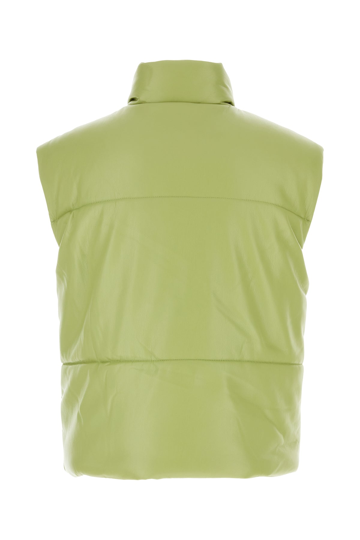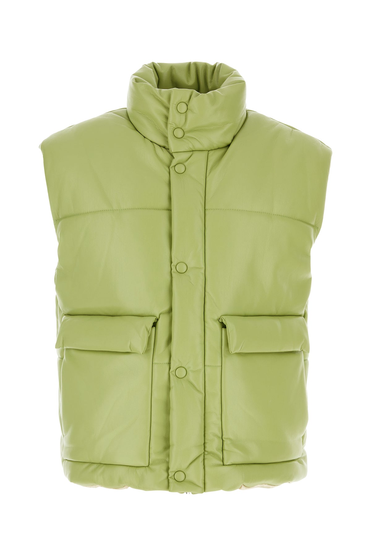 Sleeveless padded jacket realized in quilted synthetic leather.