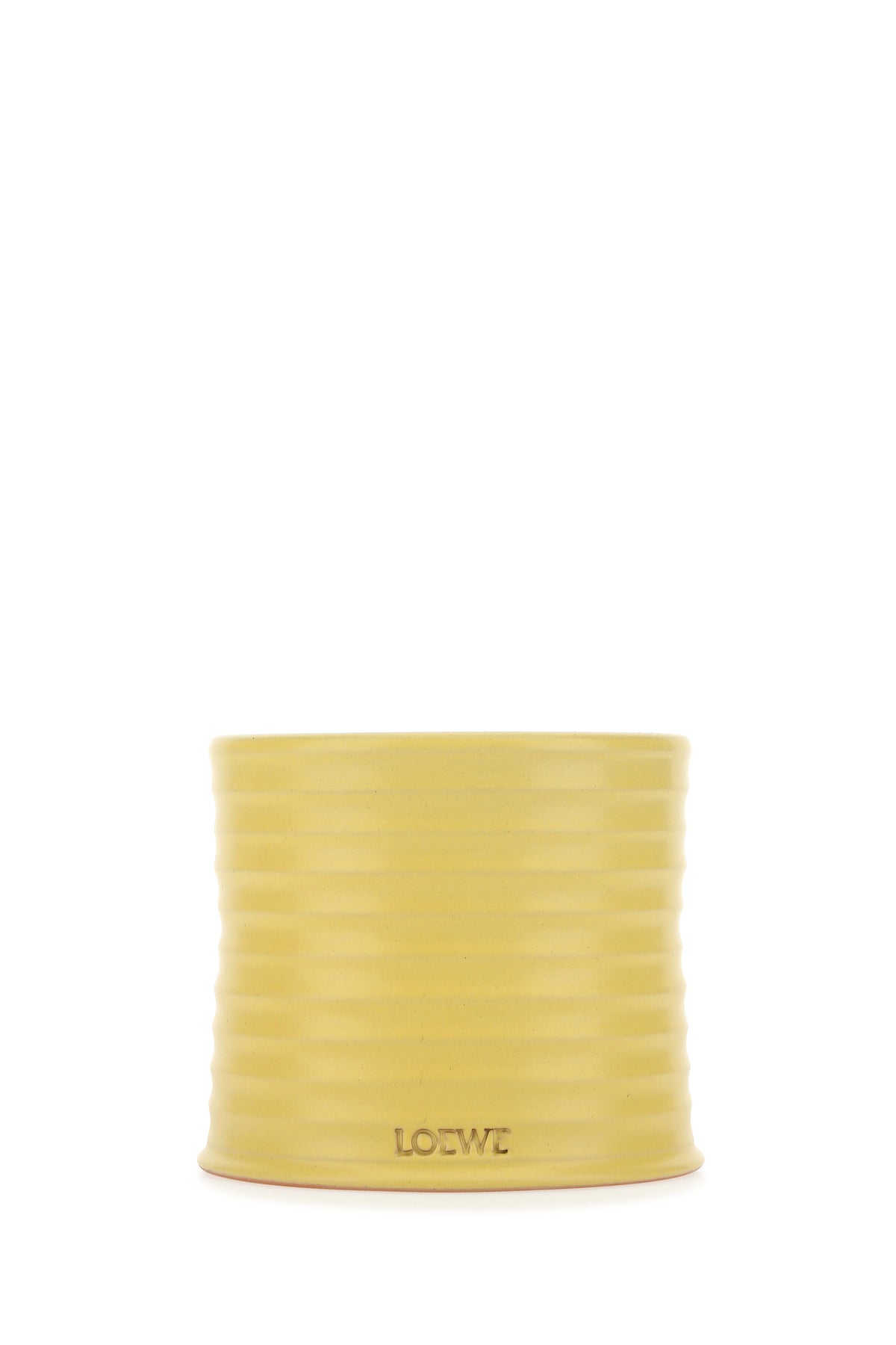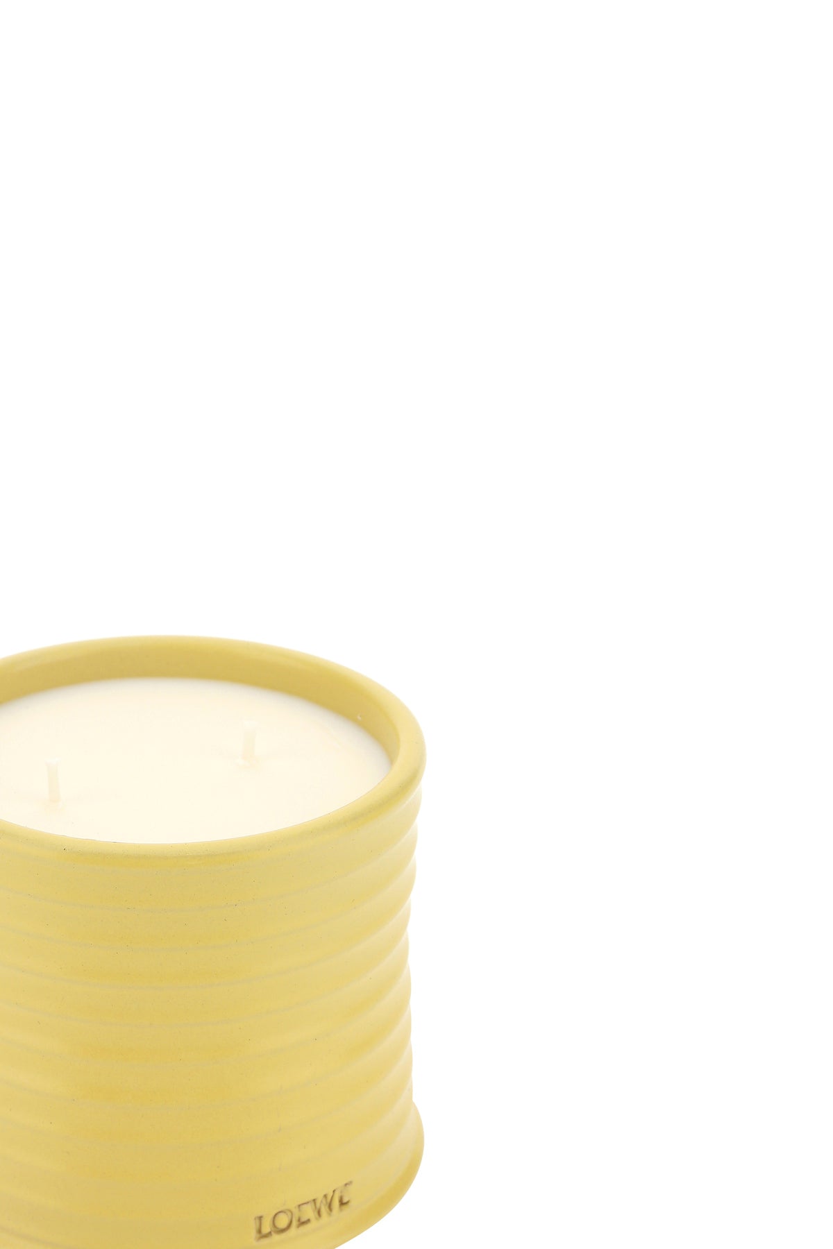 Scented candle characterized by a terracotta vessel with embossed logo.