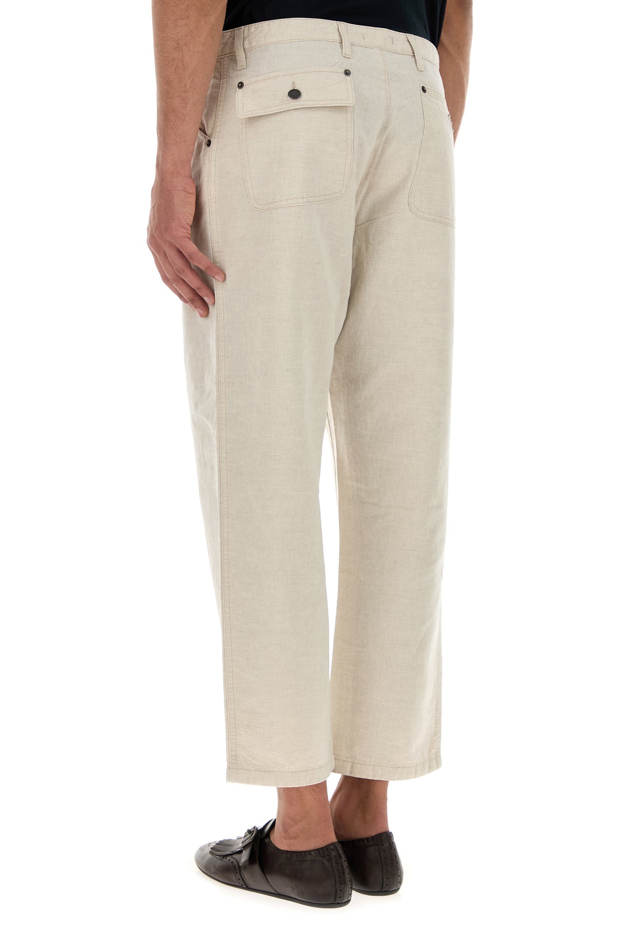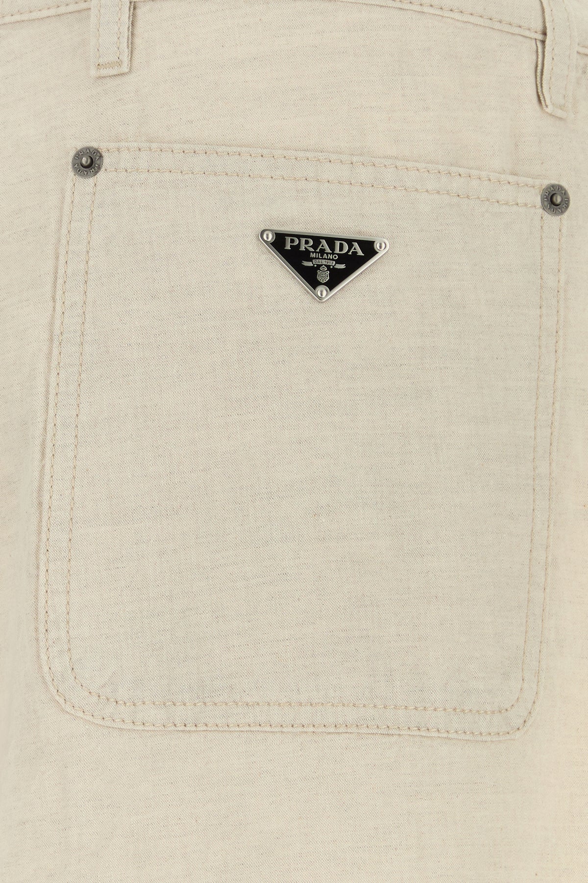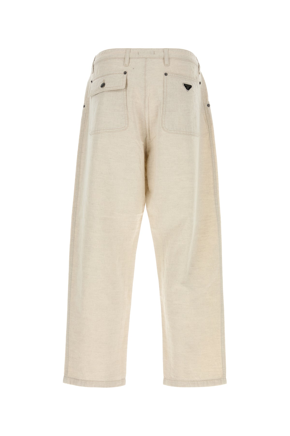 Pant realized in cotton and linen denim enriched by iconic logged metal triangle at the back.