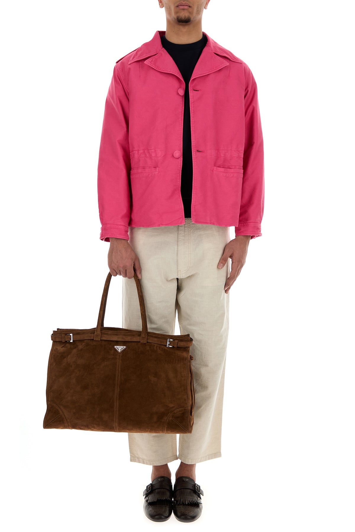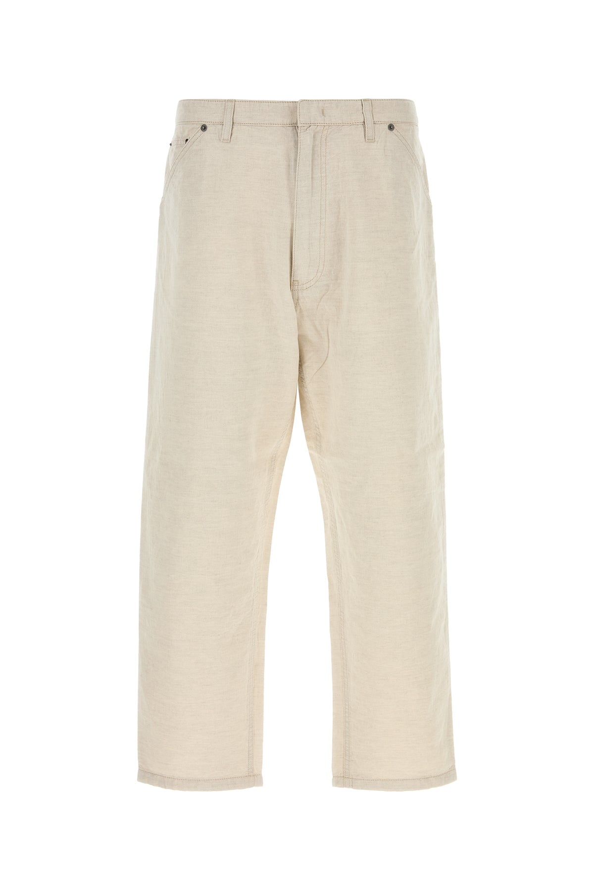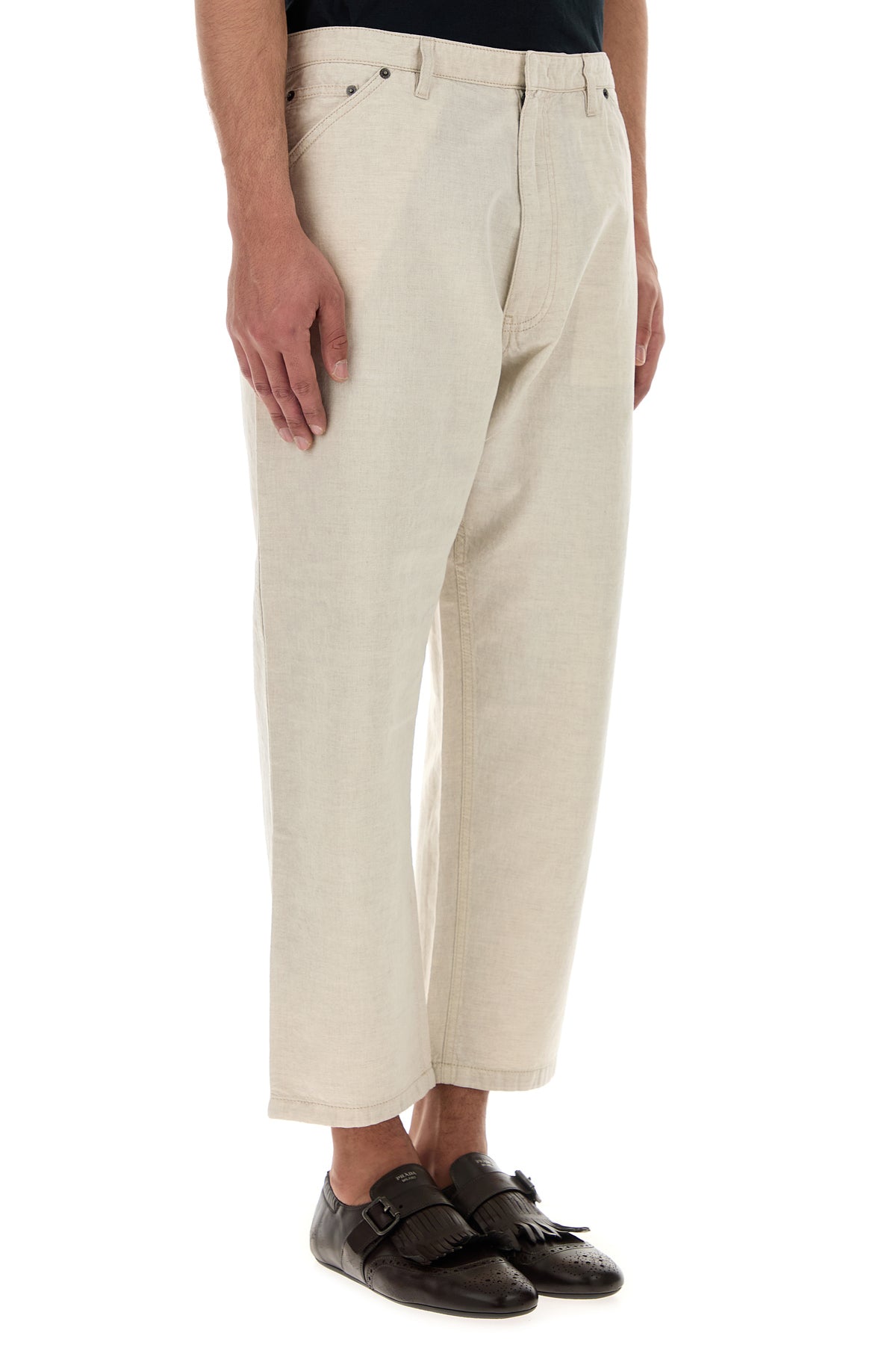 Pant realized in cotton and linen denim enriched by iconic logged metal triangle at the back.