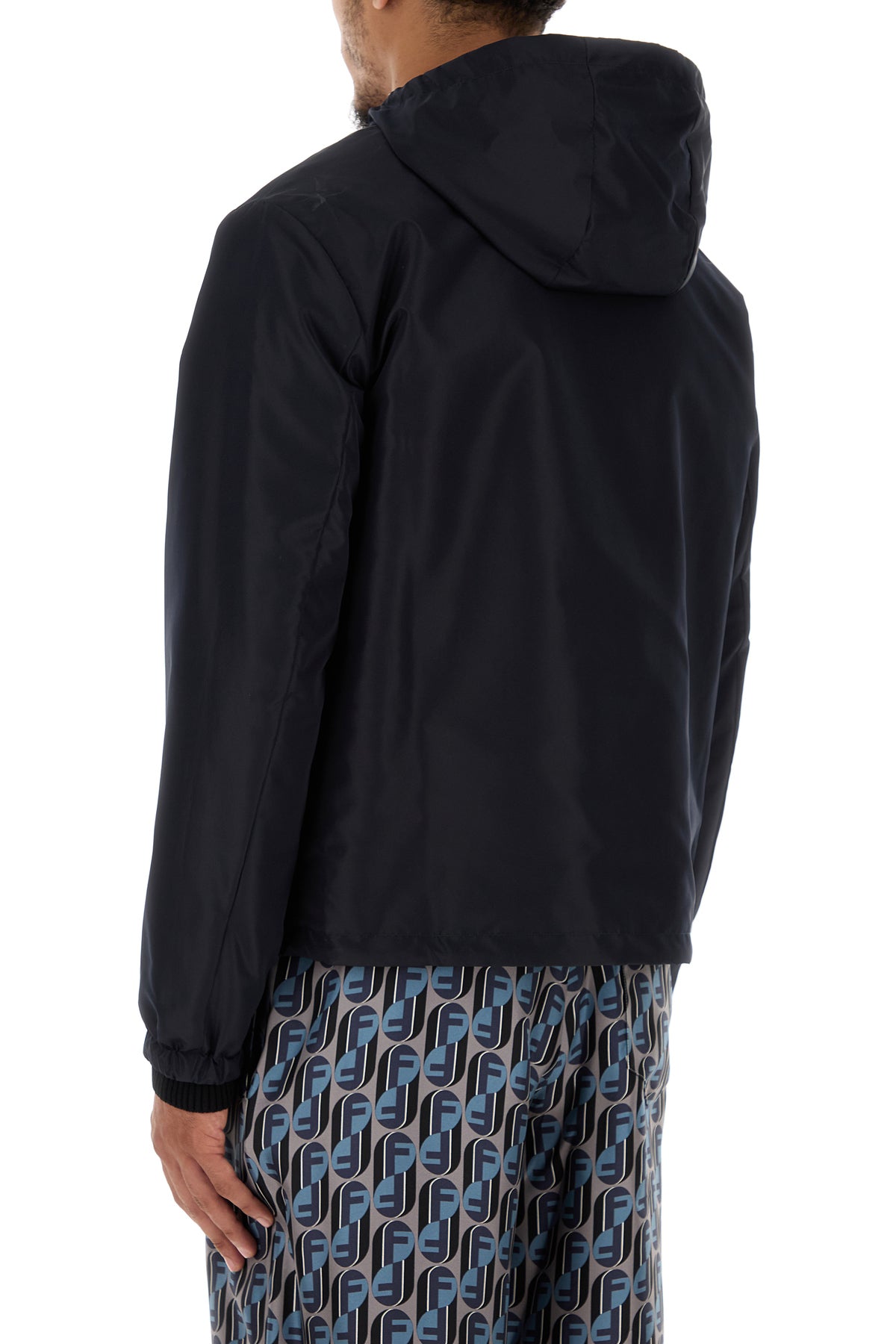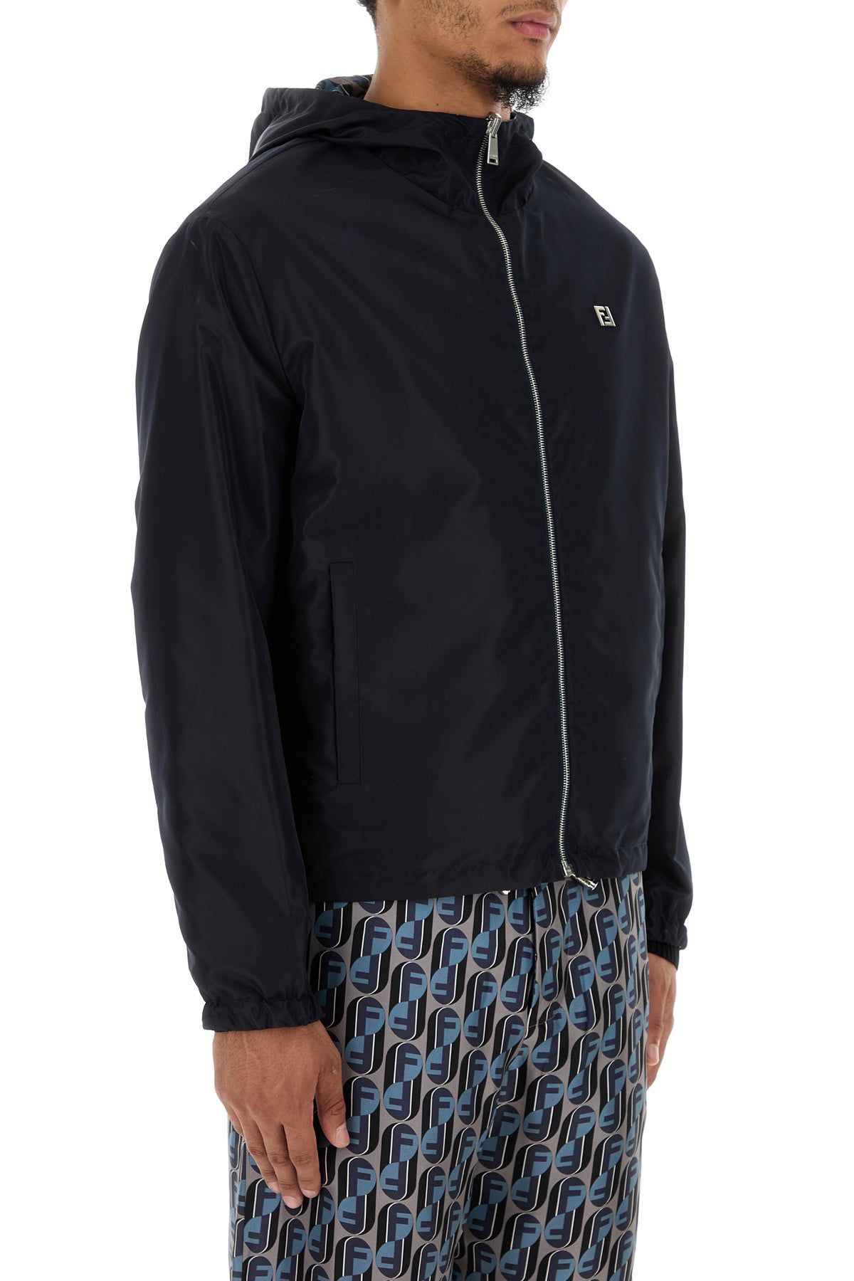 Reversible windbreaker realized in polyester enriched by metal FF detail on the chest.
