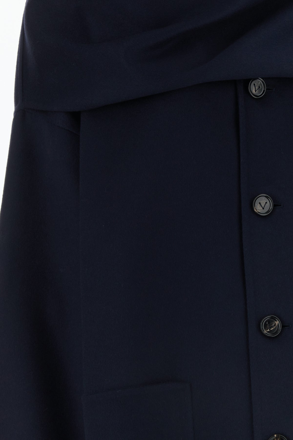 Coat realized in wool and cashmere enriched by partially detachable tonal fabric panel at the top.