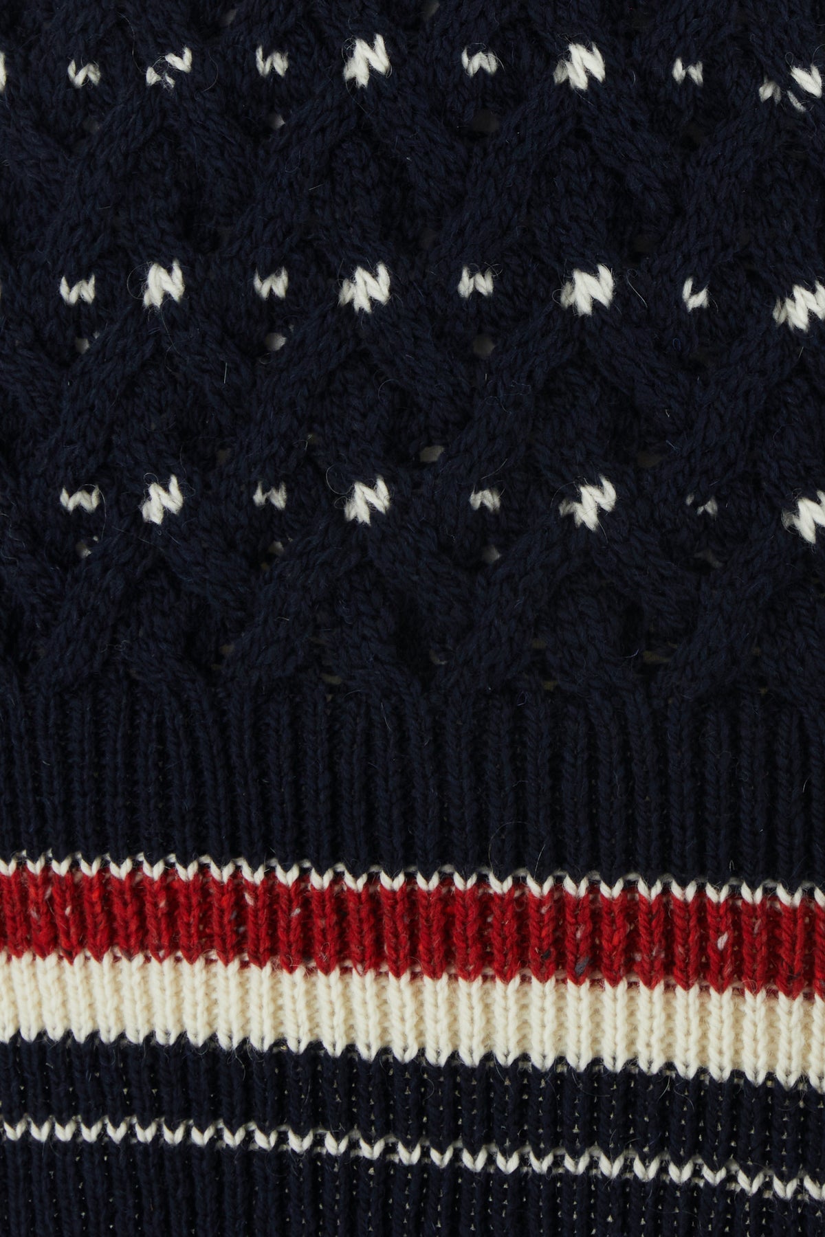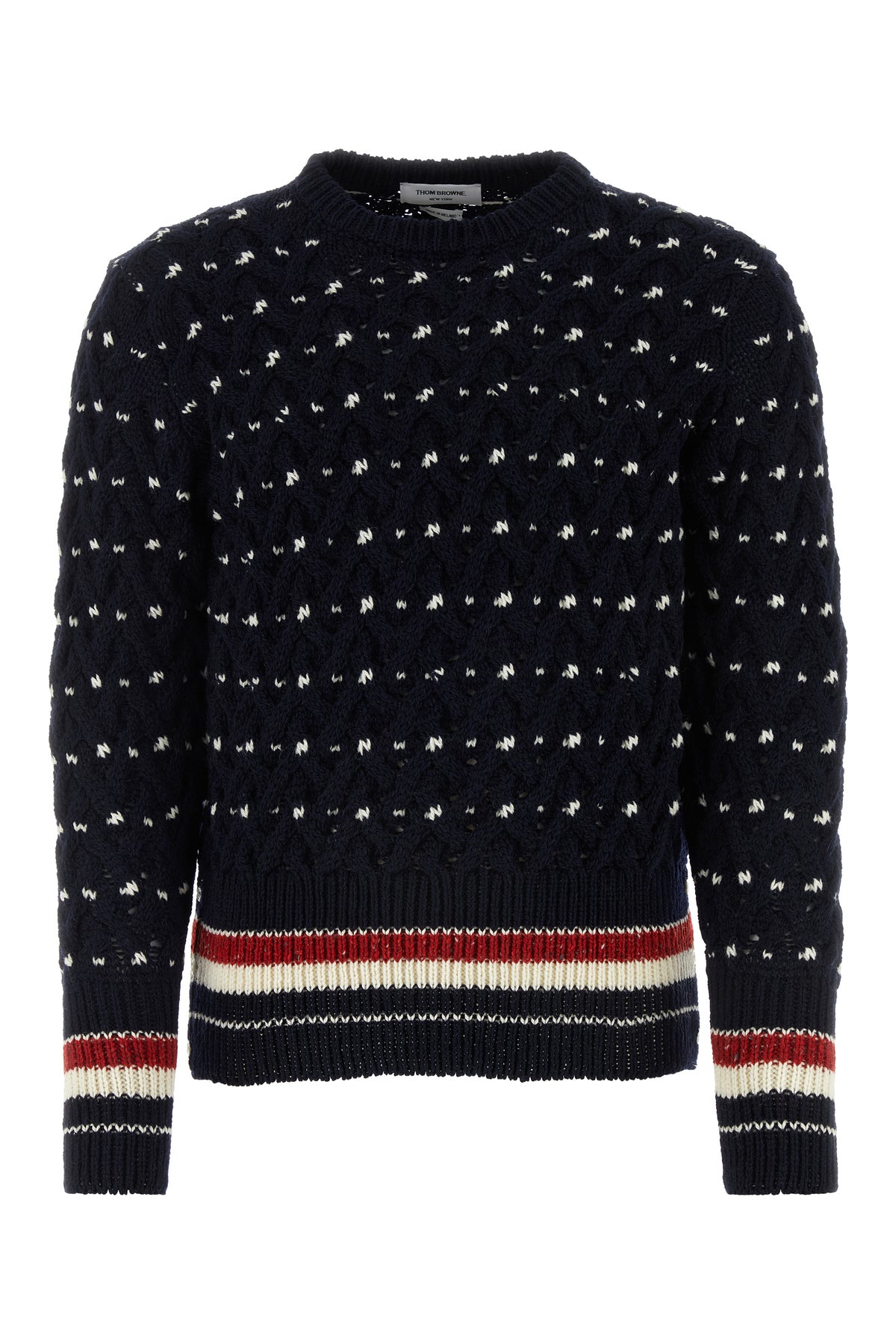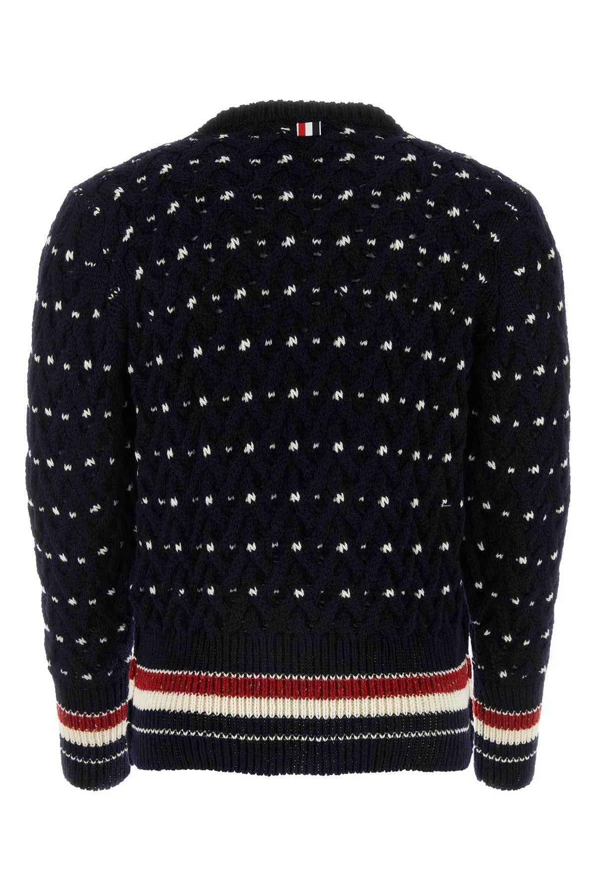 Sweater realized in wool and mohair characterized by contrasting peculiar embroideries on the entire surface enriched by iconic tricolor label at the back.