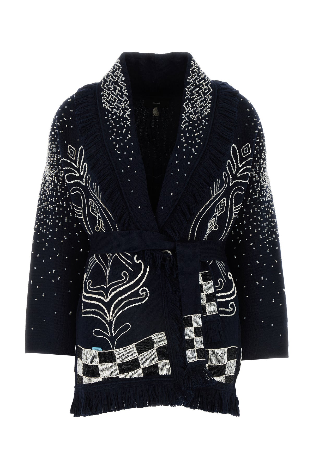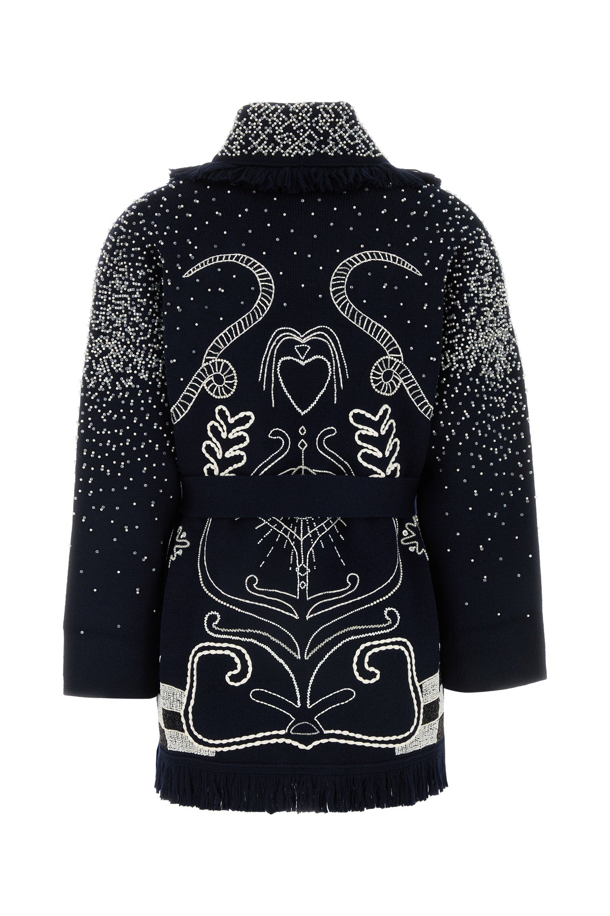 Cardigan realized in pure virgin wool enriched by beads embellishments on the entire surface.
