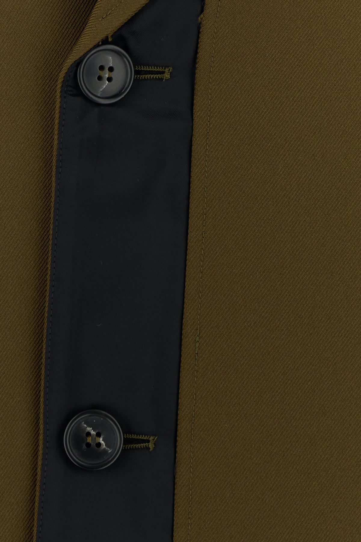 Coat realized in polyester with contrasting satin insert at the front characterized by iconic contrasting stitching at the back enriched by contrasting logoed label on the sleeve.