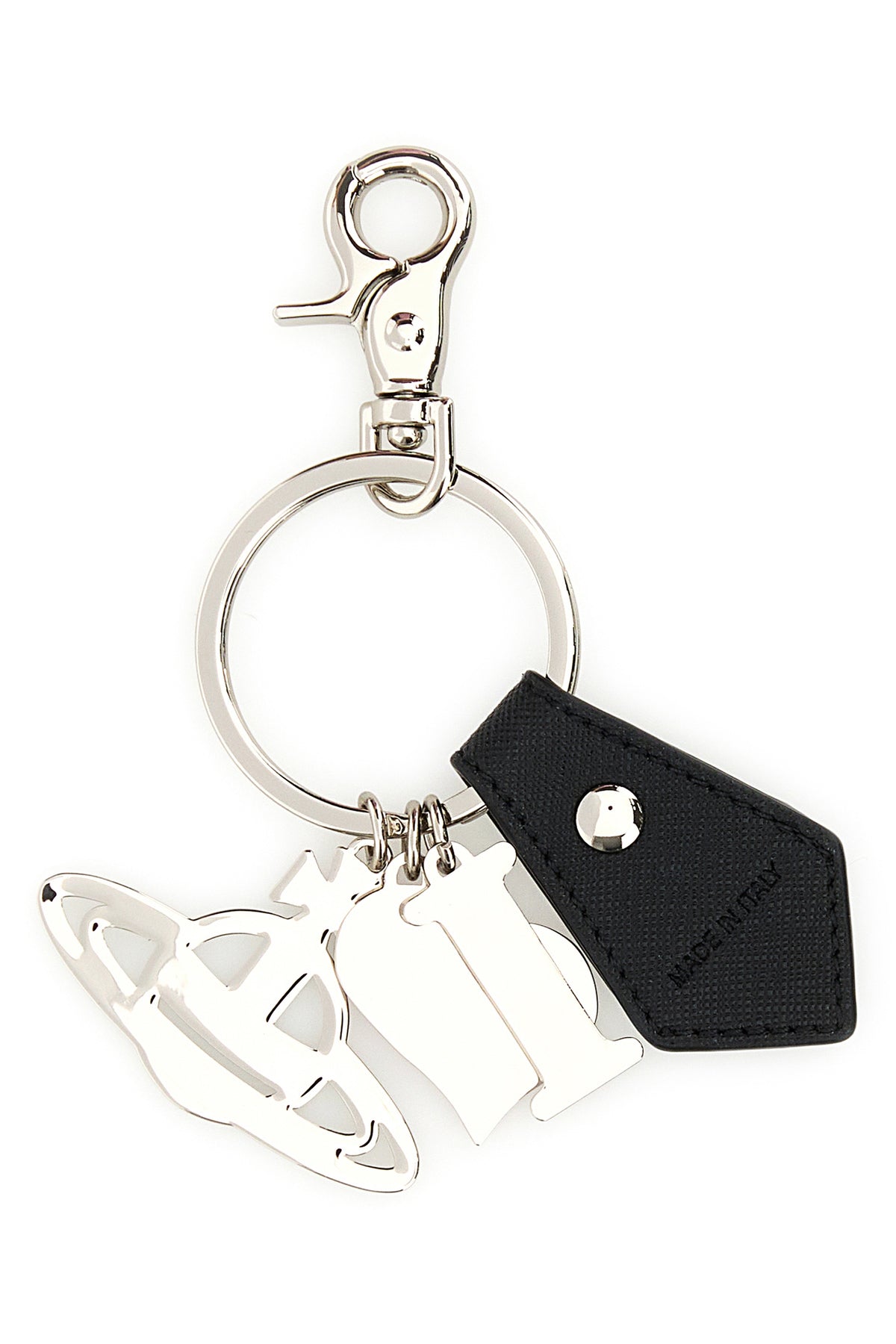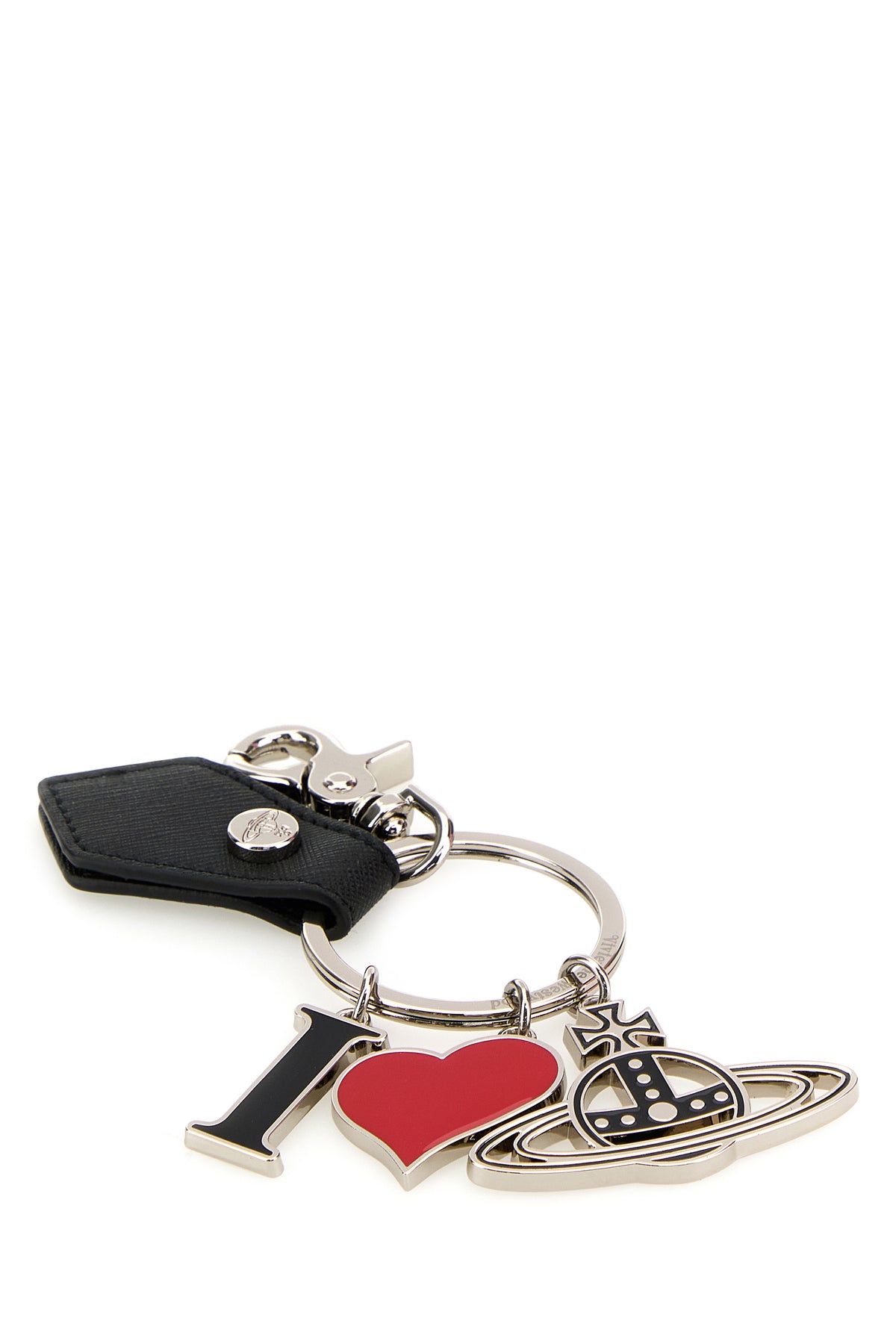 Keyring realized in metal enriched by metal I Love Orb charms and pebble synthetic leather detail.