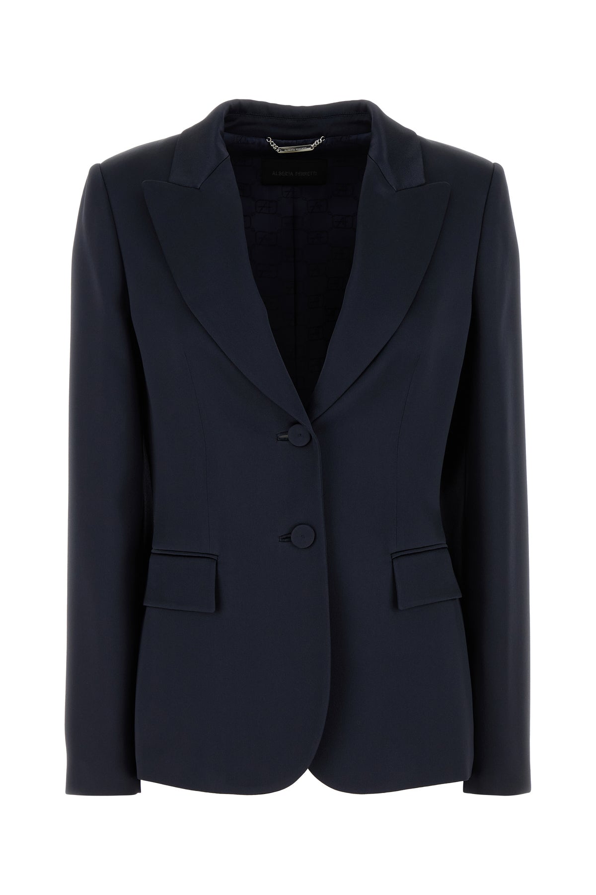 Blazer realized in acetate blend characterized by peak lapels.