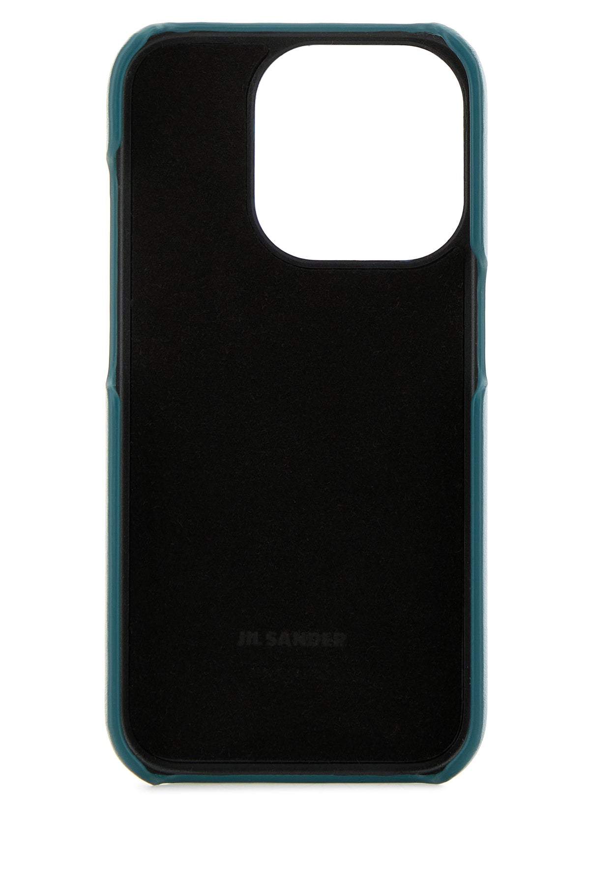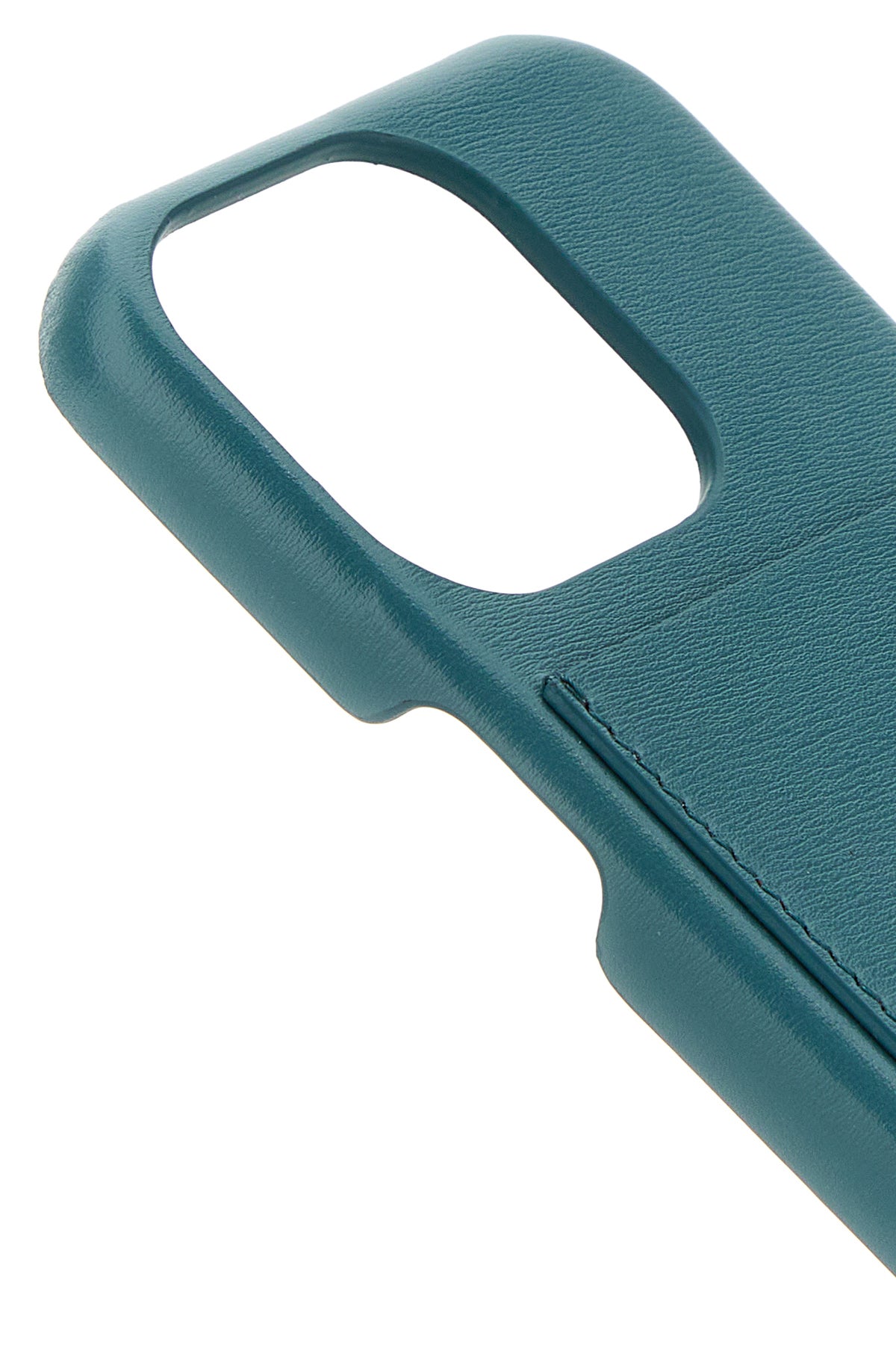 iPhone 15 Pro cover realized in leather characterized by laminated printed logo at the back.