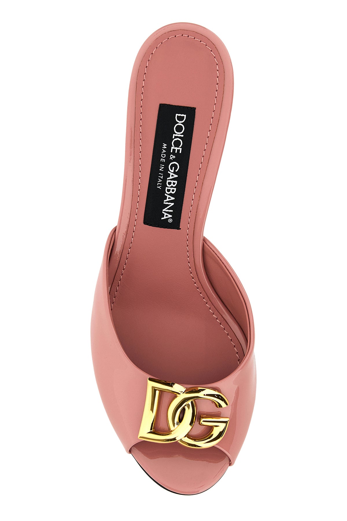 Pumps realized in patent calf leather enriched by metal DG detail at the front.