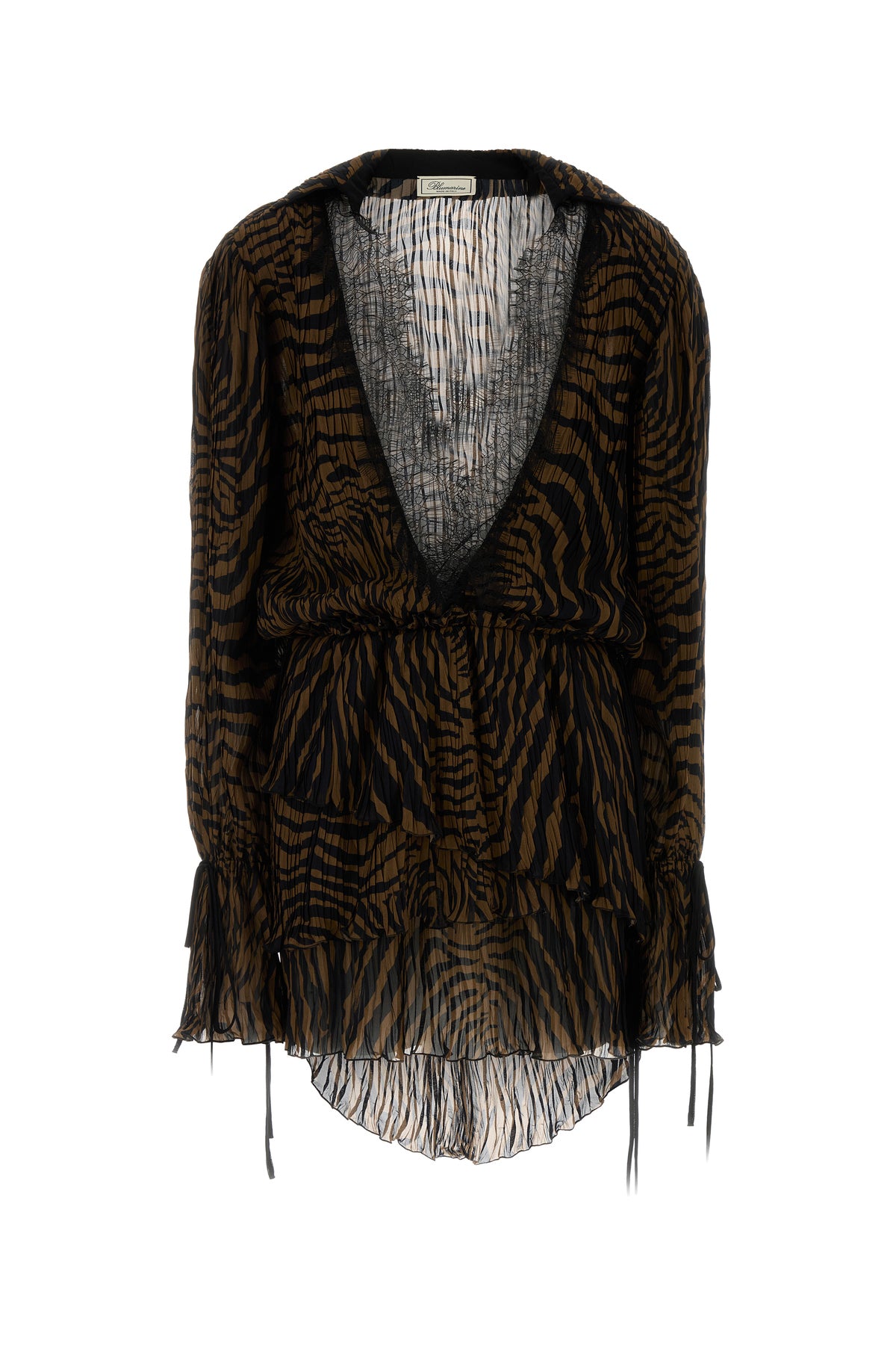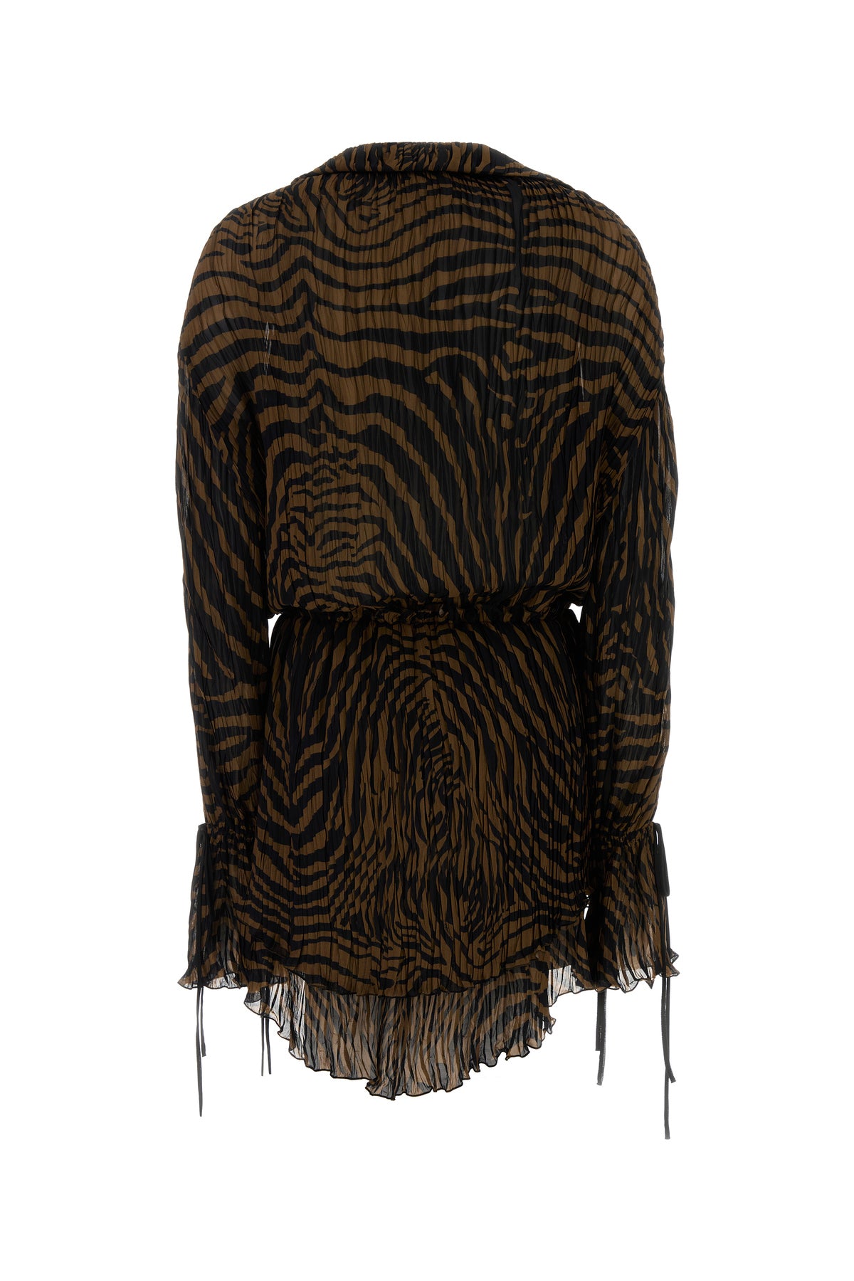 Mini dress realized in pleated viscose chiffon with lace inserts characterized by Zebra print on the entire surface.
