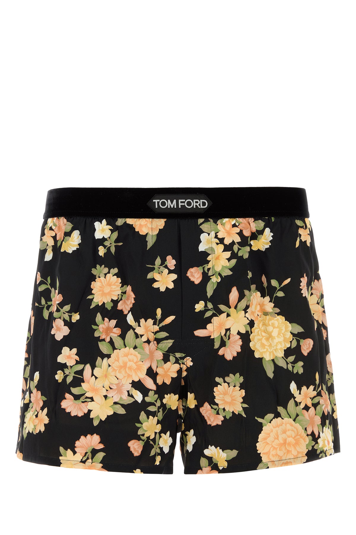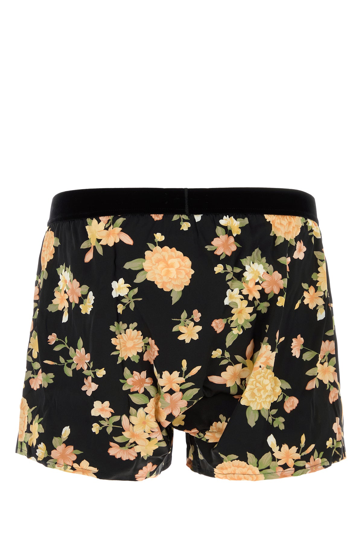 Boxer realized in stretch silk satin characterized by floral motif print on the entire surface enriched by logoed patch at the front.