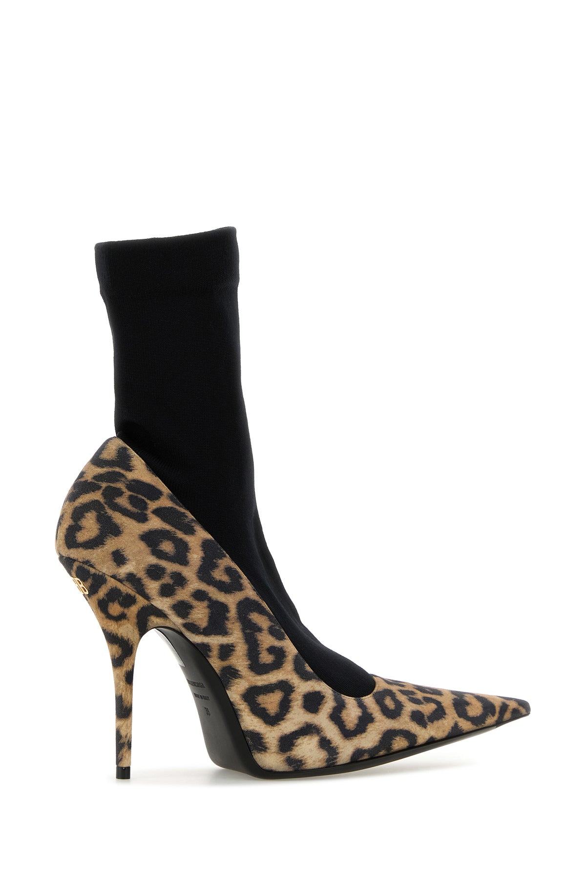 Pumps realized in suede with built-in sock characterized by leopard-motif print on the entire surface enriched by metal BB detail at the back.