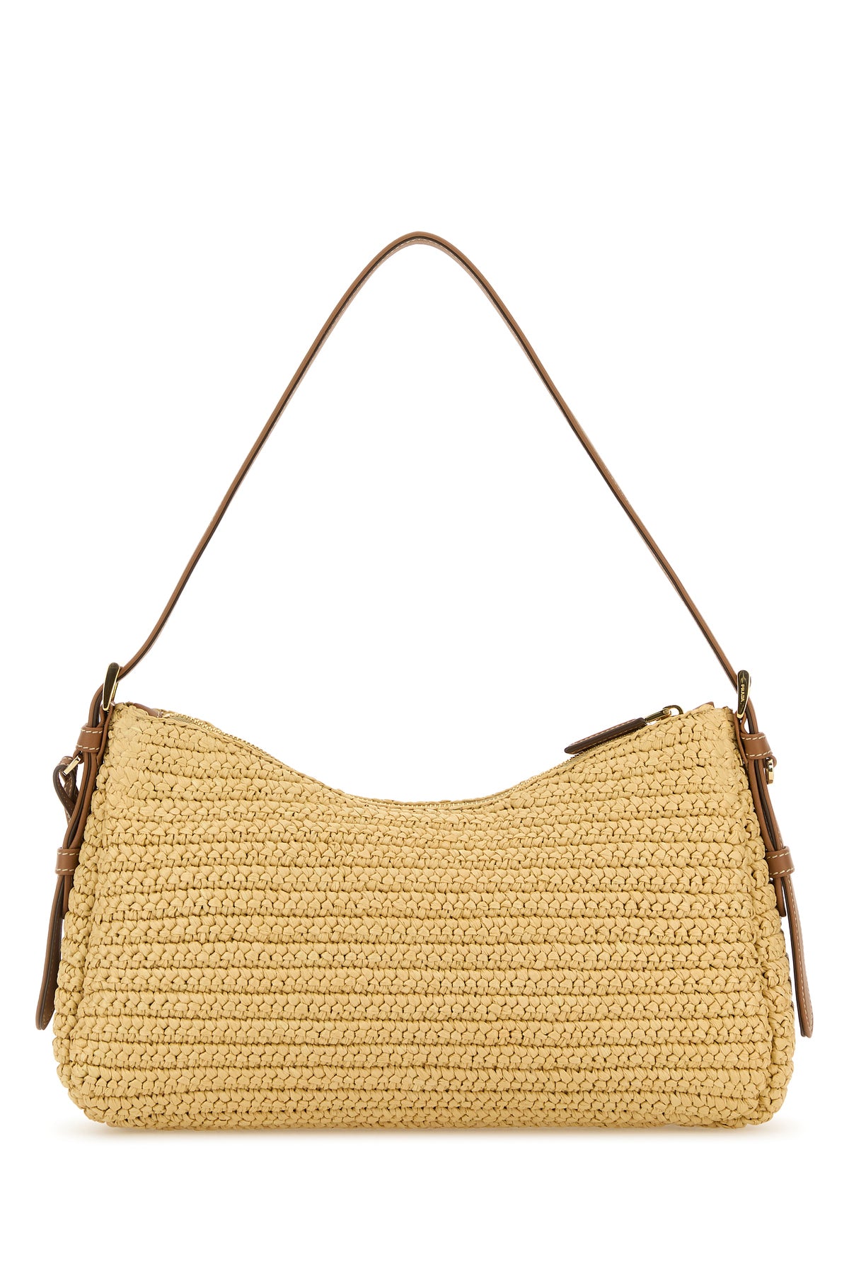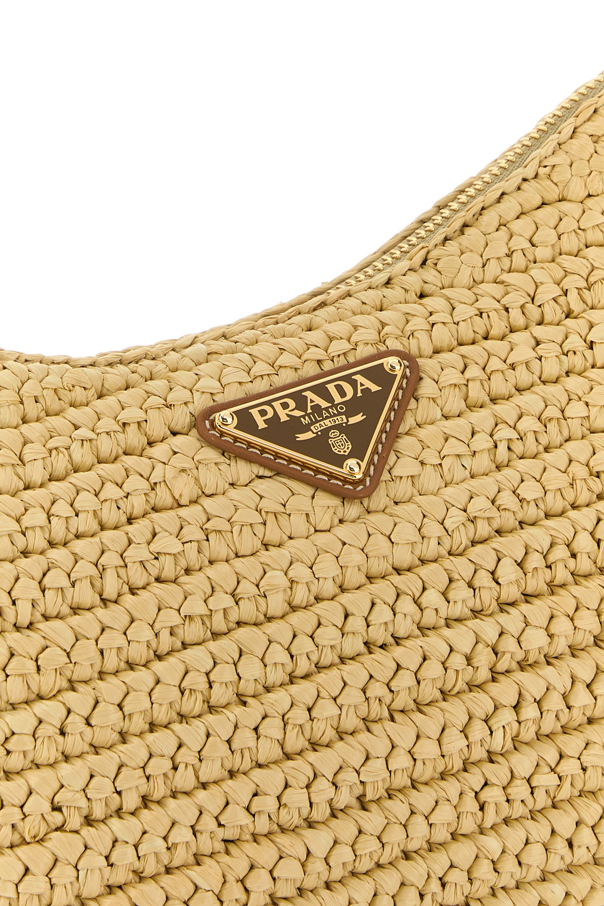 Shoulder bag realized in raffia enriched by iconic logoed metal triangle at the front.