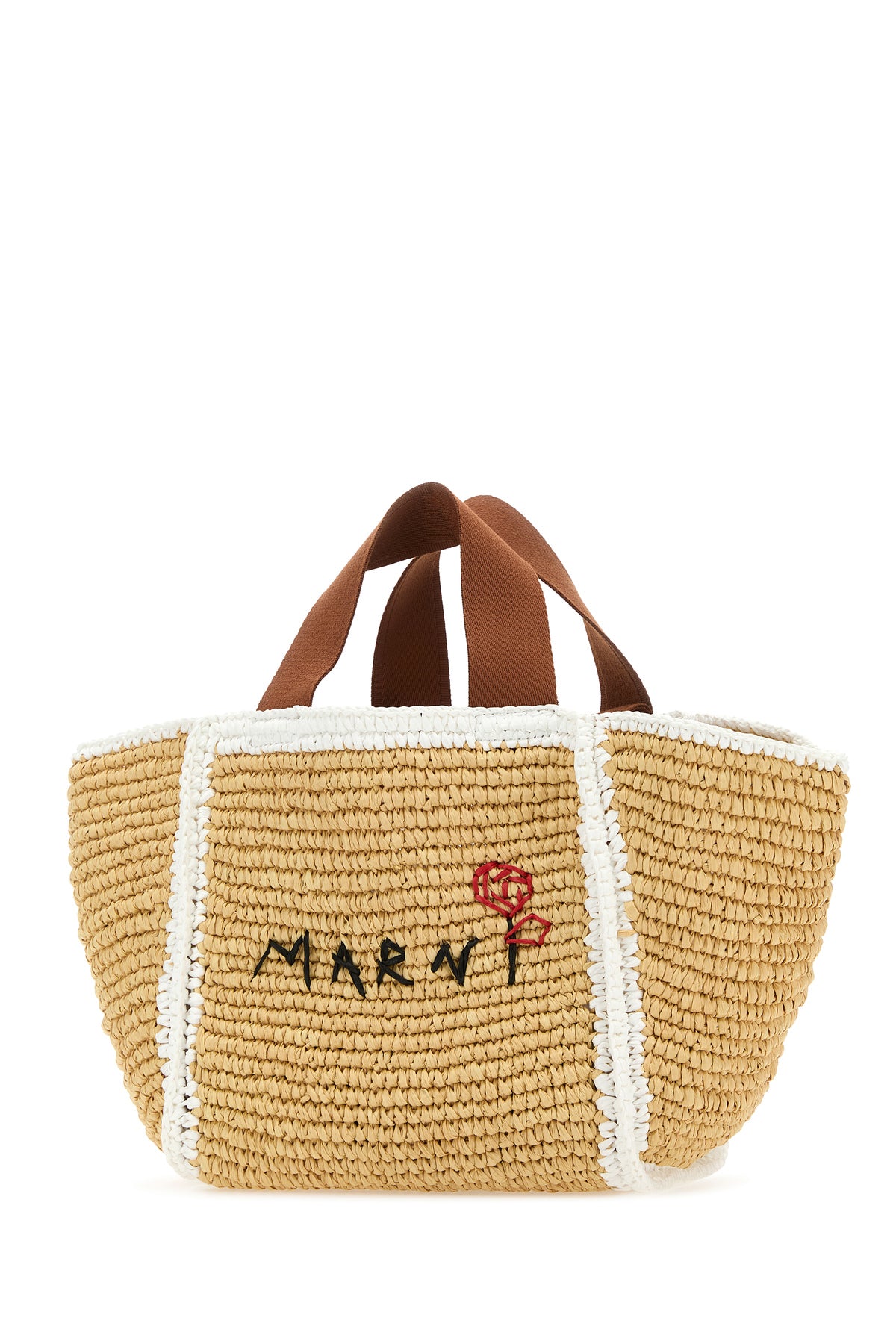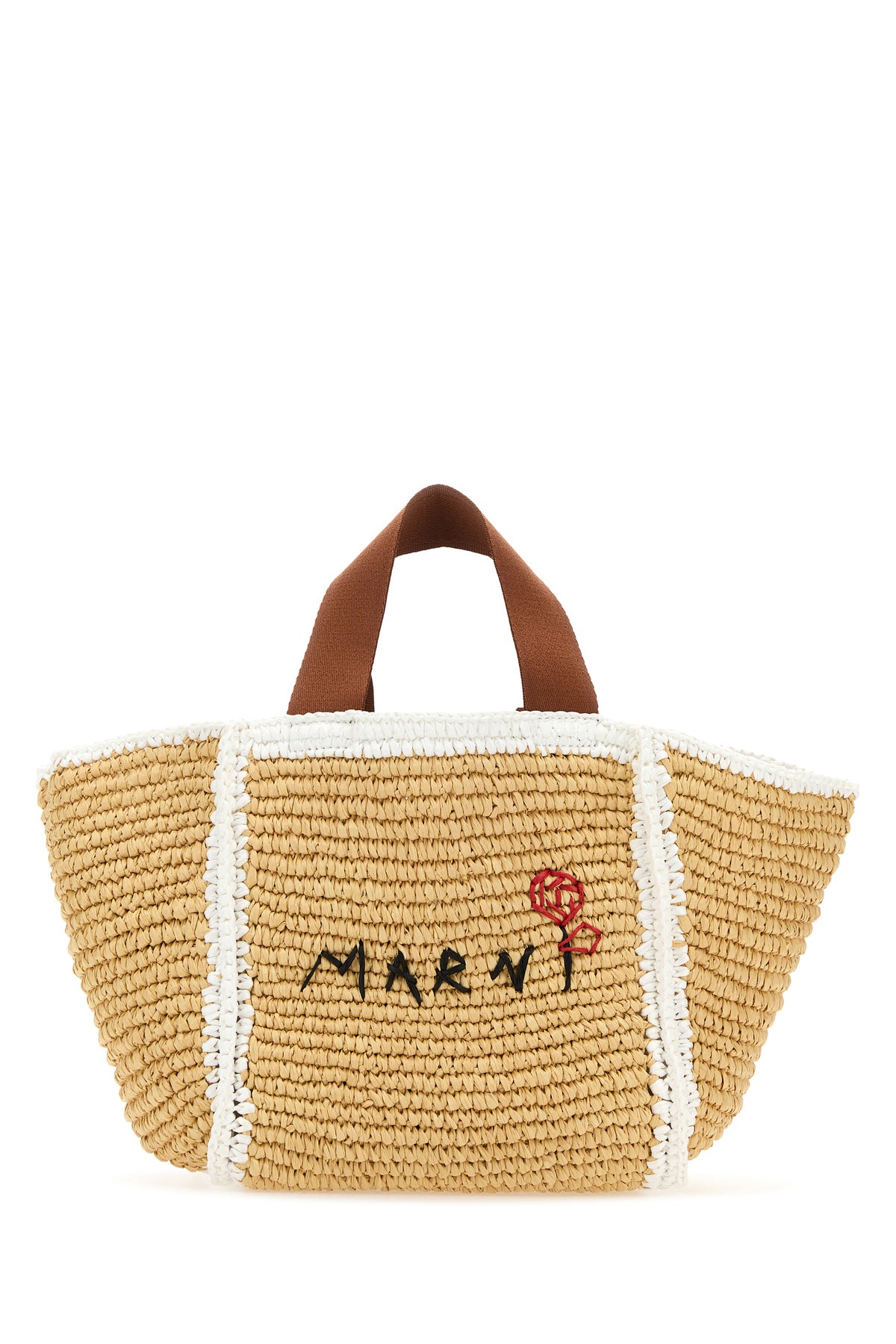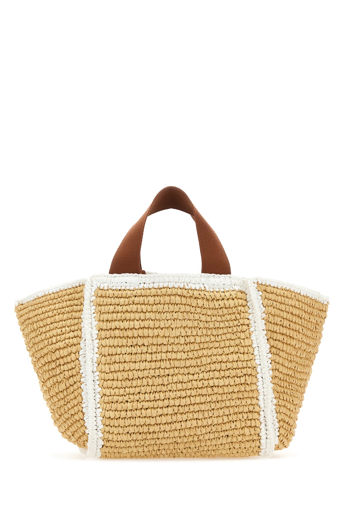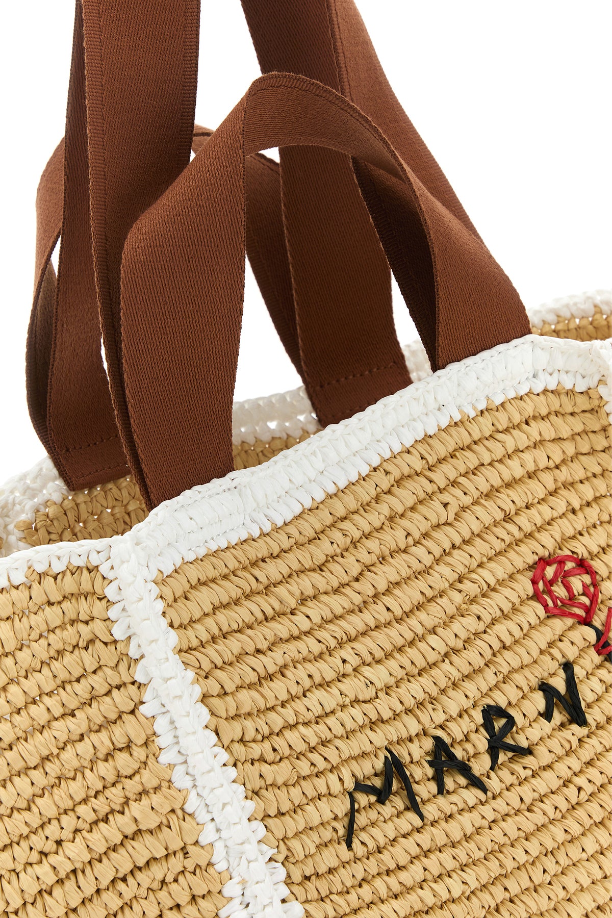 Shopping bag realized in woven raffia with contrasting trimmings characterized by contrasting logoed embroidery at the front.