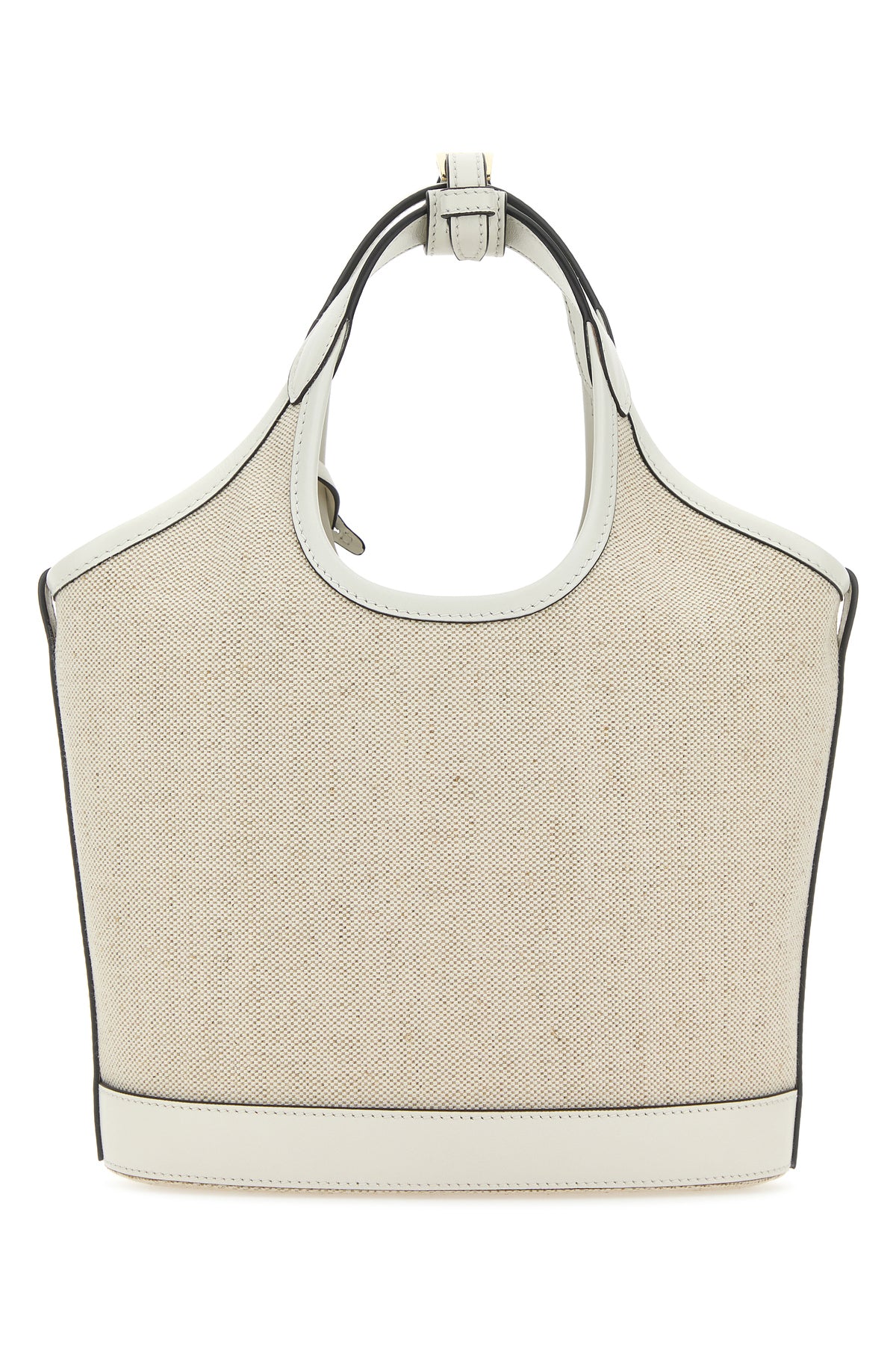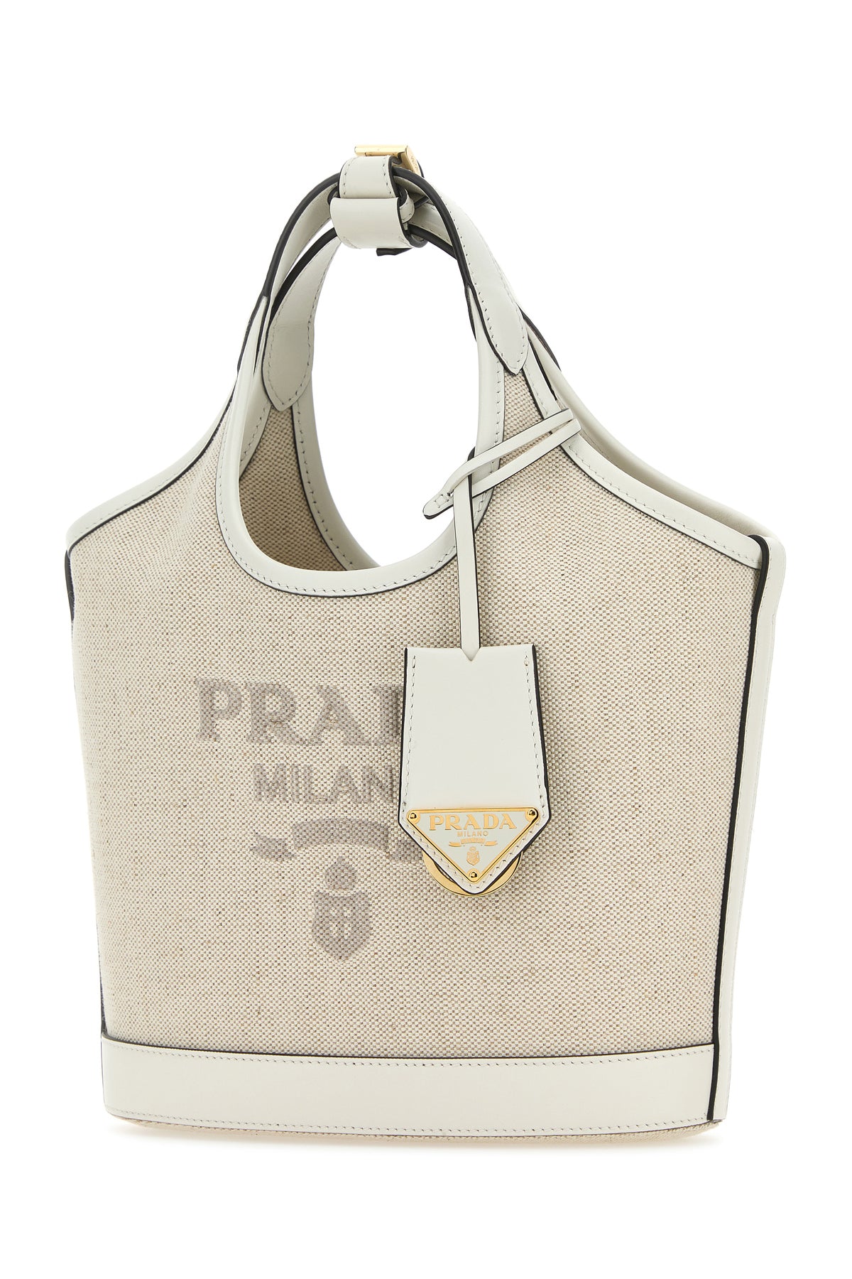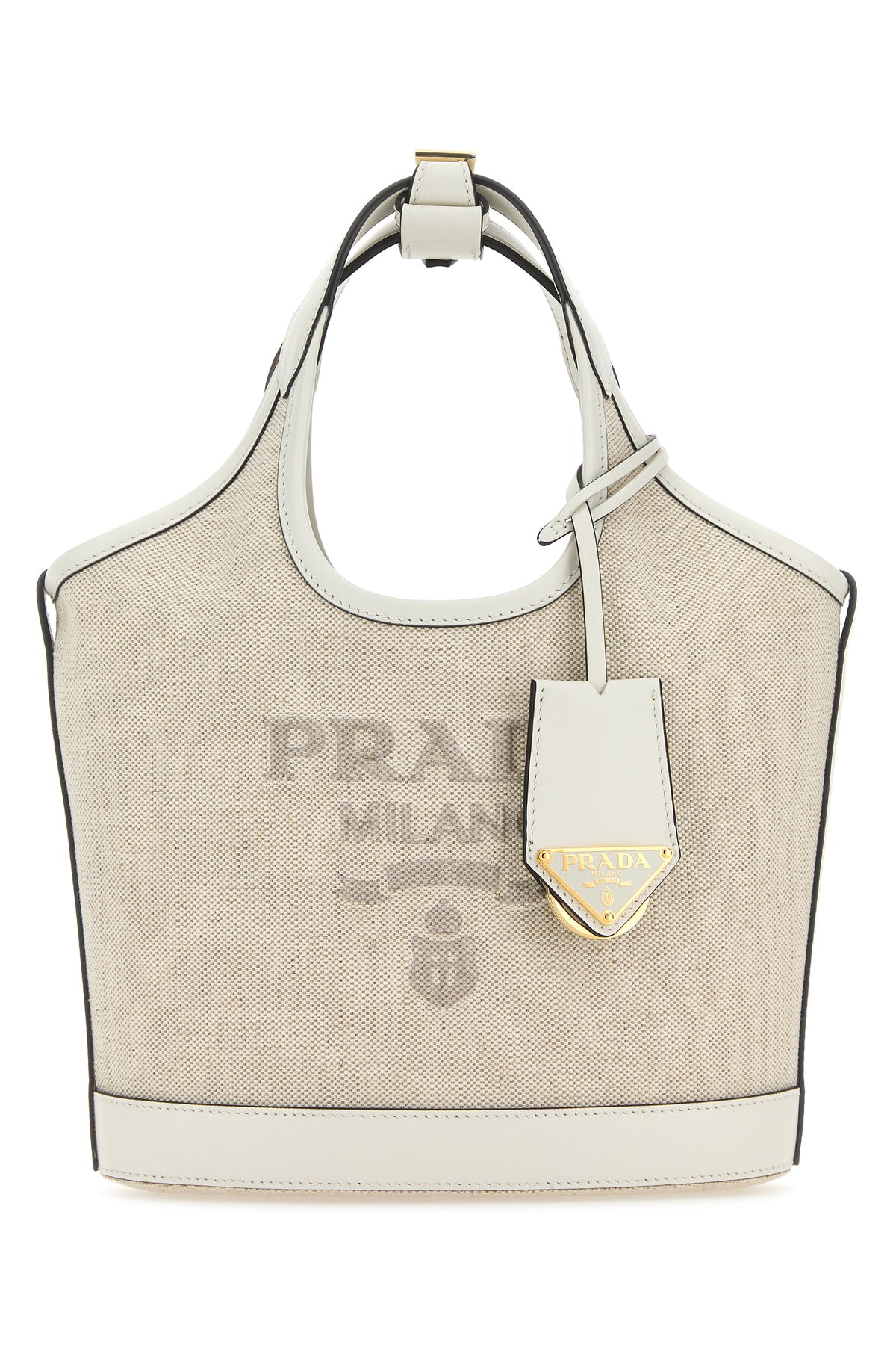 Handbag realized in pure linen canvas with contrasting leather inserts on the trimmings characterized by contrasting printed logo at the front enriched by detachable leather keyring accessory with iconic logoed metal triangle.