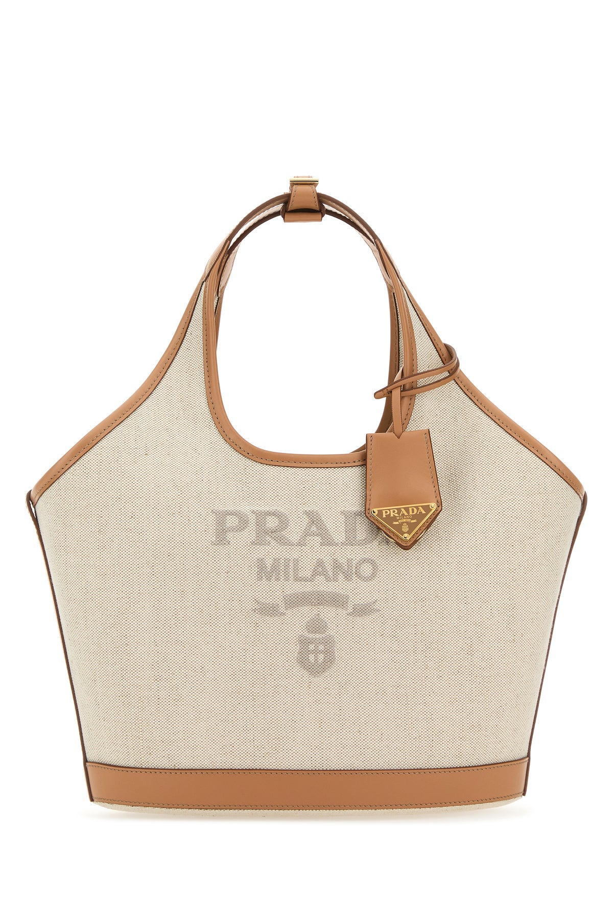Handbag realized in pure linen canvas with contrasting leather inserts on the trimmings characterized by contrasting printed logo at the front enriched by detachable leather keyring accessory with iconic logoed metal triangle.