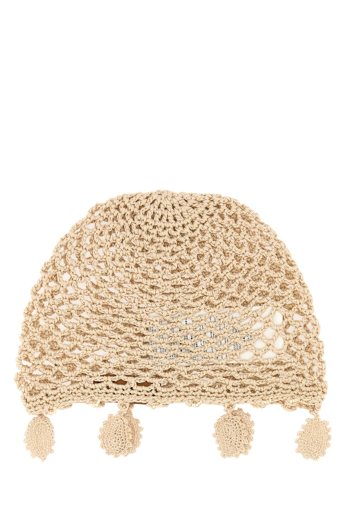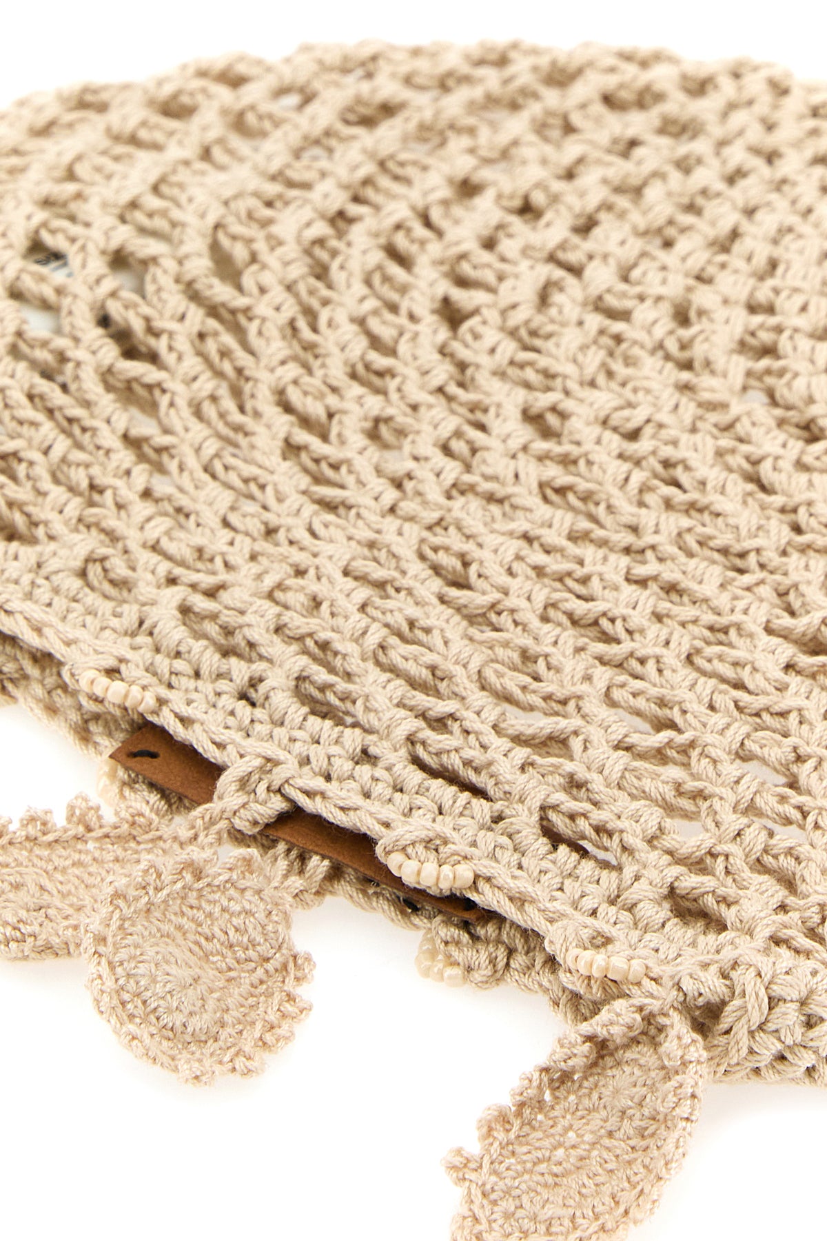 Hat realized in pure cotton crochet characterized by tonal peculiar embellishments on the hemline.