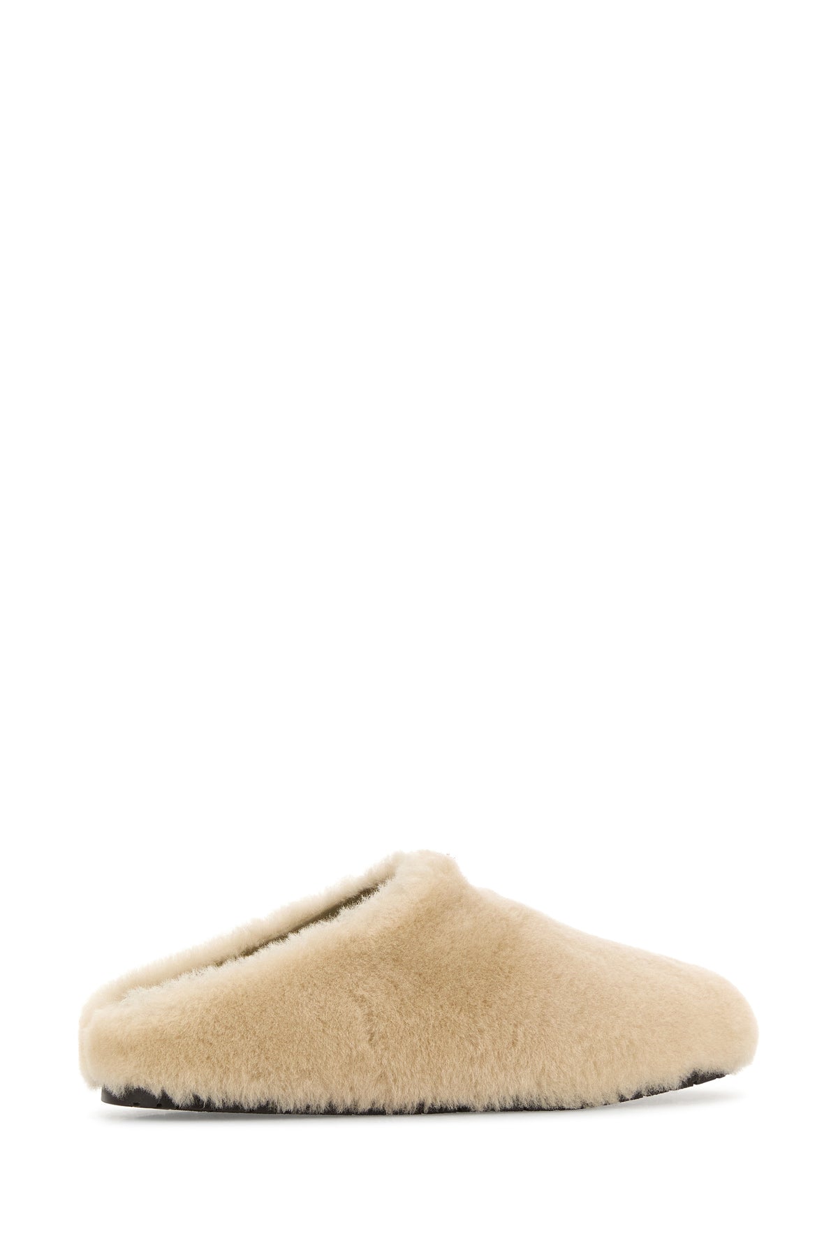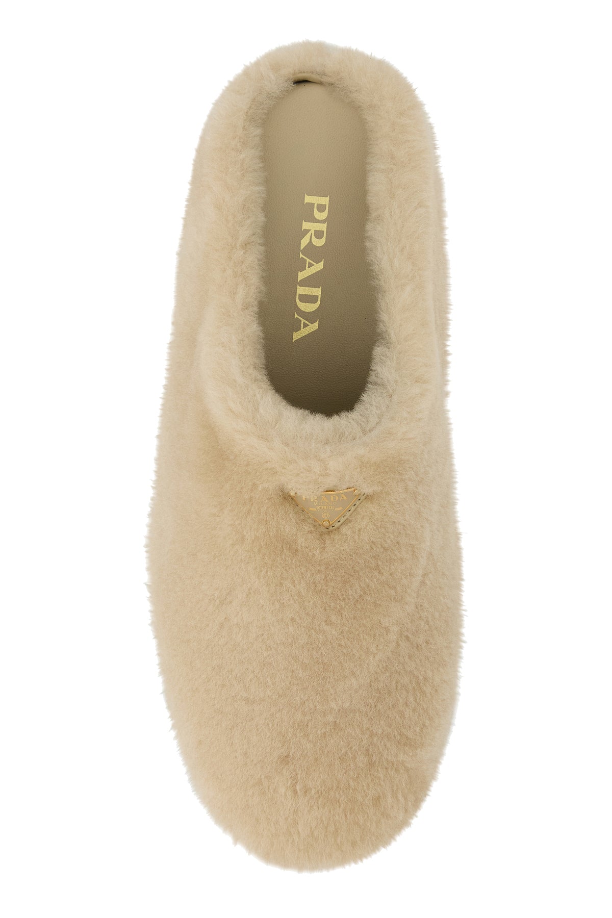 Slippers realized in shearling enriched by iconic logoed metal triangle on the instep.