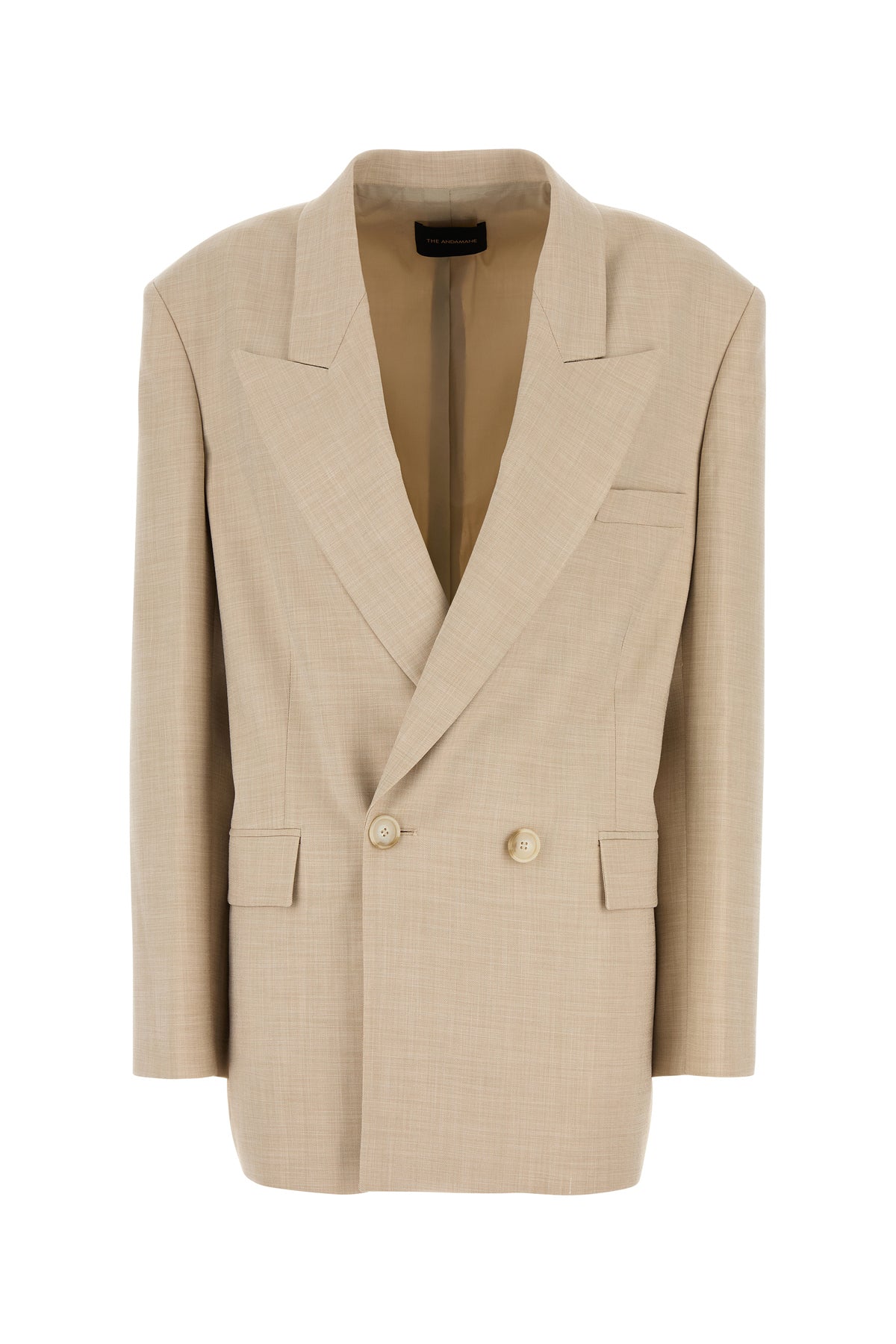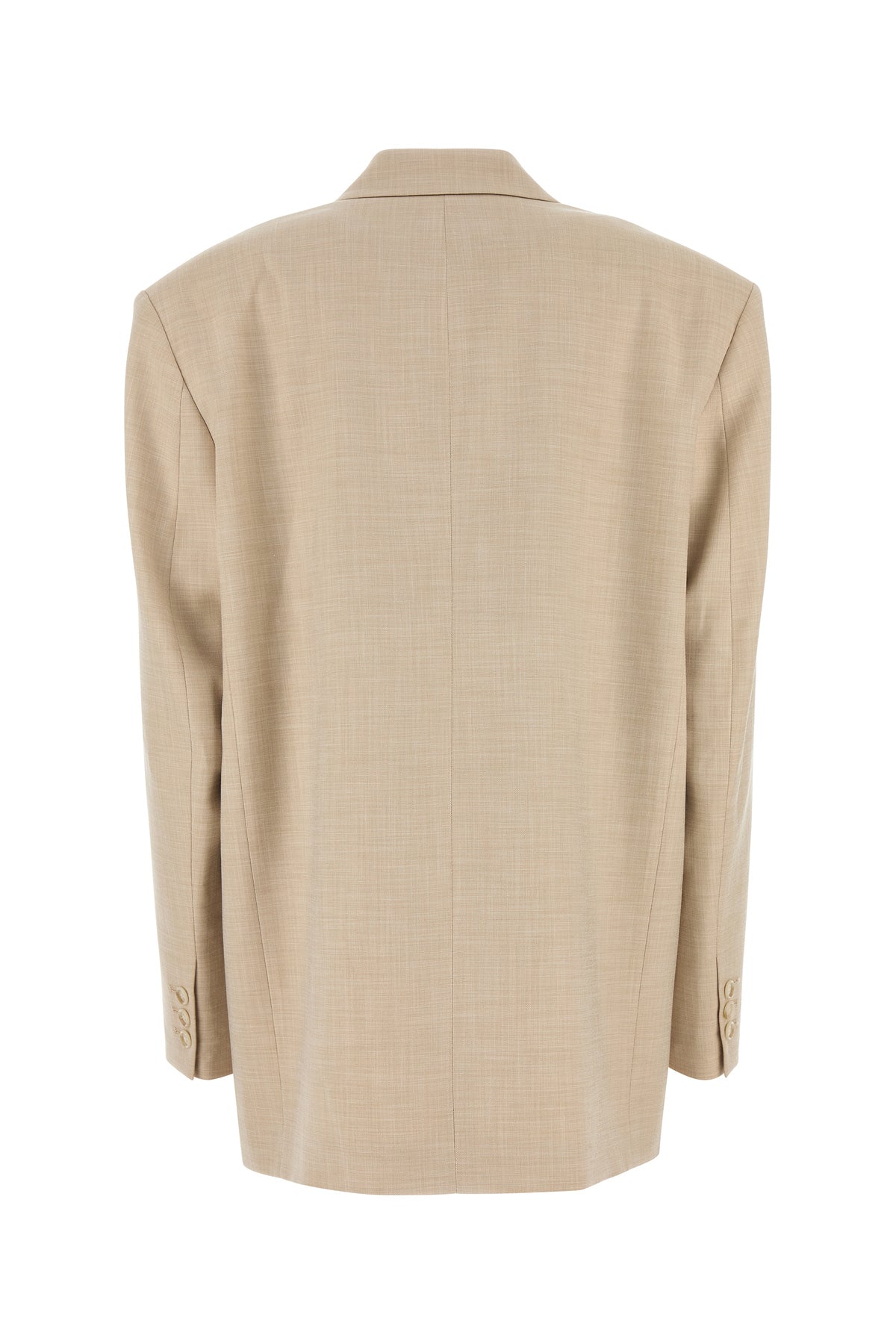 Oversize blazer realized in stretch polyester blend characterized by peak lapels.