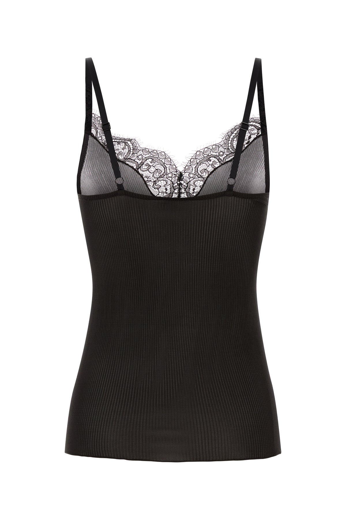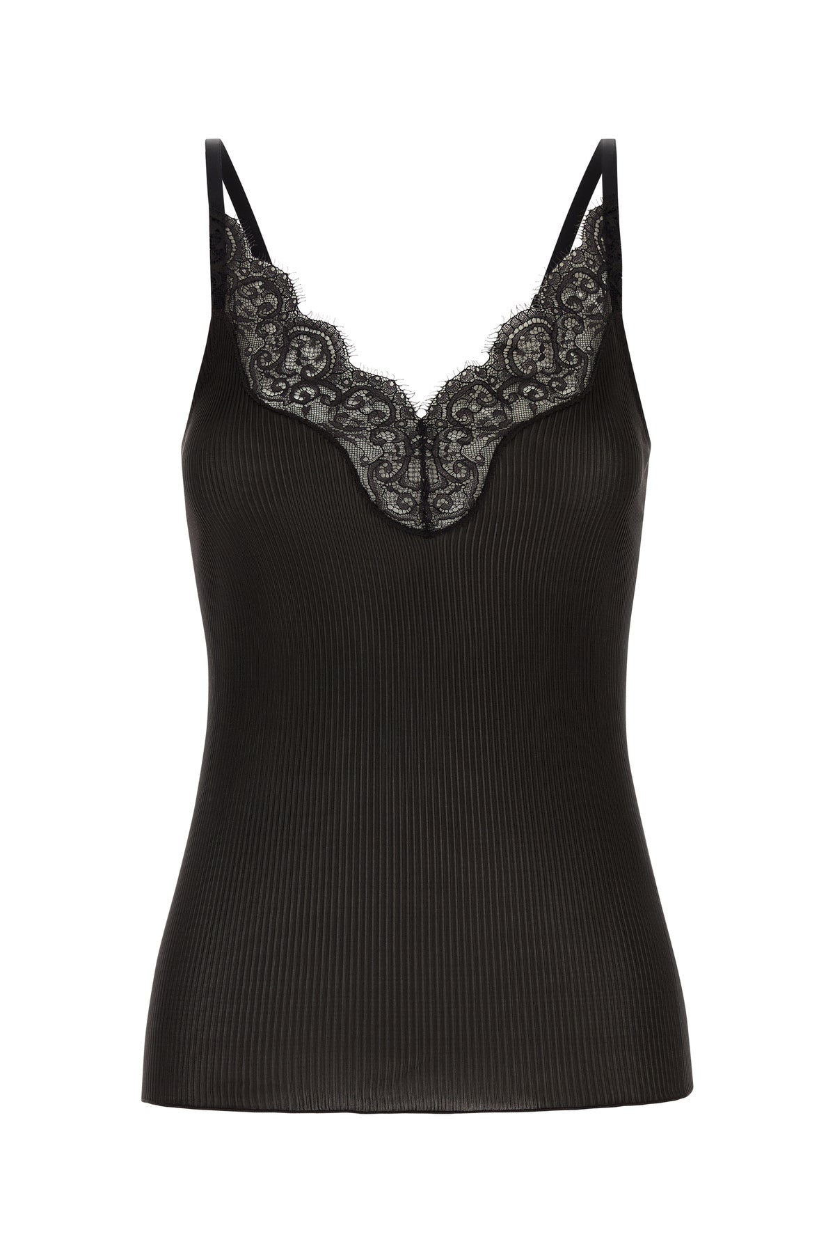 Fitted tank top realized in ribbed pure silk enriched by lace insert on the neckline.