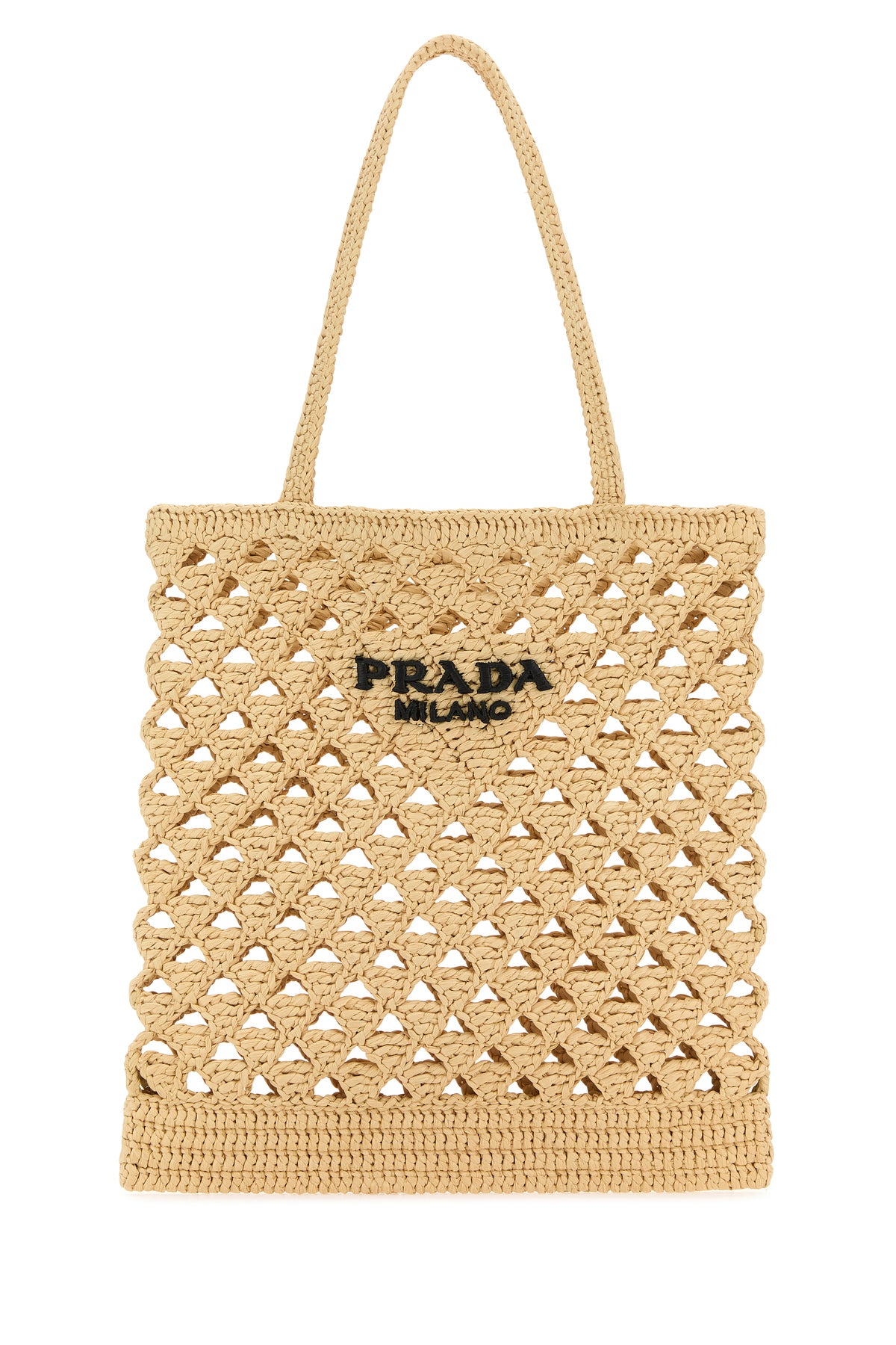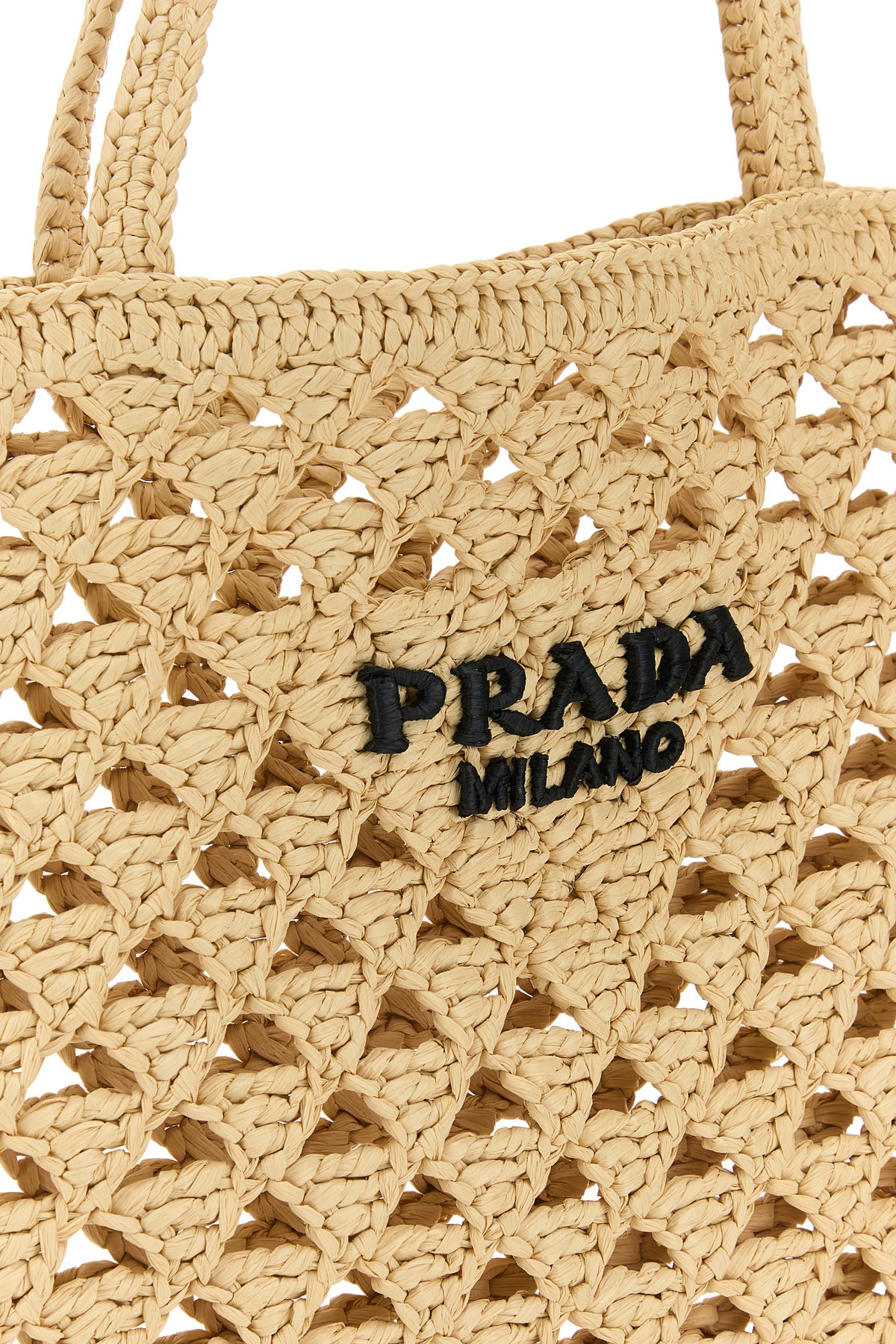 Handbag realized in woven straw characterized by contrasting logoed embroidery at the front.