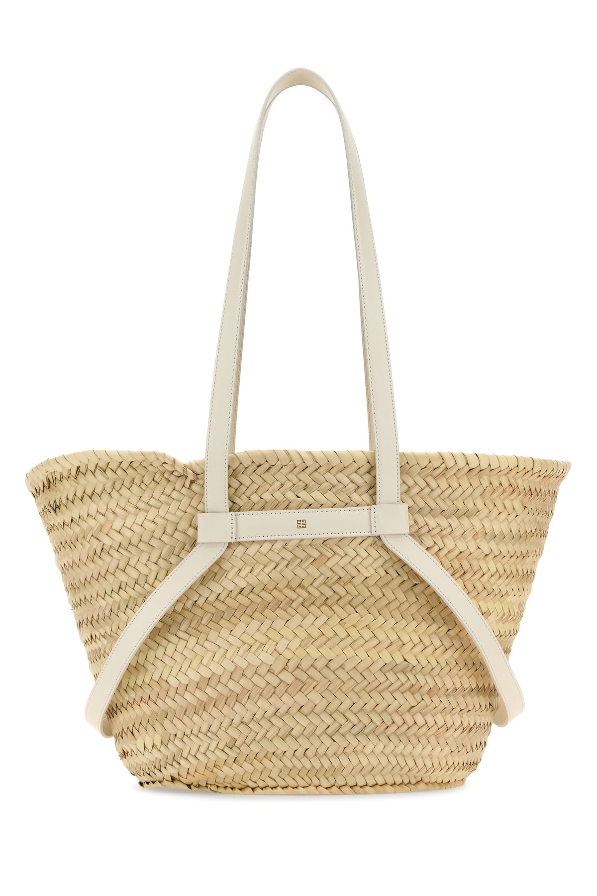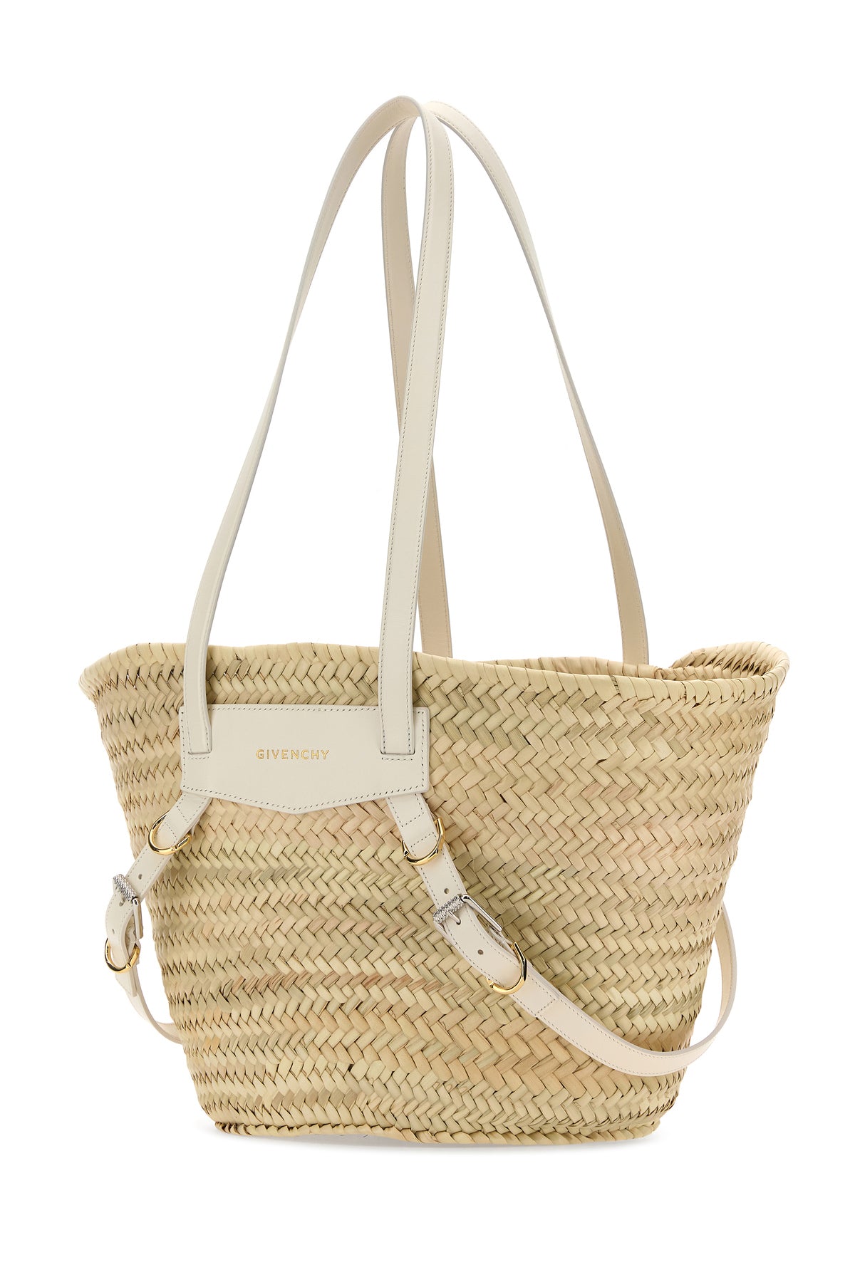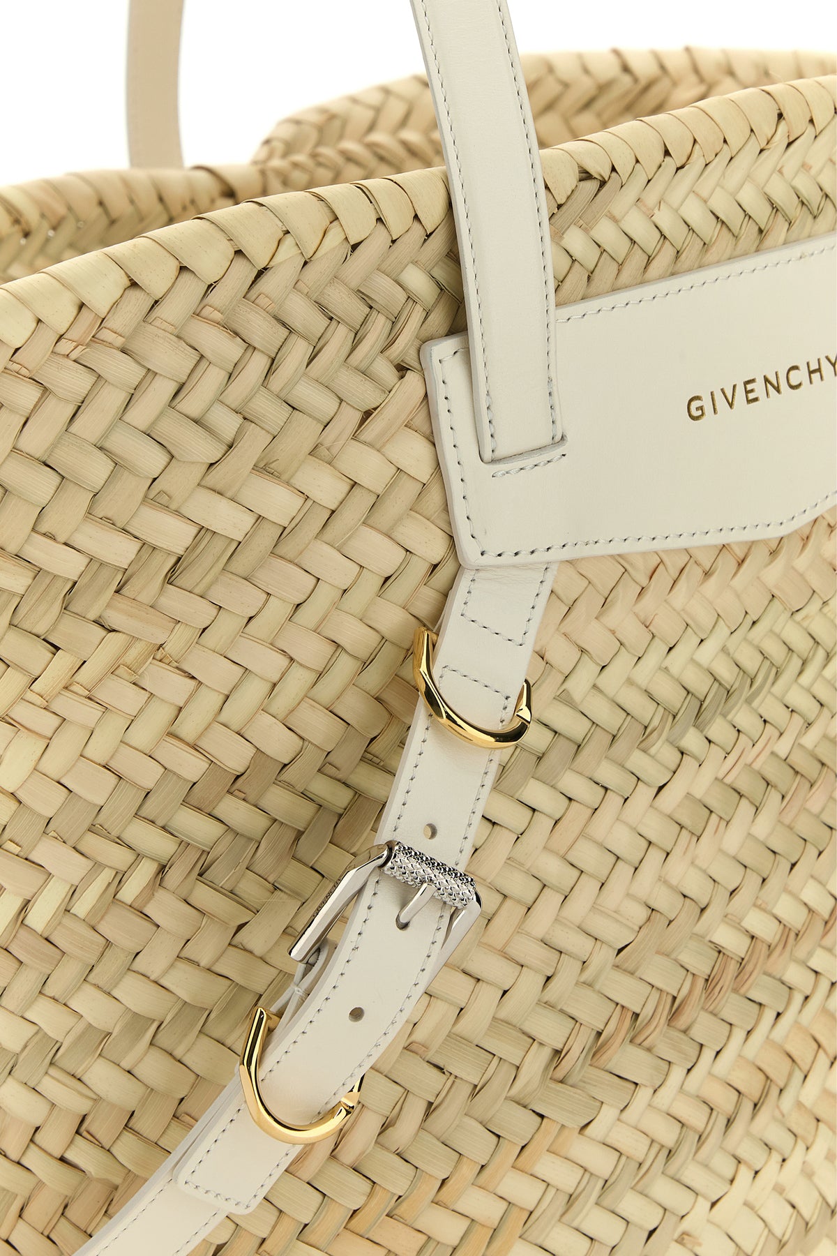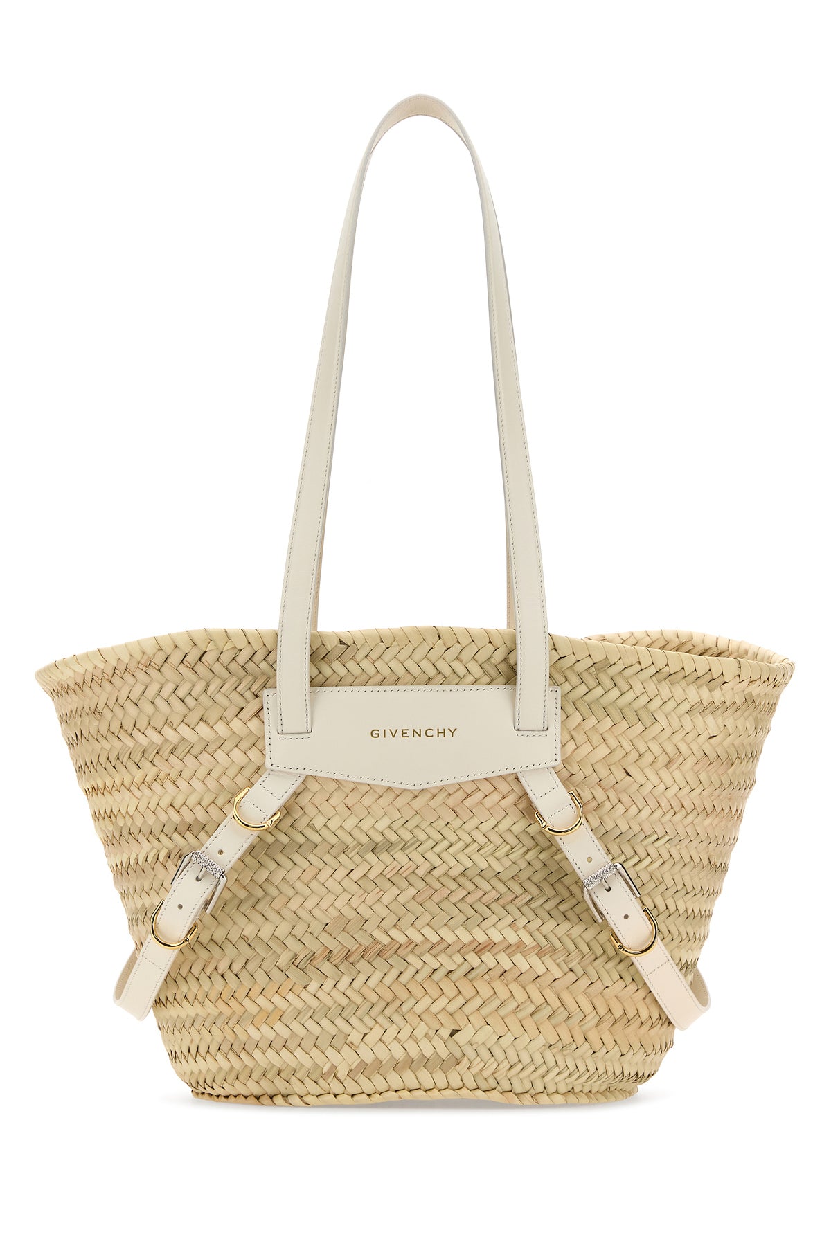Shopping bag realized in woven straw enriched by leather logoed patch and decorative straps with metal buckles at the front.