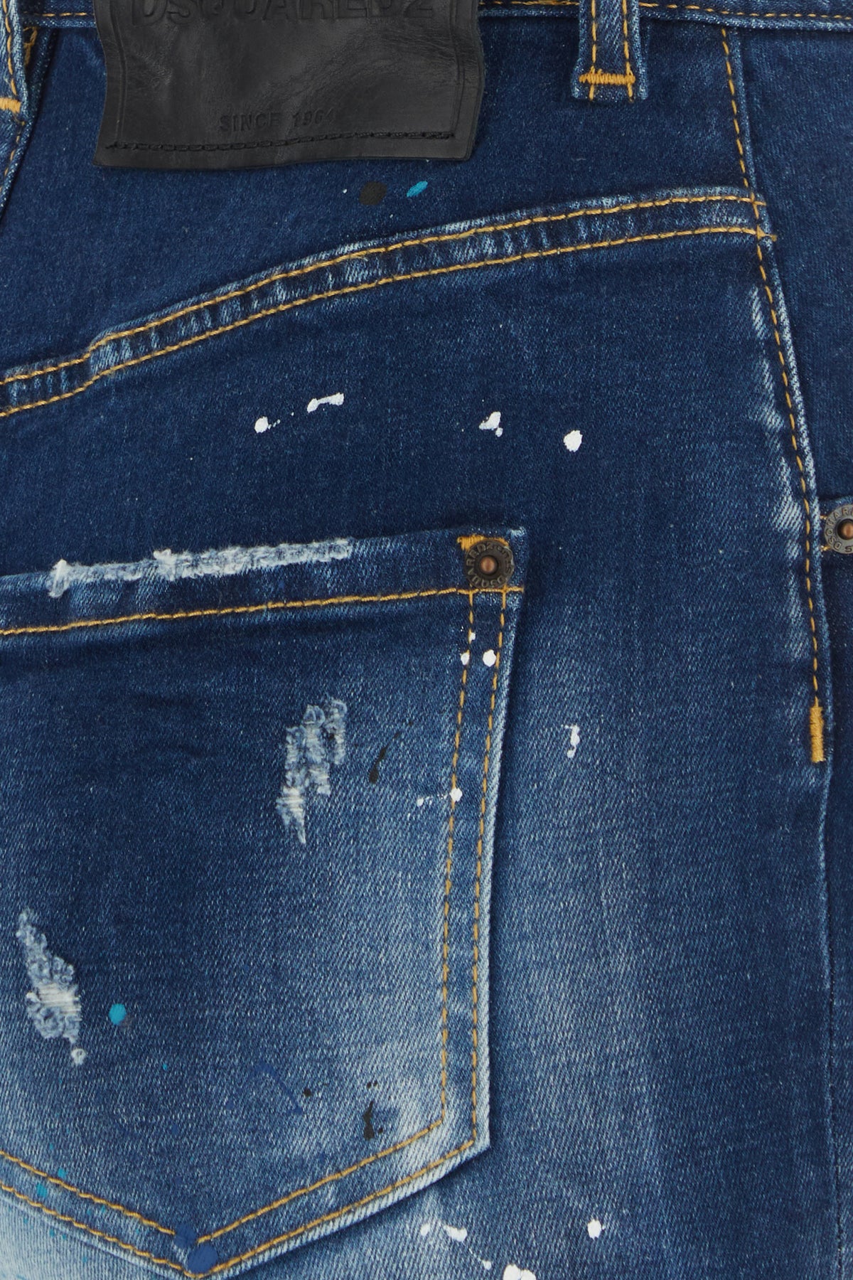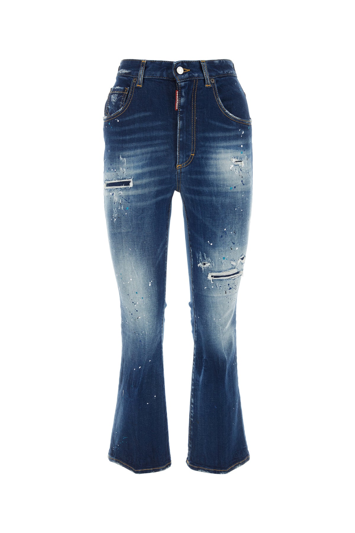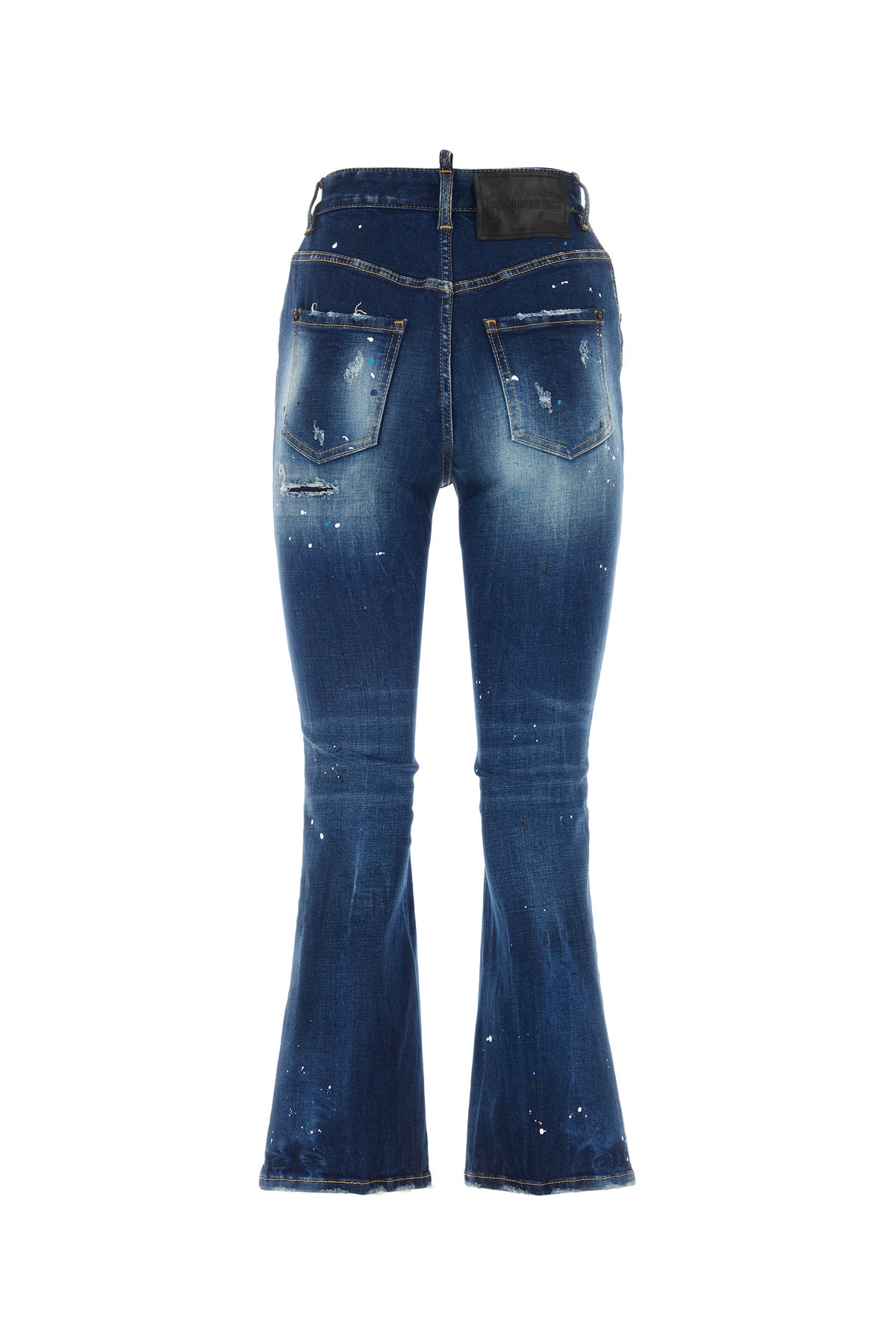 Jeans realized in stonewashed stretch cotton denim with intentional rips and dirties enriched by leather logoed label at the back.
