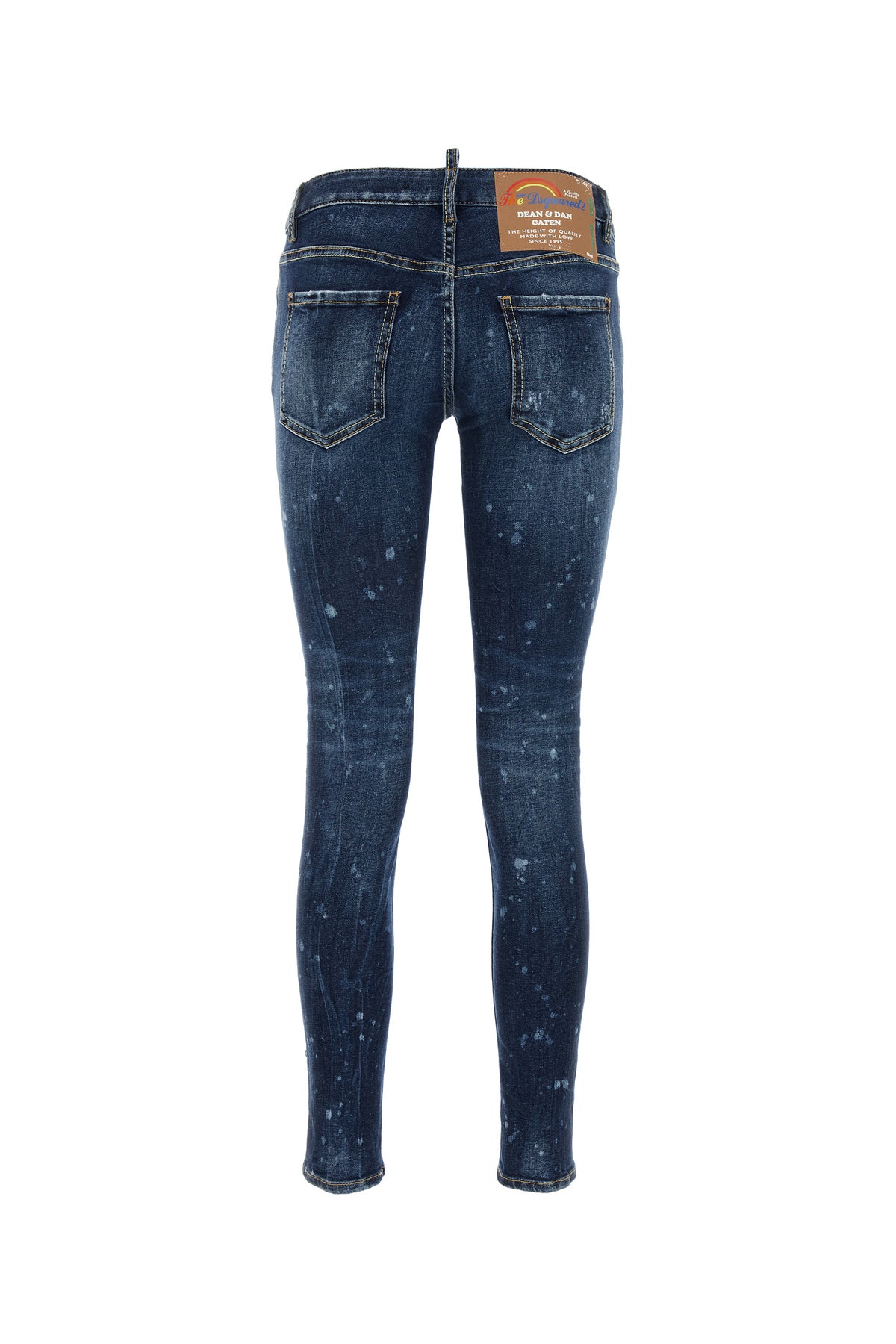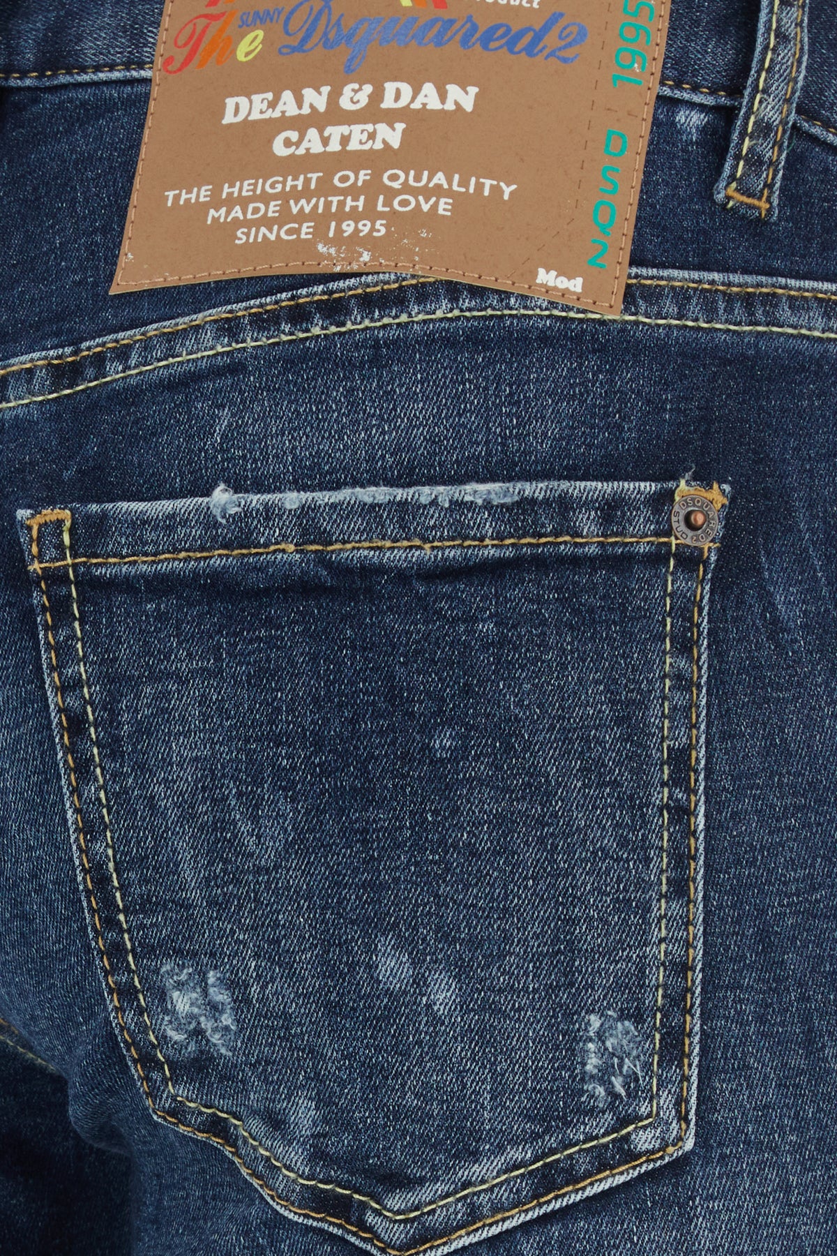 Jeans realized in distressed-effect slightly stonewashed stretch cotton denim with intentional dirties on the entire surface enriched by contrasting logoed label at the front and at the back.